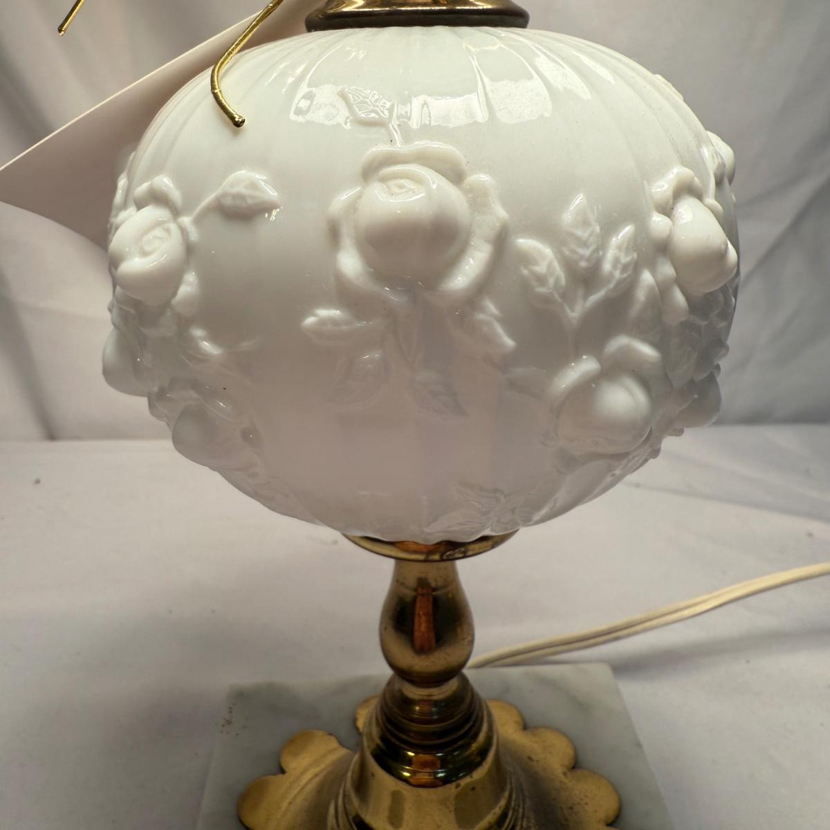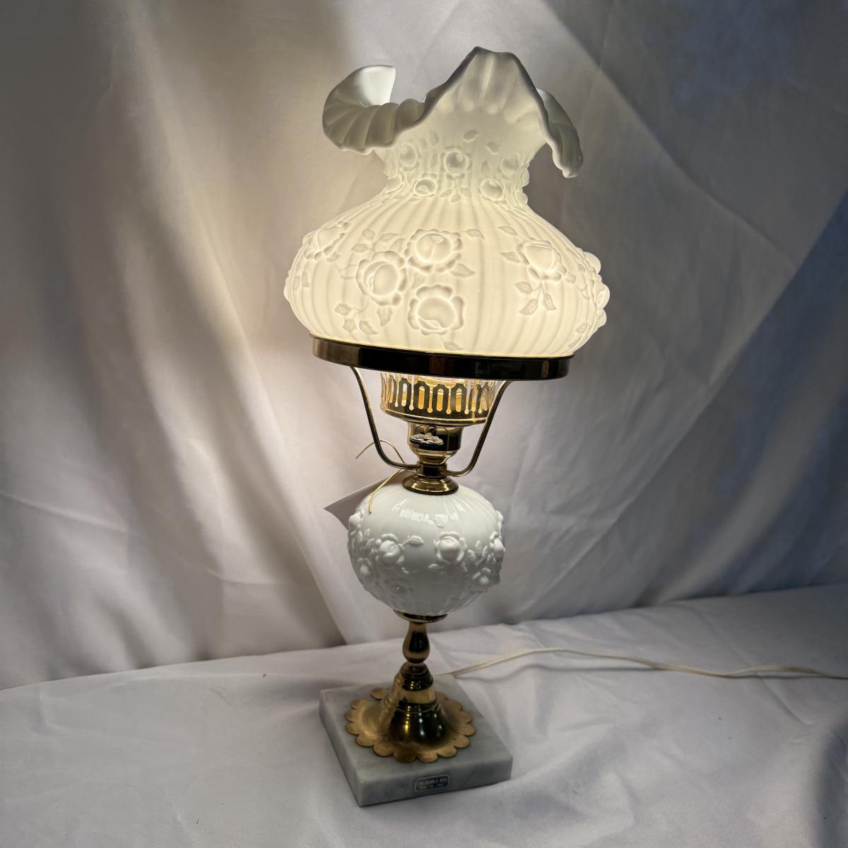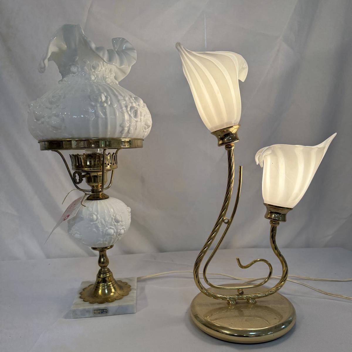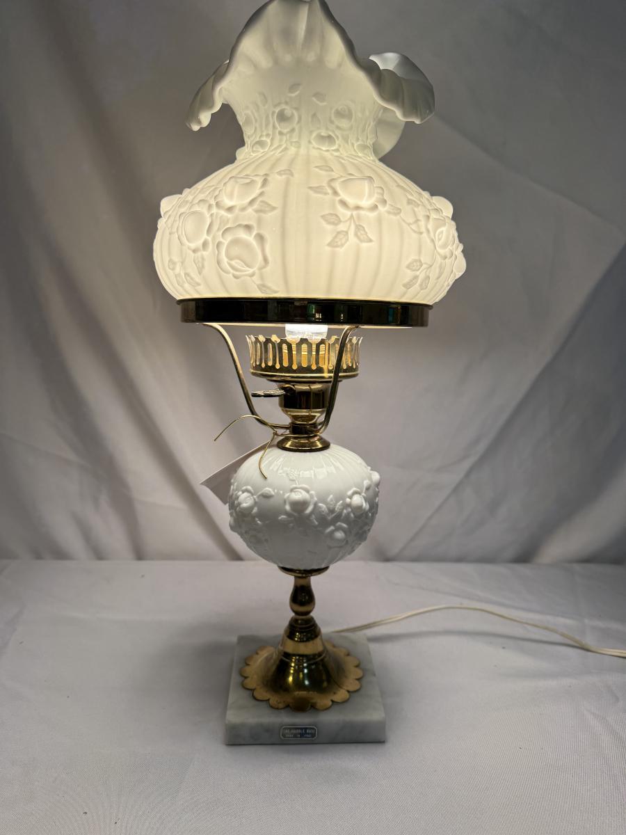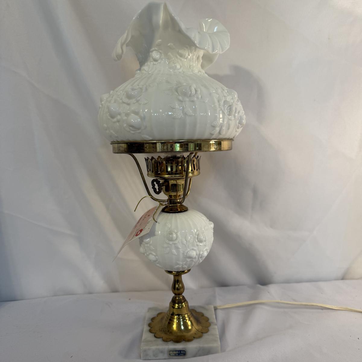 This lot contains two lamps. The first appears to be a Fenton poppy milk glass lamp with a marble base. This item measures 4.5” x 4.5” at the base and stands 19.25”H, this is a one way switch lamp and turns on via a key on the side. Next is a lilly inspired gold and white glass lamp, this is also a one way switch and turns on via a switch on the cord. Both lamps do turn on. This lamp measures 7”D at the base and stands 18”H. Shipping available.