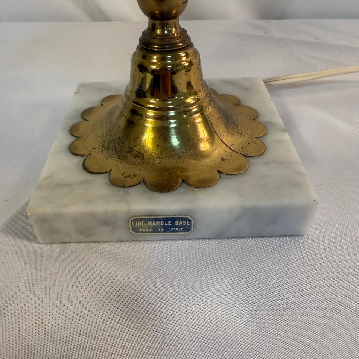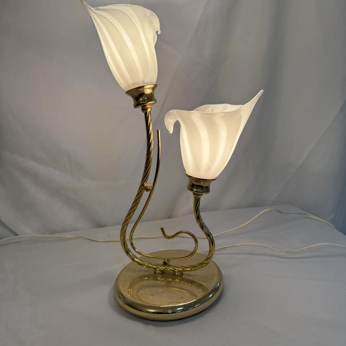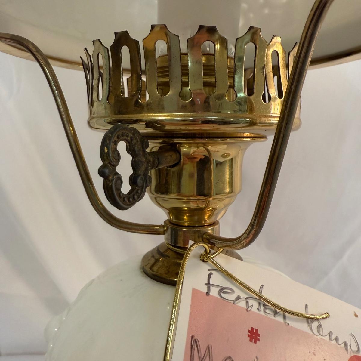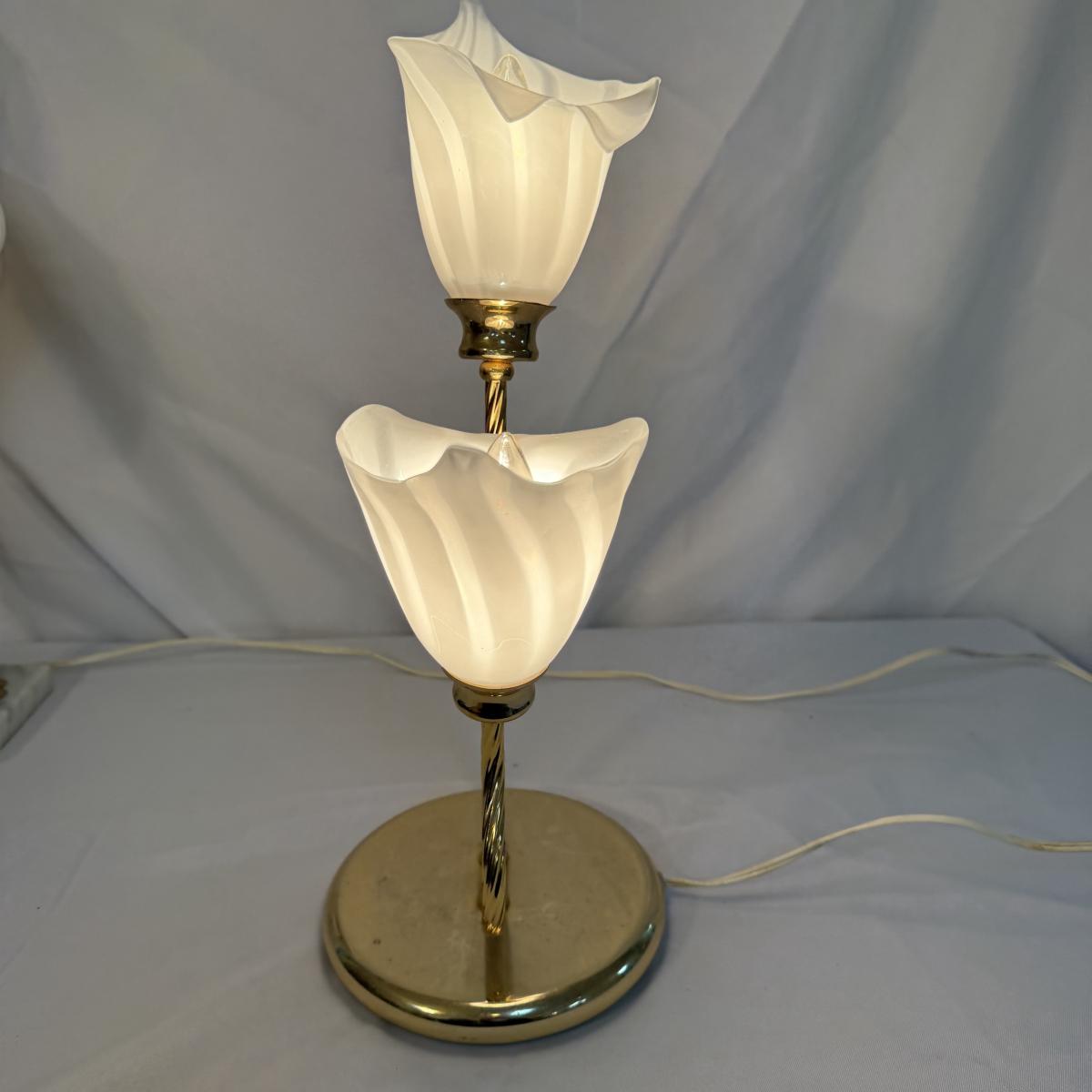 This lot contains two lamps. The first appears to be a Fenton poppy milk glass lamp with a marble base. This item measures 4.5” x 4.5” at the base and stands 19.25”H, this is a one way switch lamp and turns on via a key on the side. Next is a lilly inspired gold and white glass lamp, this is also a one way switch and turns on via a switch on the cord. Both lamps do turn on. This lamp measures 7”D at the base and stands 18”H. Shipping available.