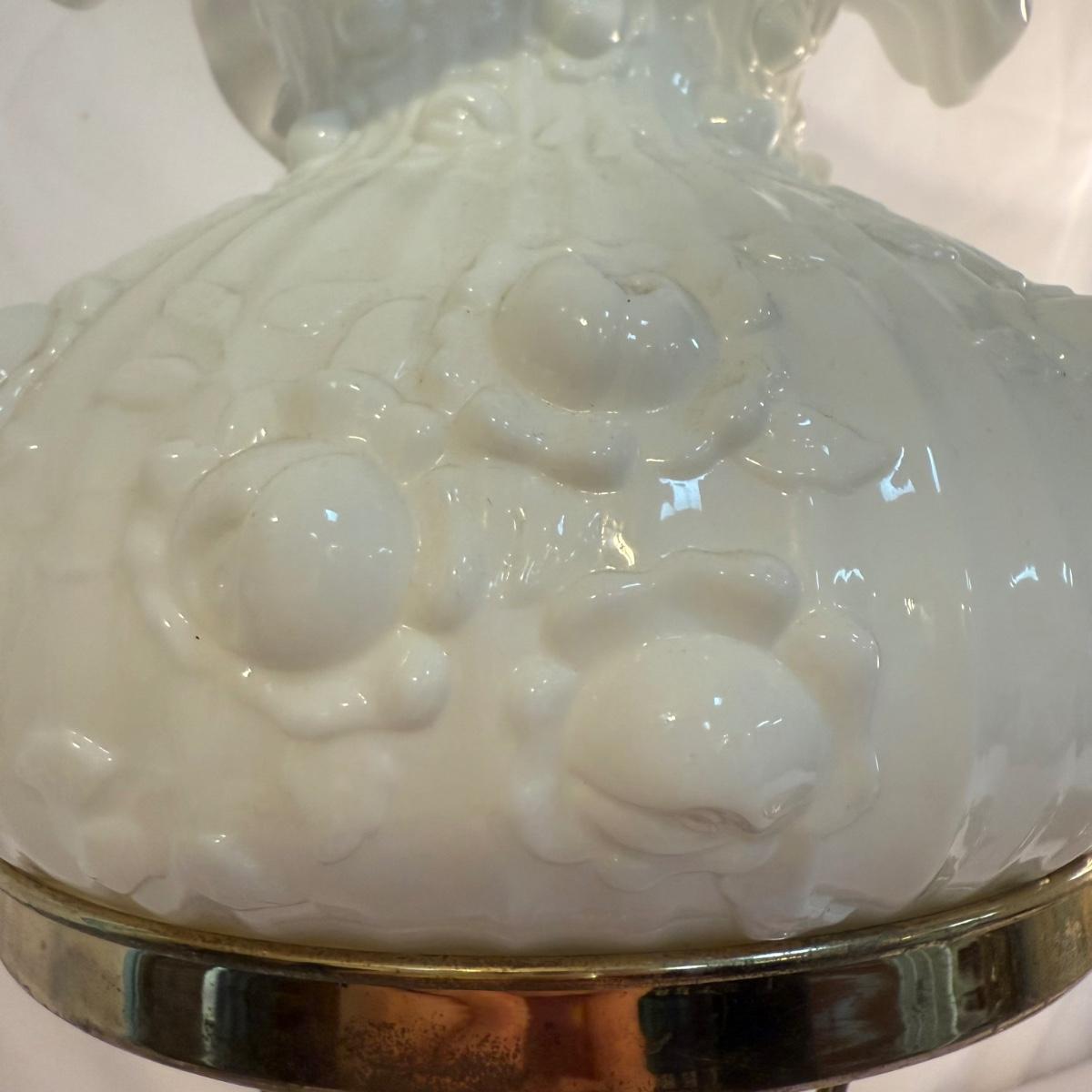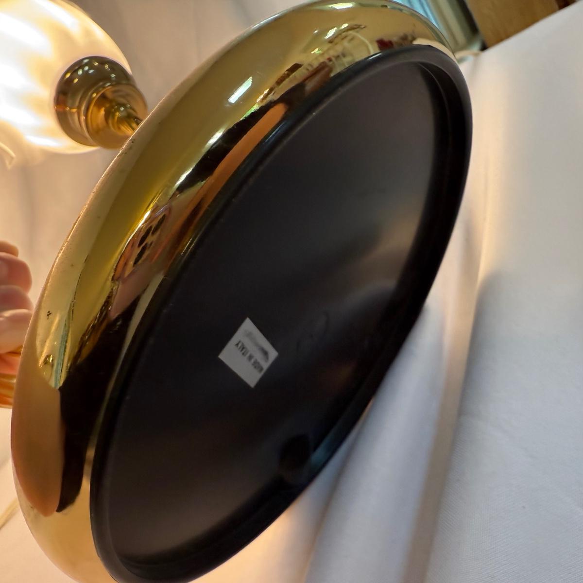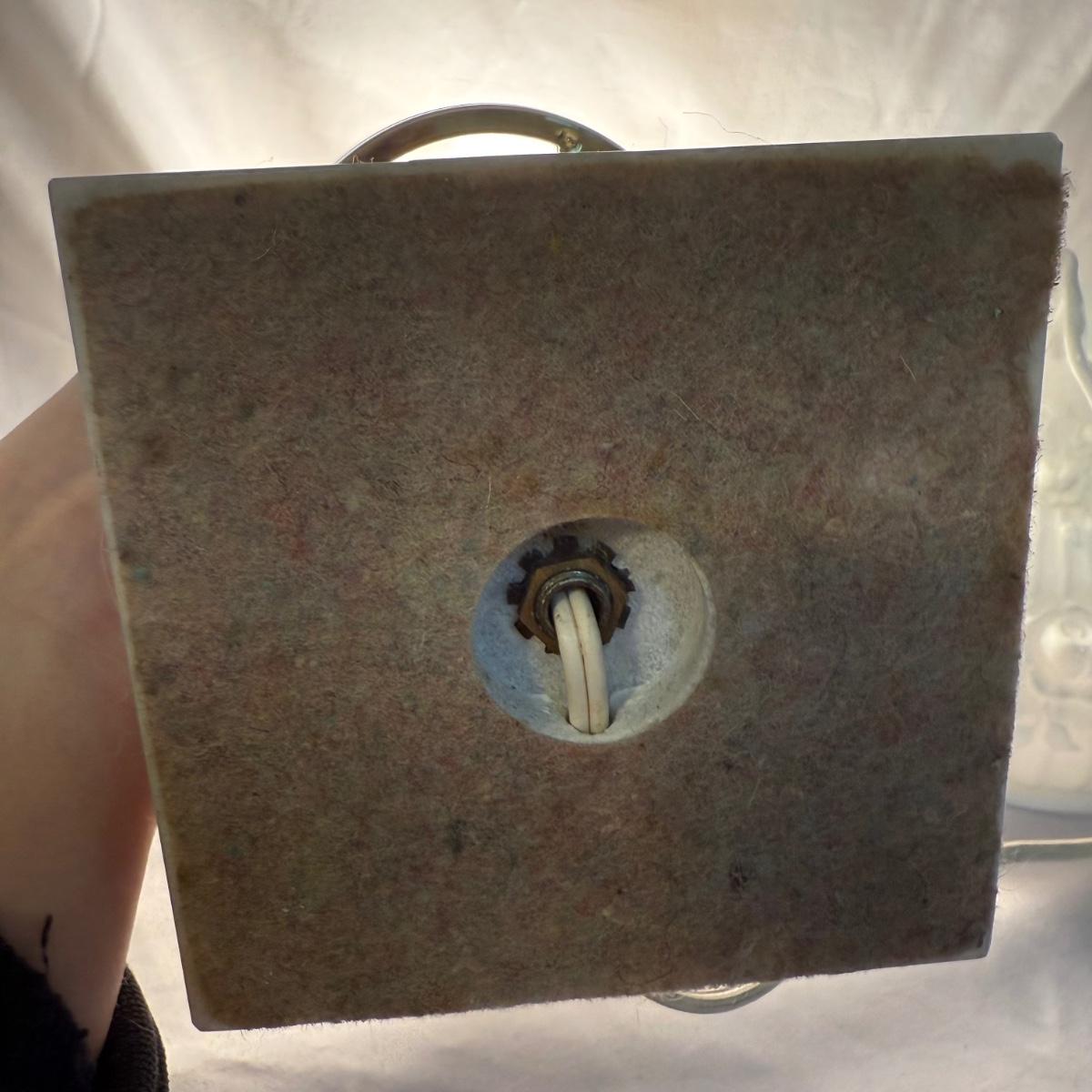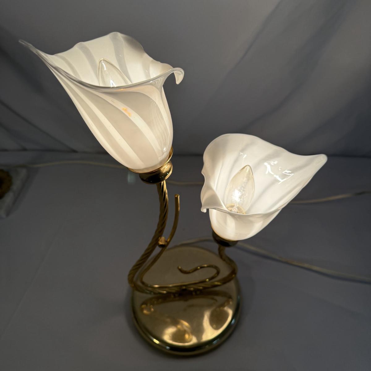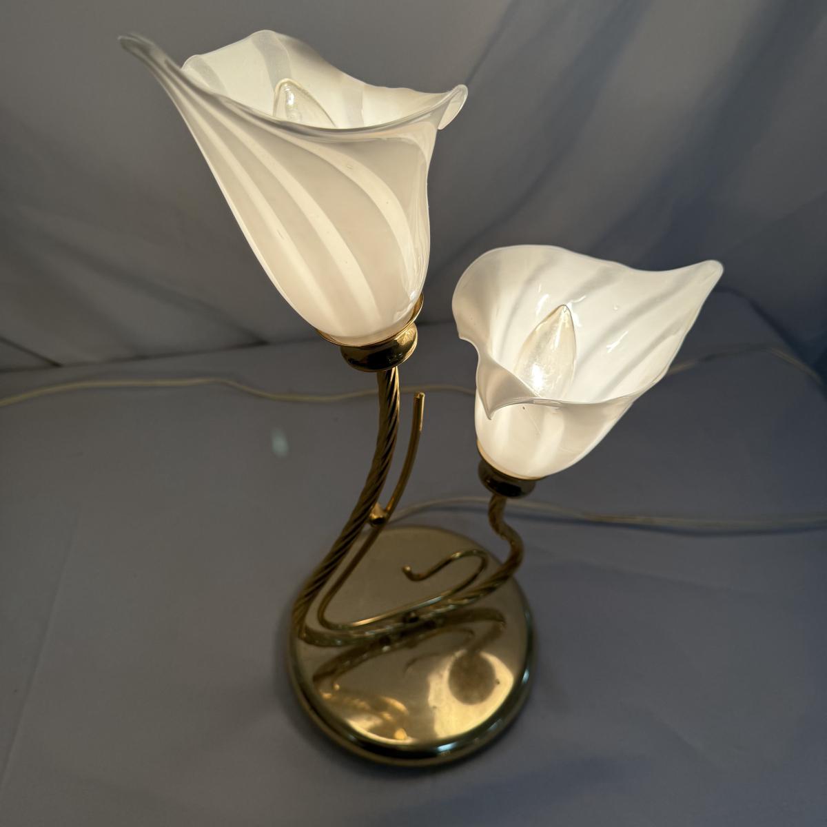 This lot contains two lamps. The first appears to be a Fenton poppy milk glass lamp with a marble base. This item measures 4.5” x 4.5” at the base and stands 19.25”H, this is a one way switch lamp and turns on via a key on the side. Next is a lilly inspired gold and white glass lamp, this is also a one way switch and turns on via a switch on the cord. Both lamps do turn on. This lamp measures 7”D at the base and stands 18”H. Shipping available.