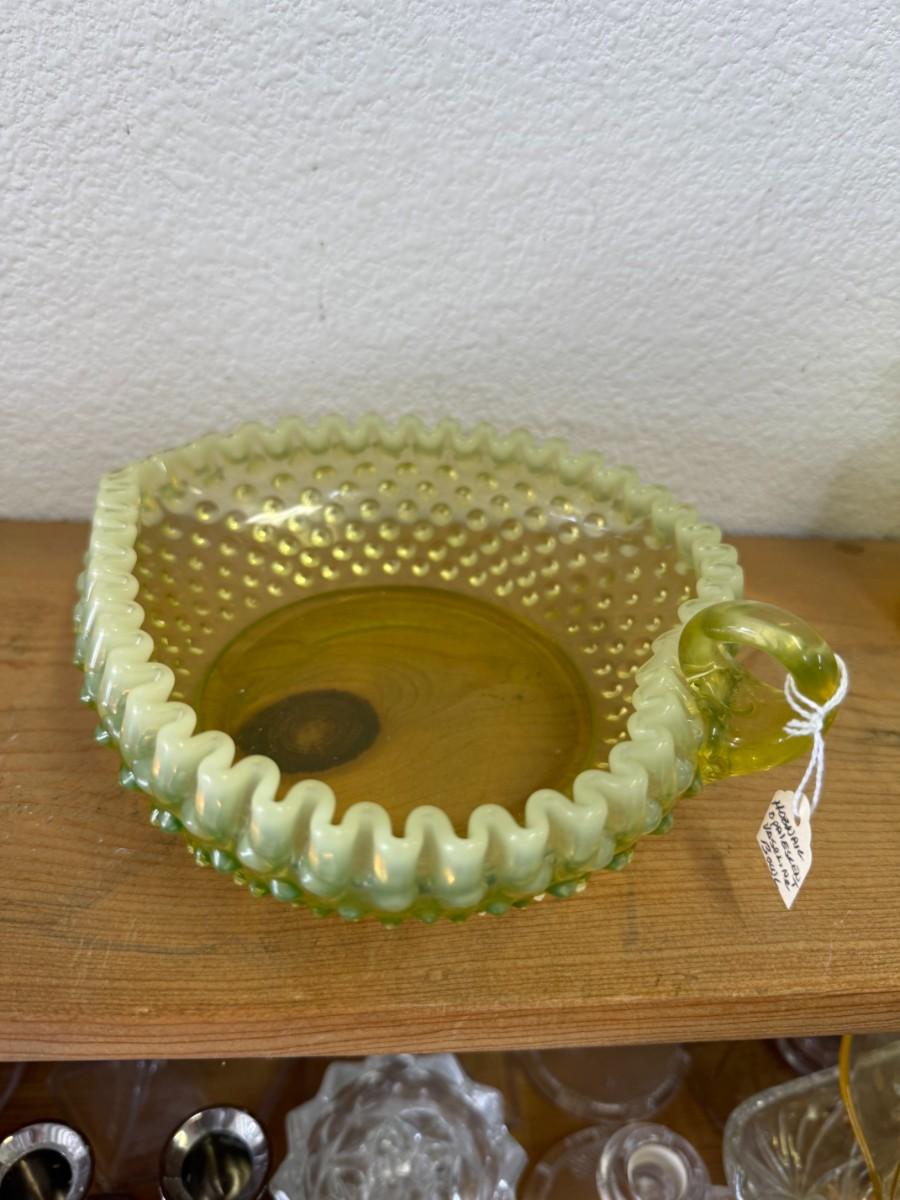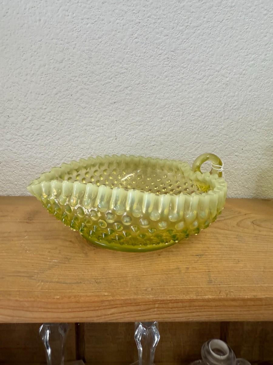 Fenton Pre-Logo Topaz Vaseline Opalescent Hobnail Heart Shaped Relish Dish