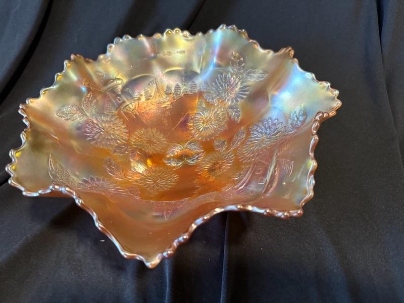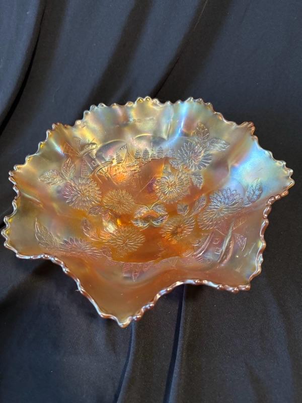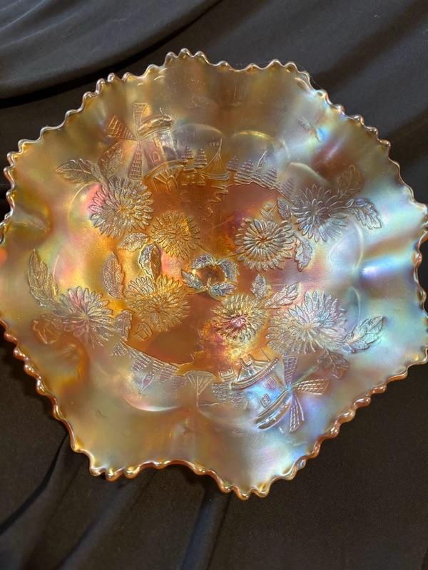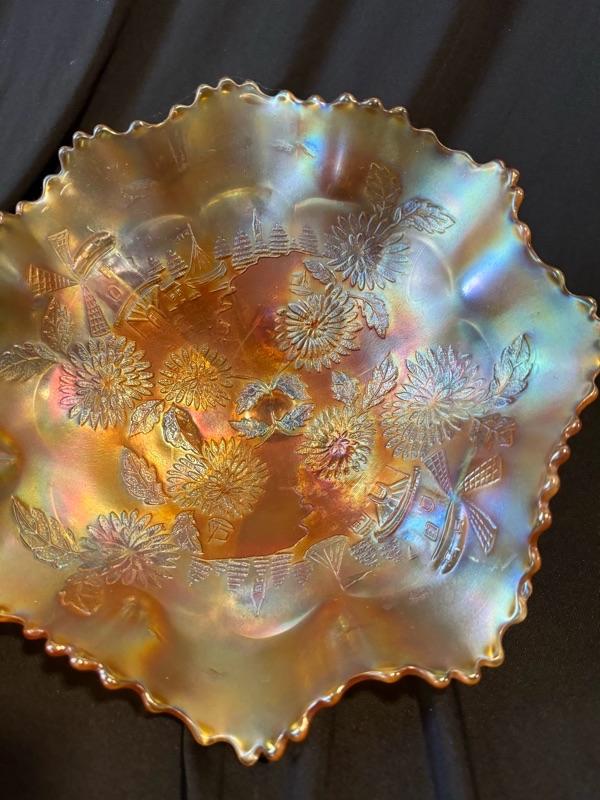 Fenton rare 1930s marigold 3 footed glass bowl carnival glass iridescent windmills and chrysanthemum