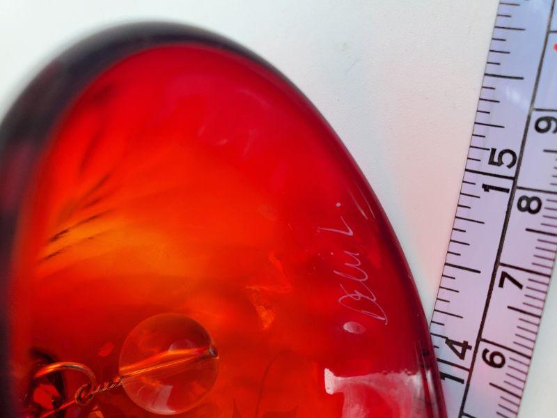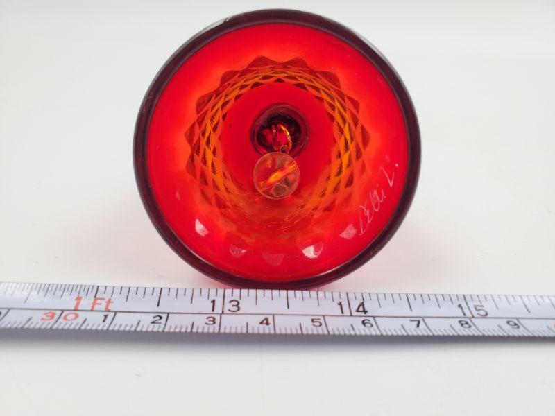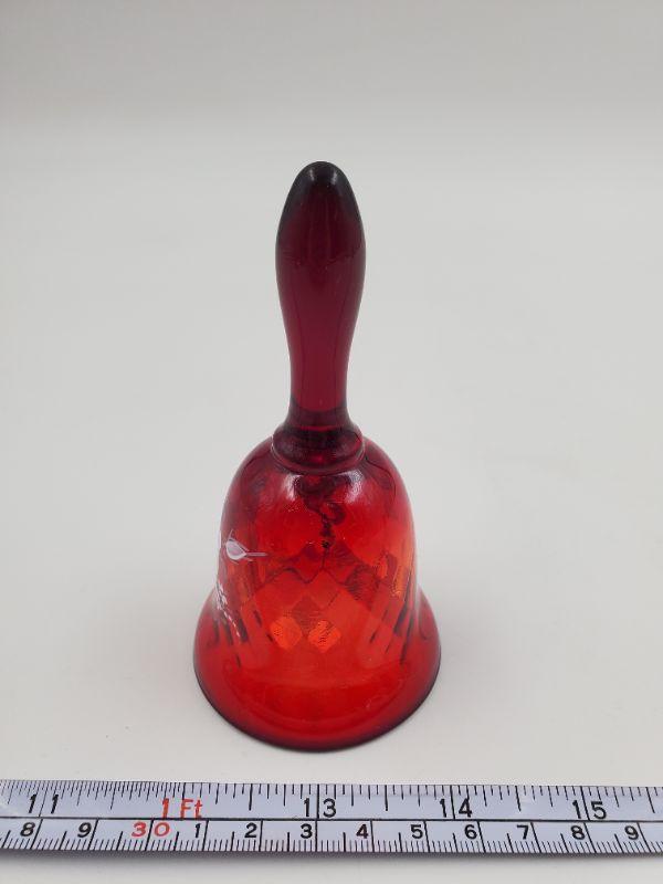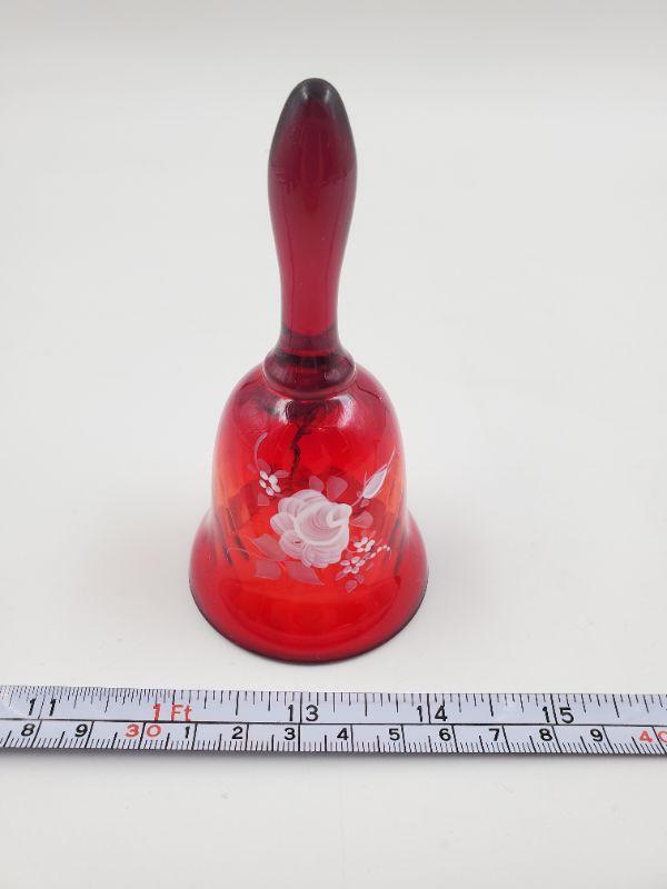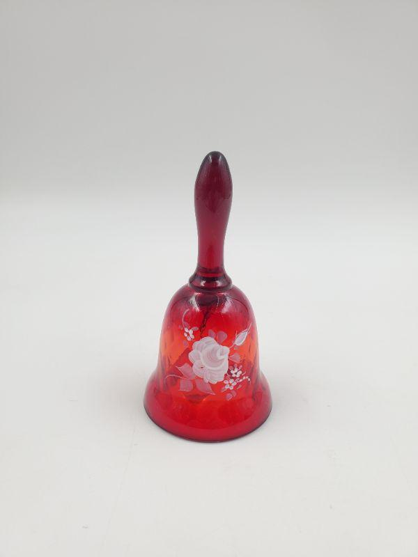This gorgeous Fenton glass bell is a amberina color with yellow being seen on the bell....hand painted white flowers pop against the brilliant color...signed Debi on inside, very good condition! Approximately 4.25in tall