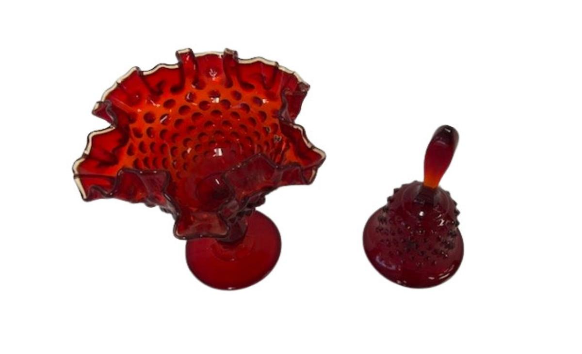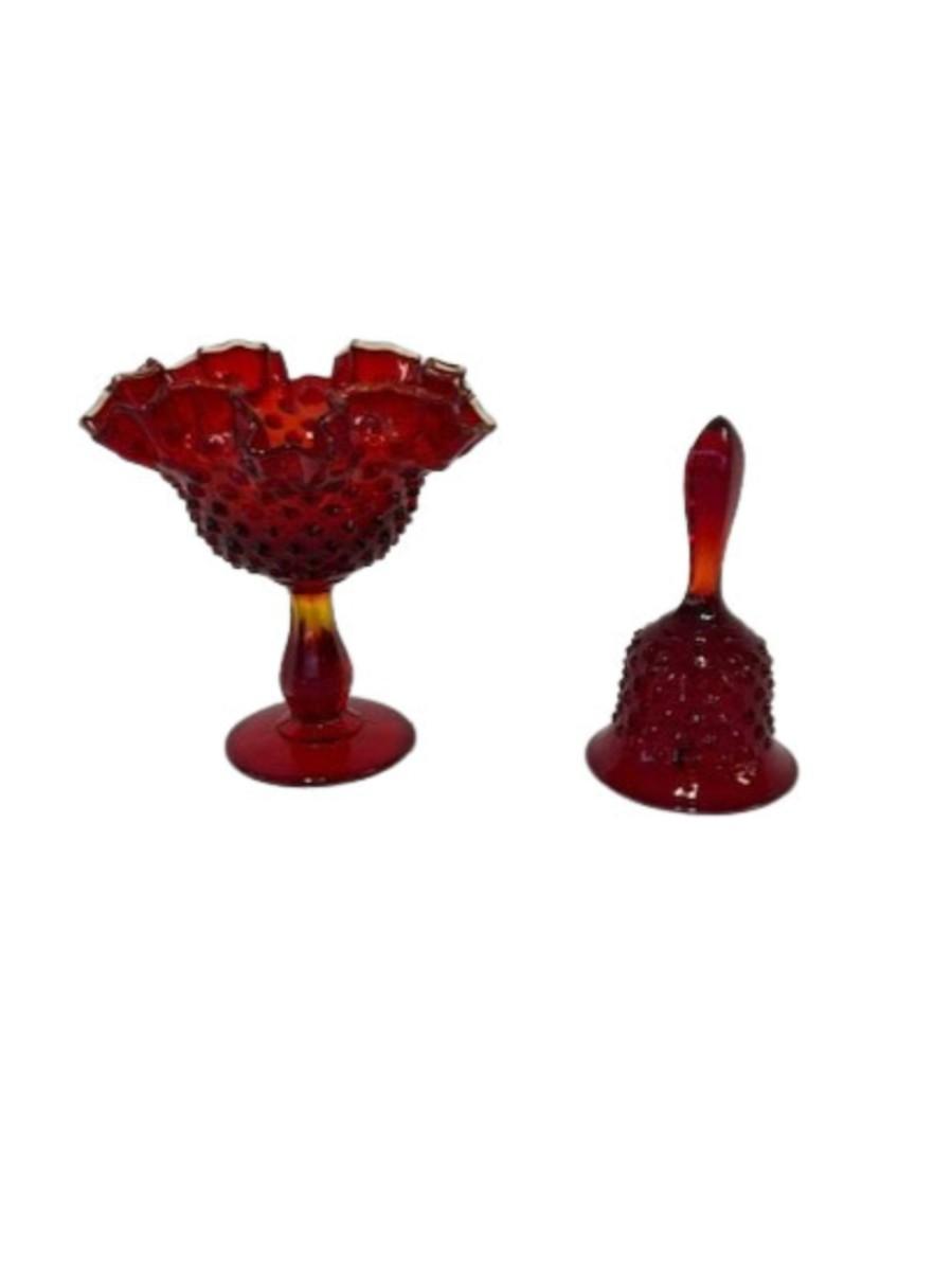 Includes a double crimp compote, and a bell. Total of 2 pieces. No obvious chips or cracks. Measurement of largest: 6.25". [CC]