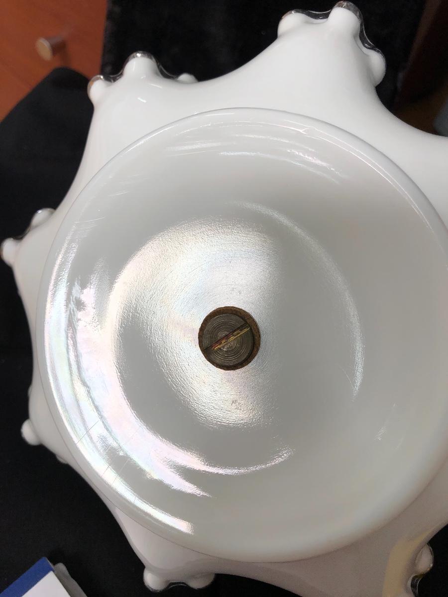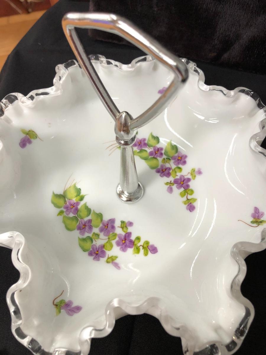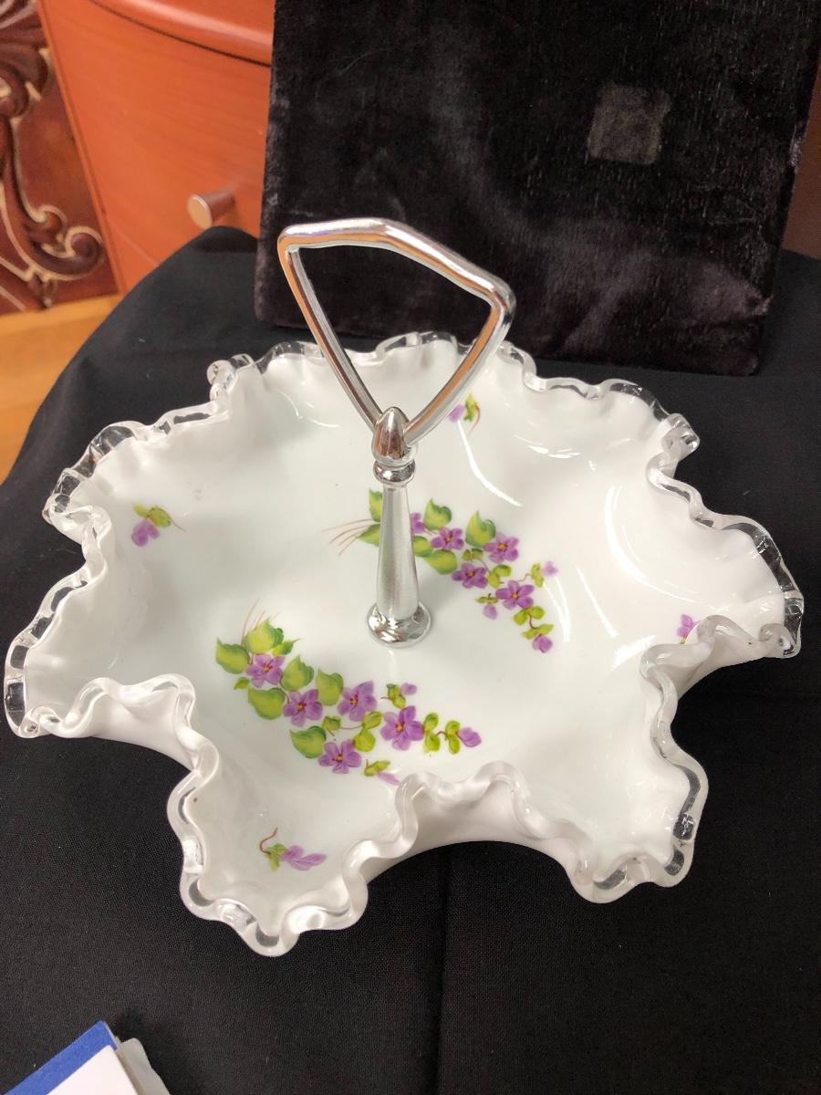 This is a beautiful hand painted piece. It is ruffled at top and is silver crest milk glass. Measures 8”