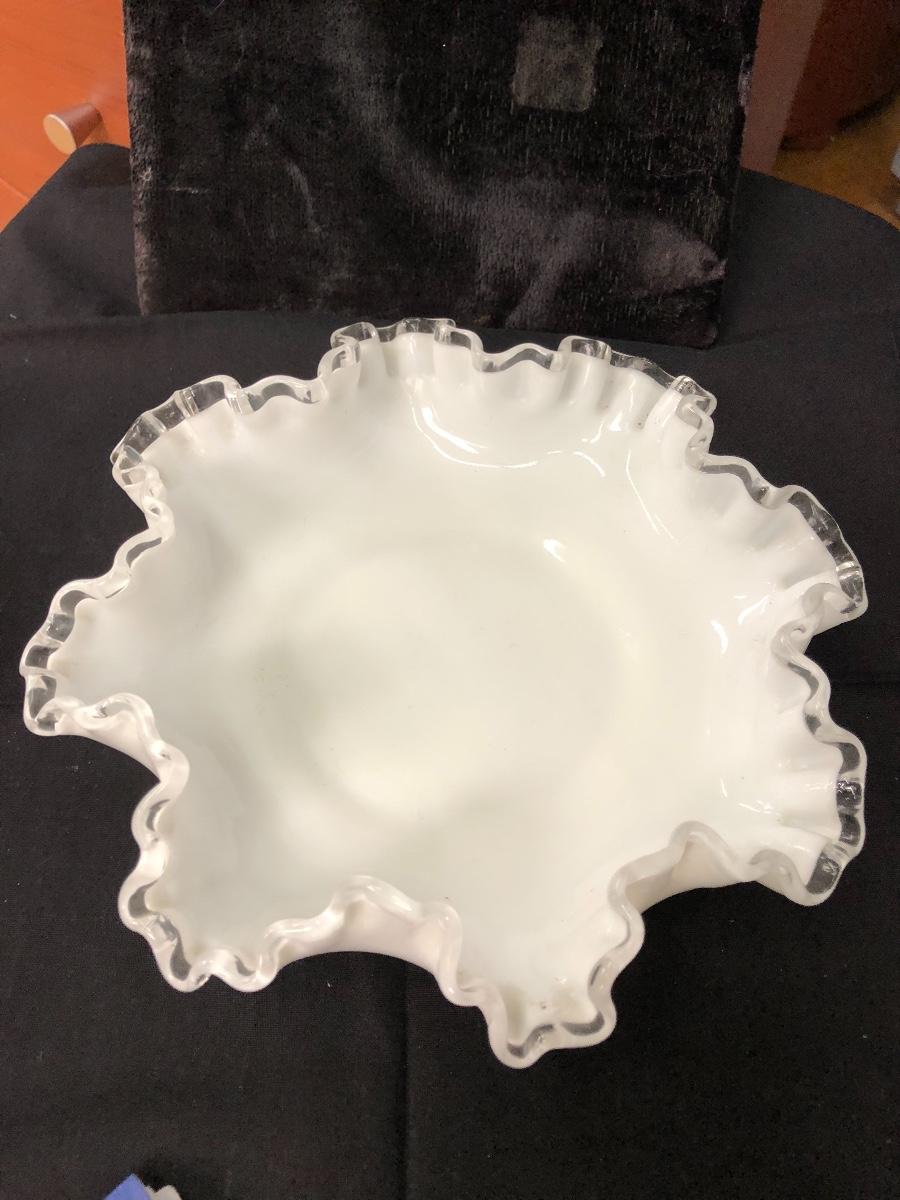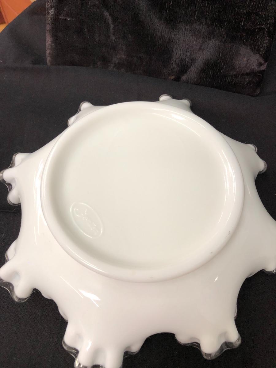 This Fenton silver crest ruffled milk glass candy dish is 8” across