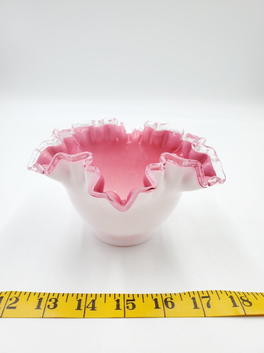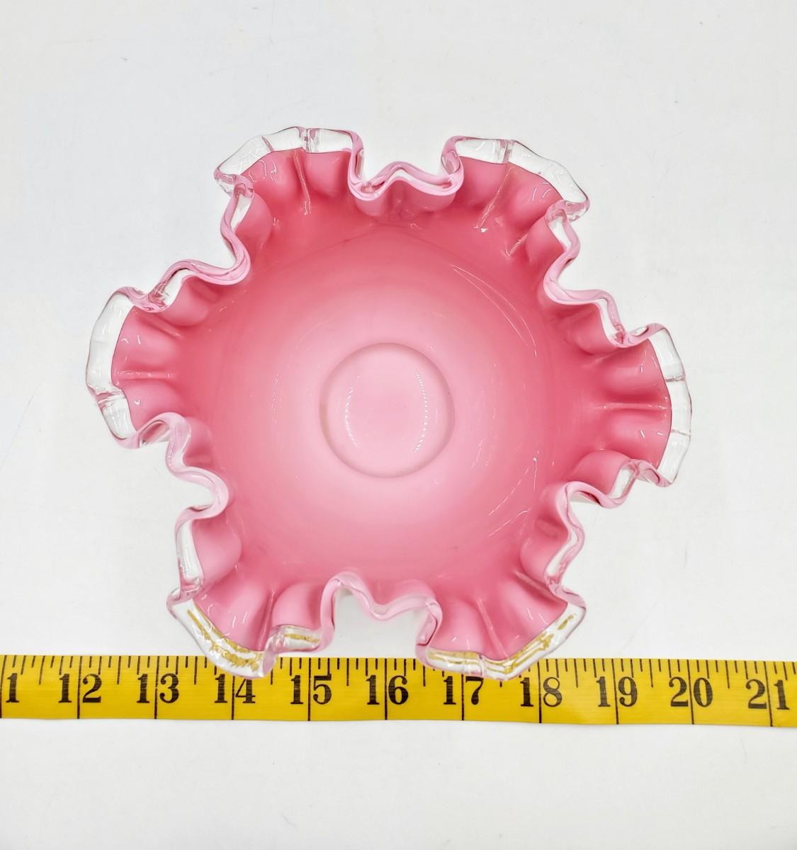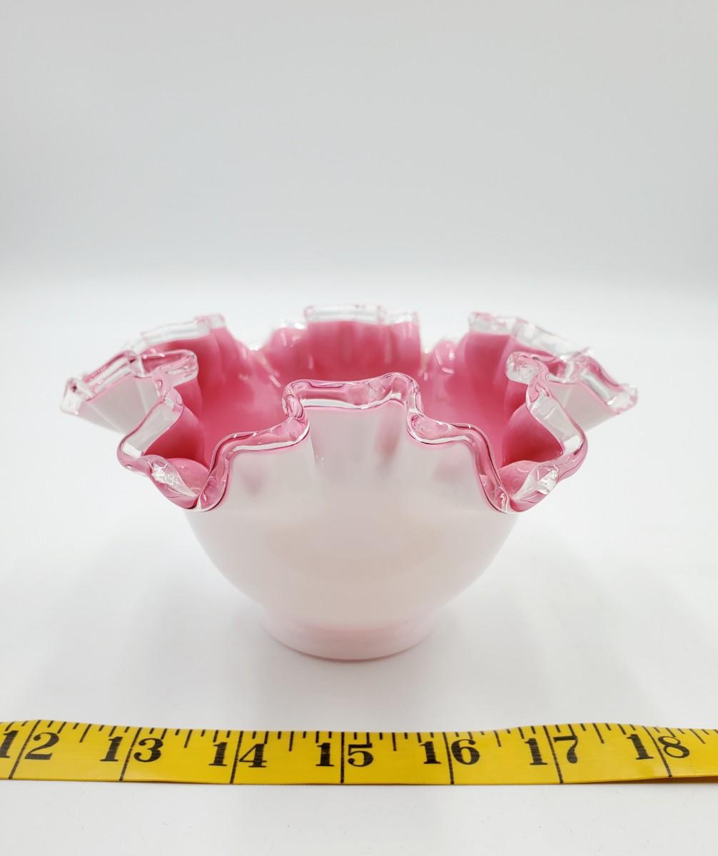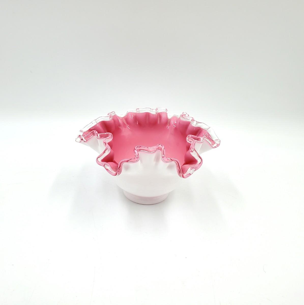 FENTON SILVER CRESTED WHITE MILK GLASS PINK RUFFLED TOP CANDY DISH