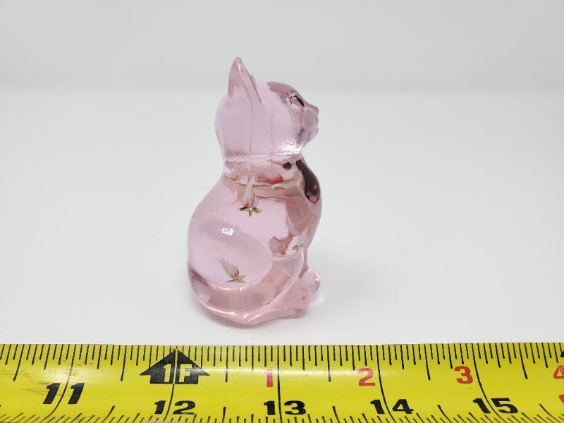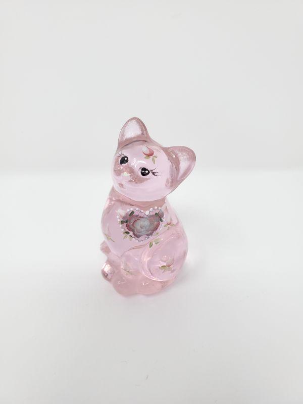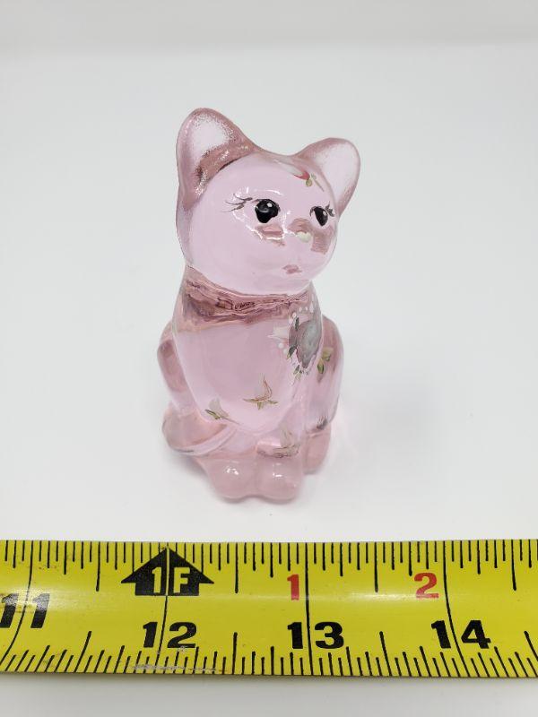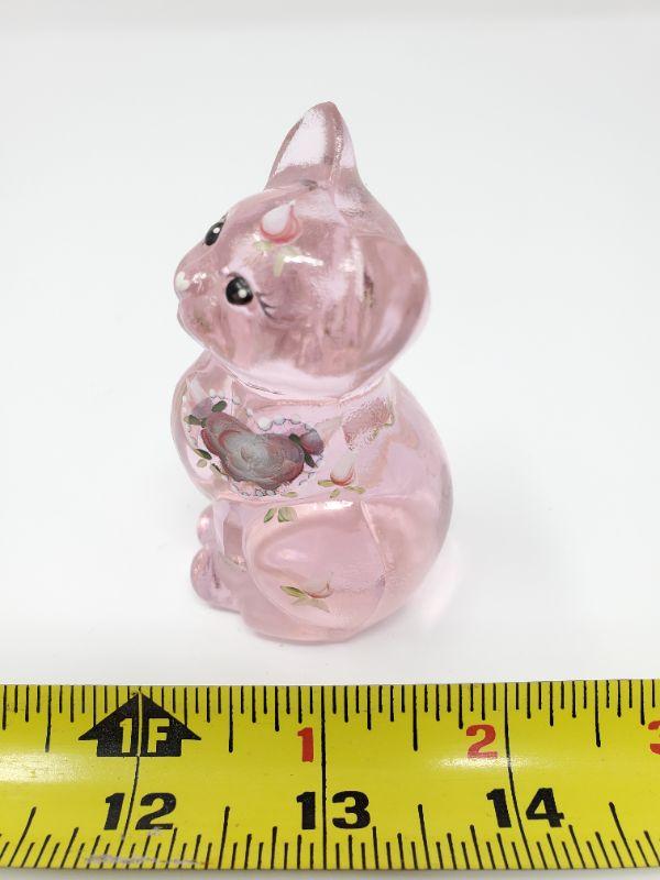 Kitty is approximately 3in tall. Fenton stamped into glass on back bottom and signed on bottom. Smiles and the butterfly can be seen on the back, but for you has rubbed off...good condition otherwise!
