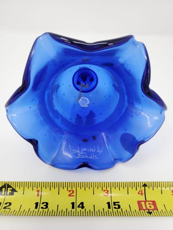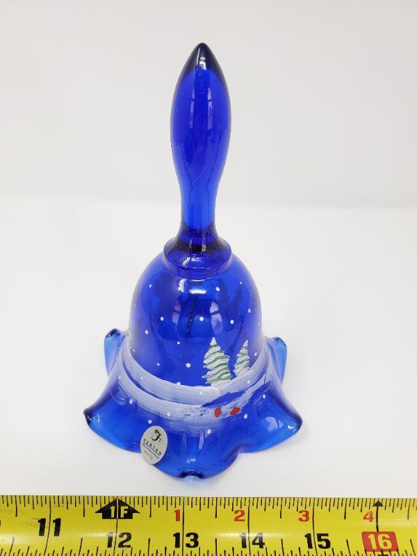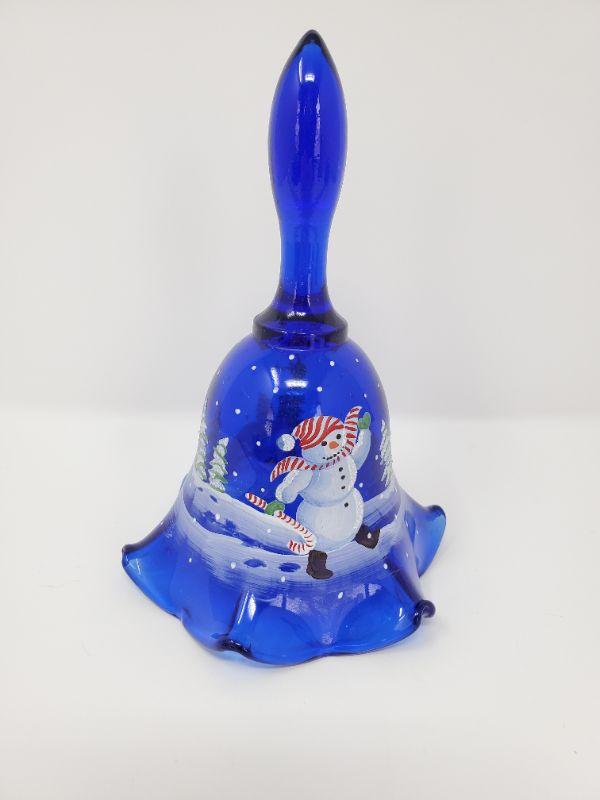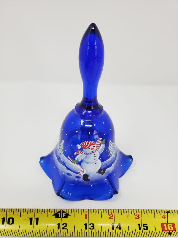 Adorable Fenton snowman blue glass bell with scalloped base in very good condition.