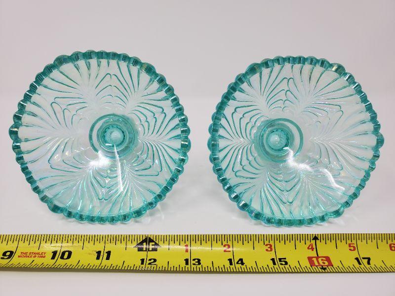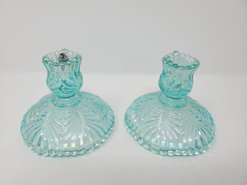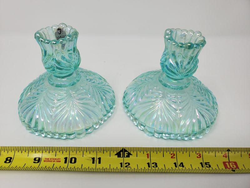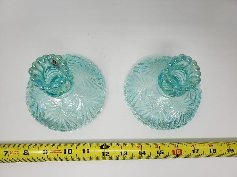 FENTON TEAL IRIDESCENT CANDLESTICK HOLDERS