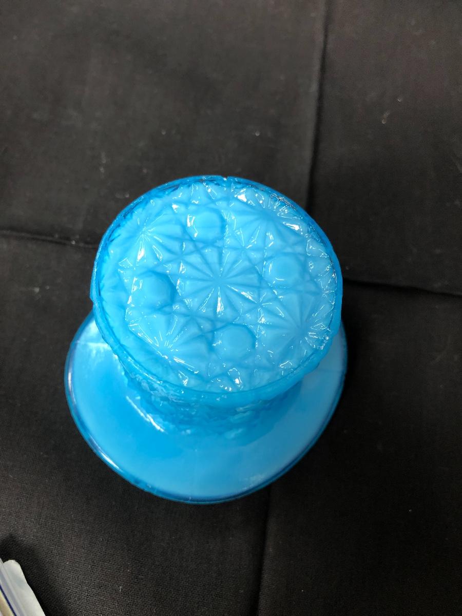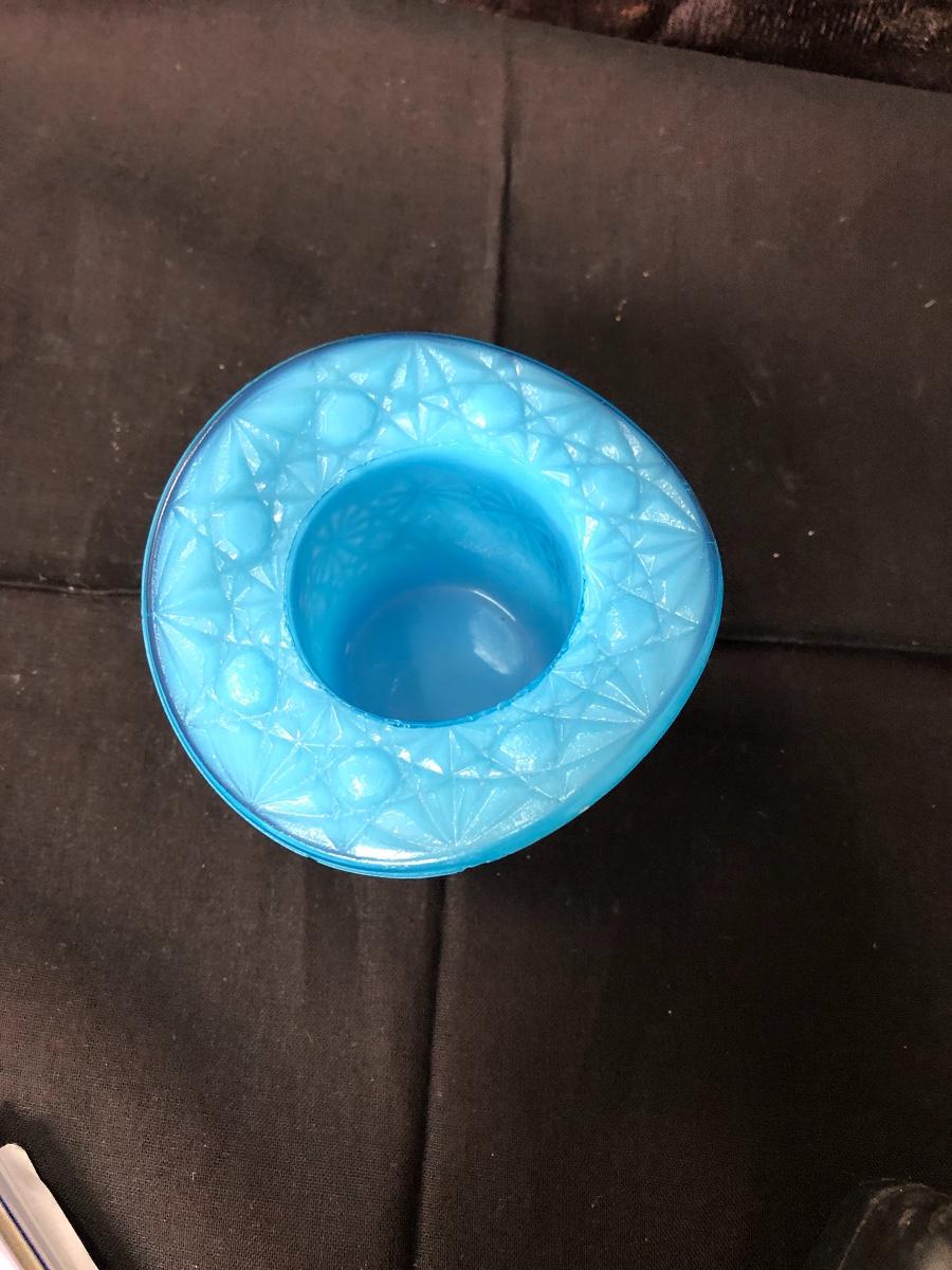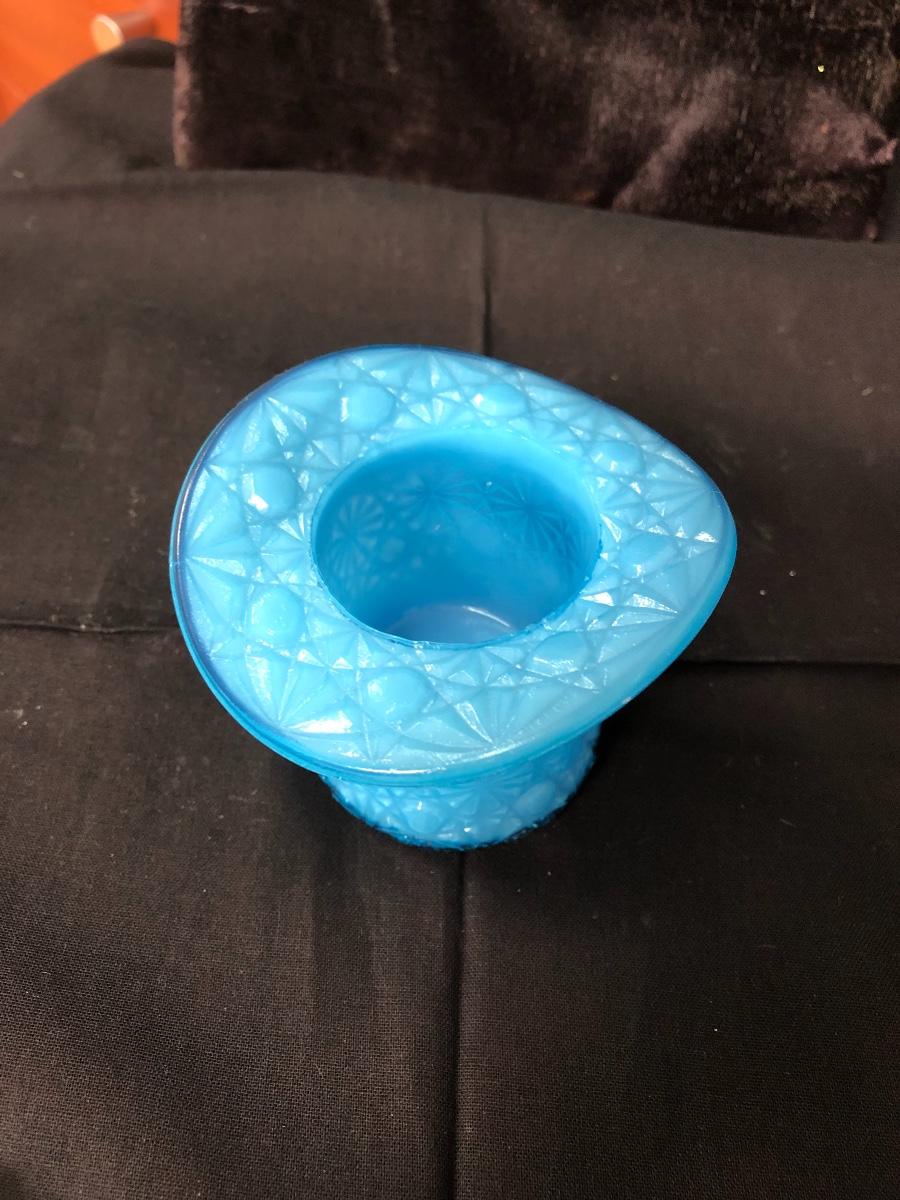 This buttons and daisies hat toothpick holder is in a gorgeous blue. It is 2” high