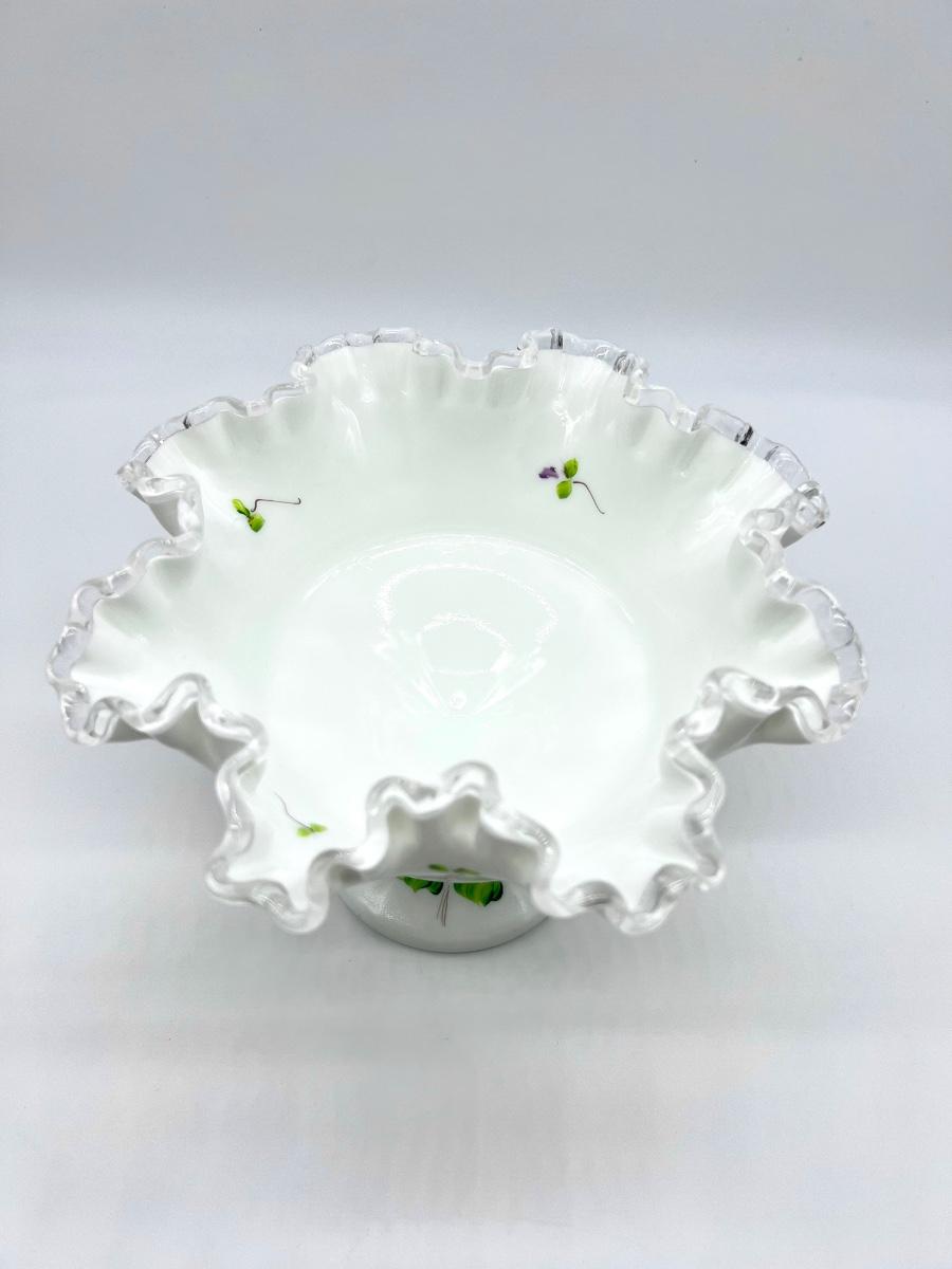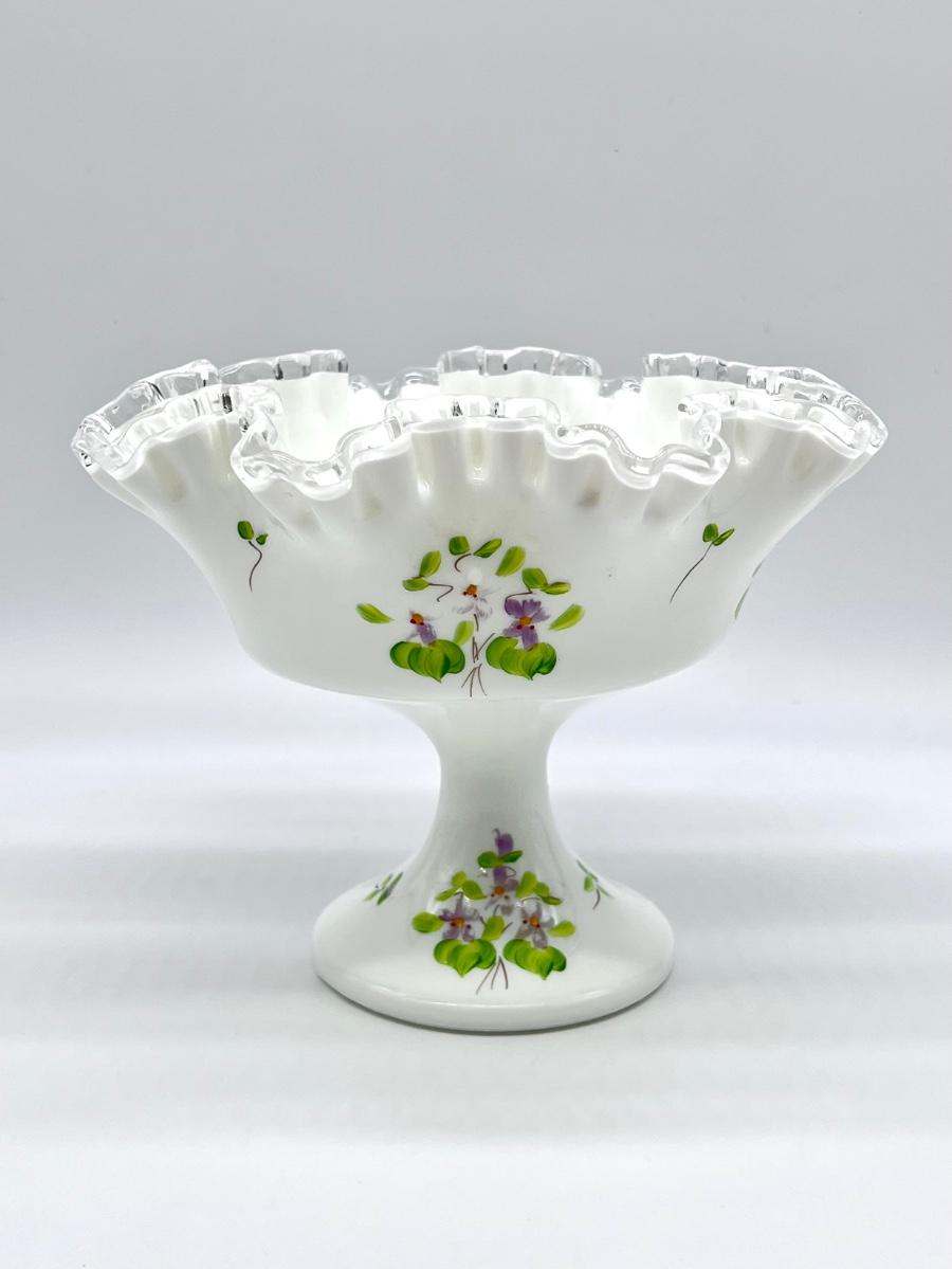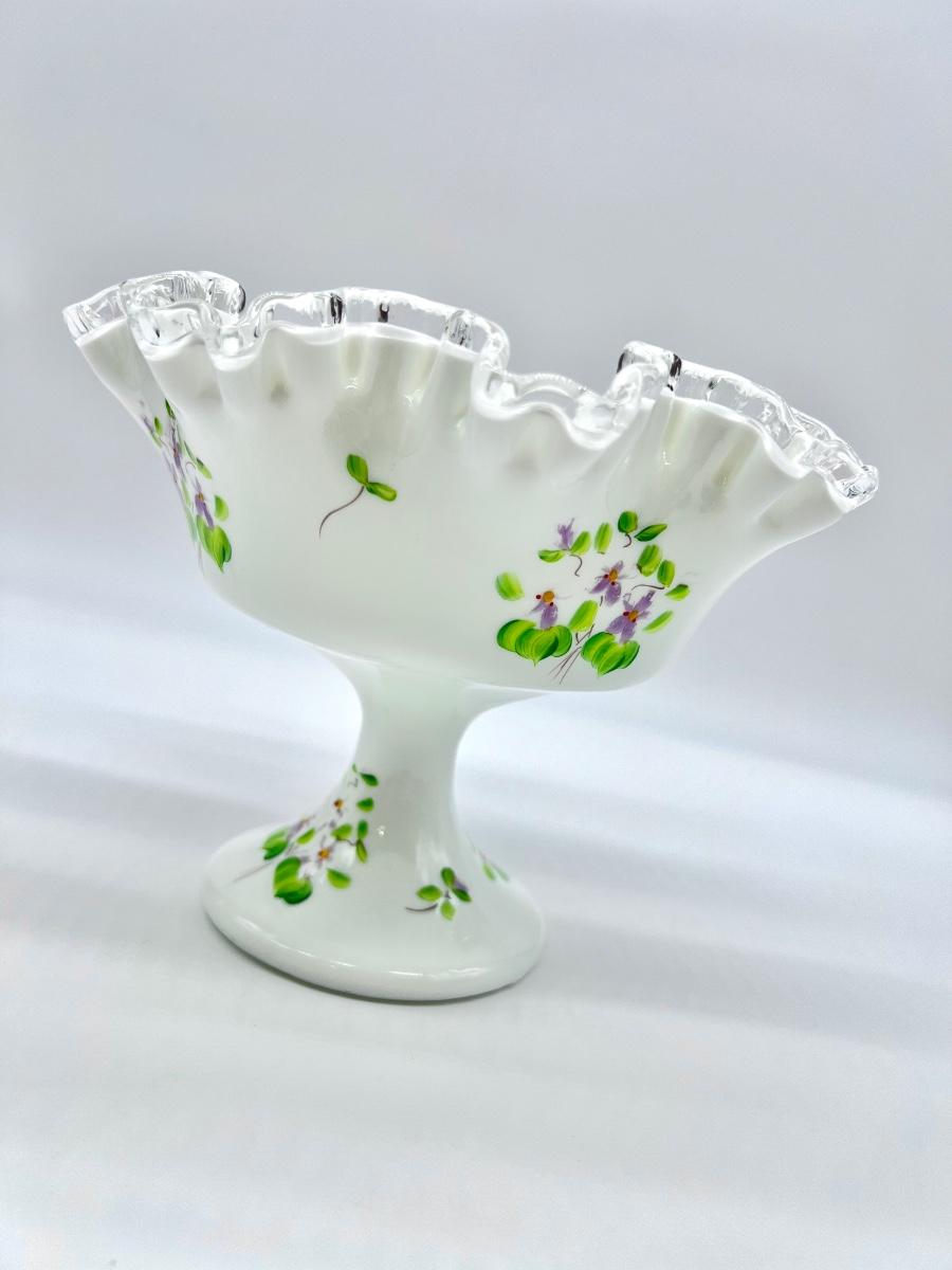 FENTON ~ Violets In The Snow ~ Silver Crest Ruffled Rim Pedestal Bowl