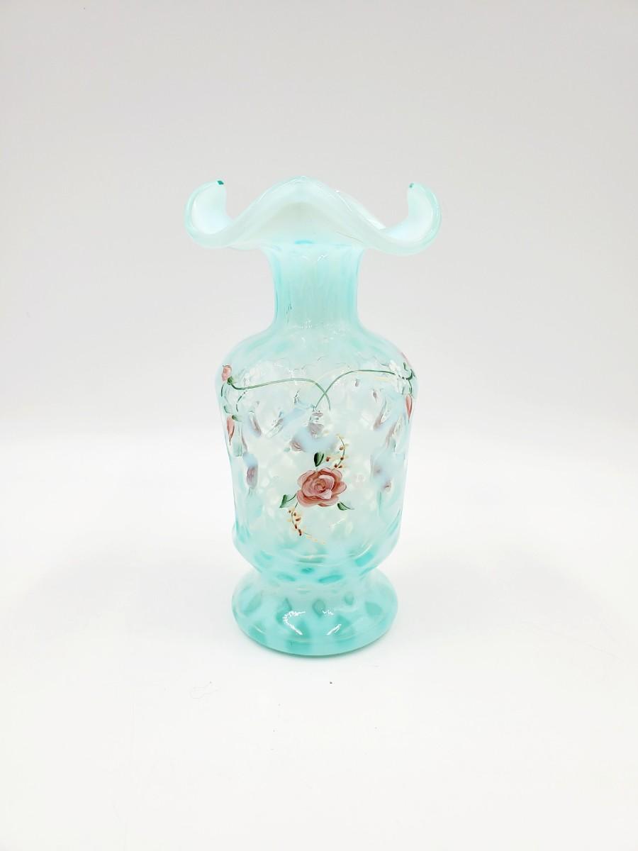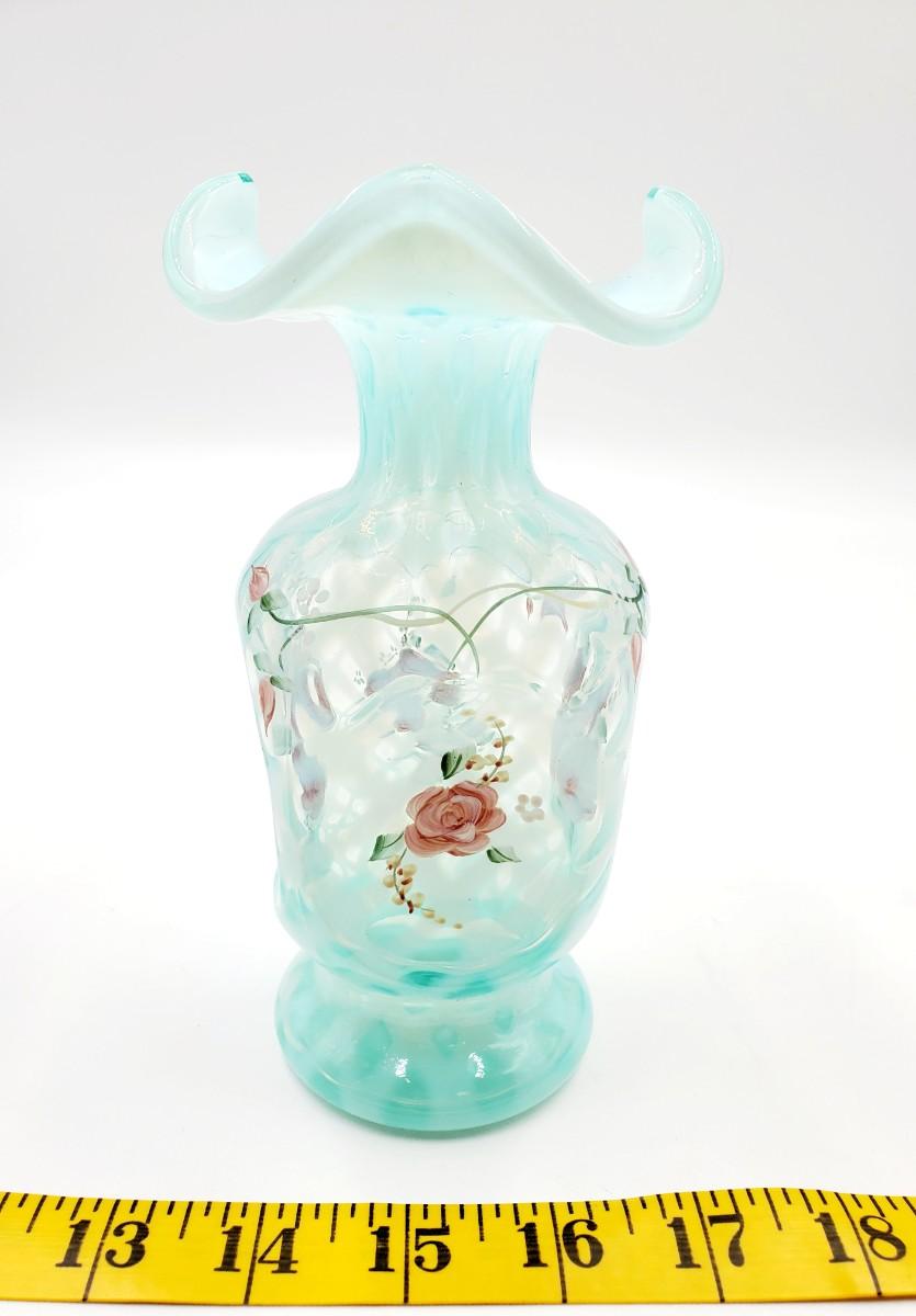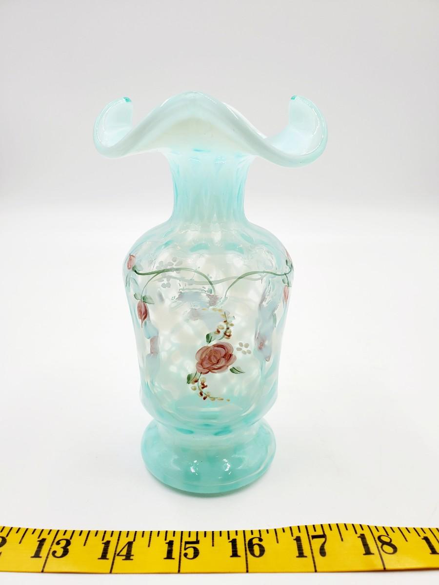 FENTON VLUE OPALESCENT DIAMOND OPTIC HAND PAINTED FLORAL PINCH VASE