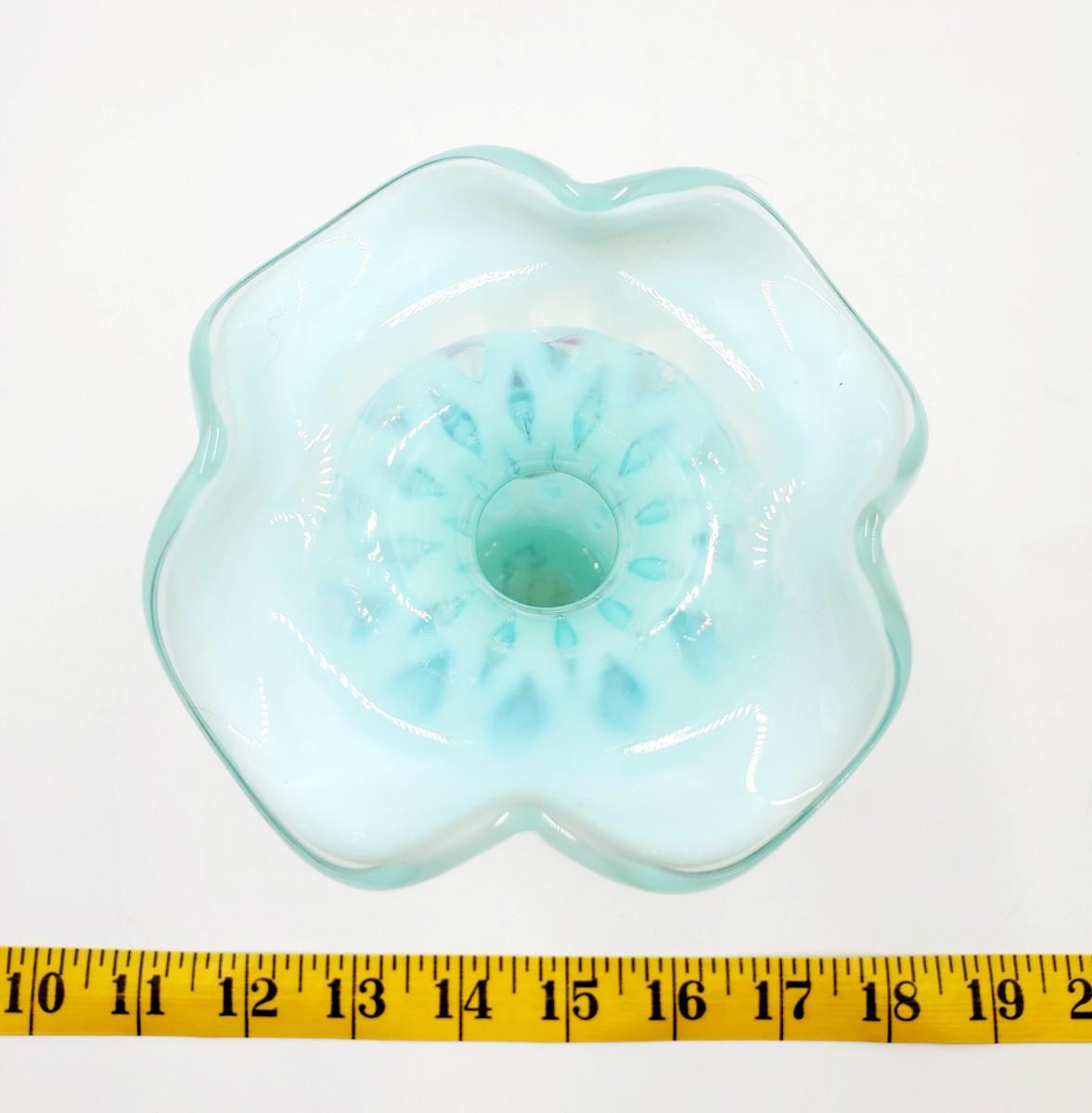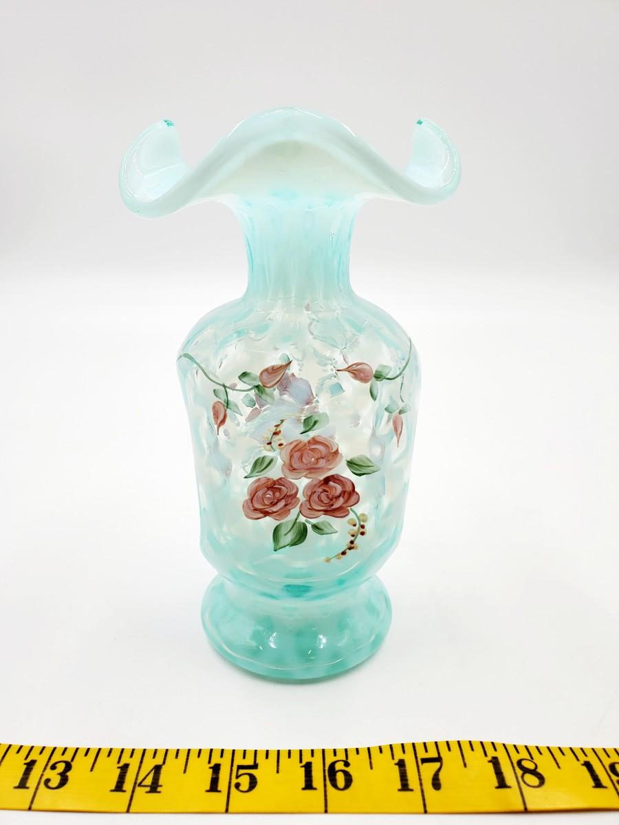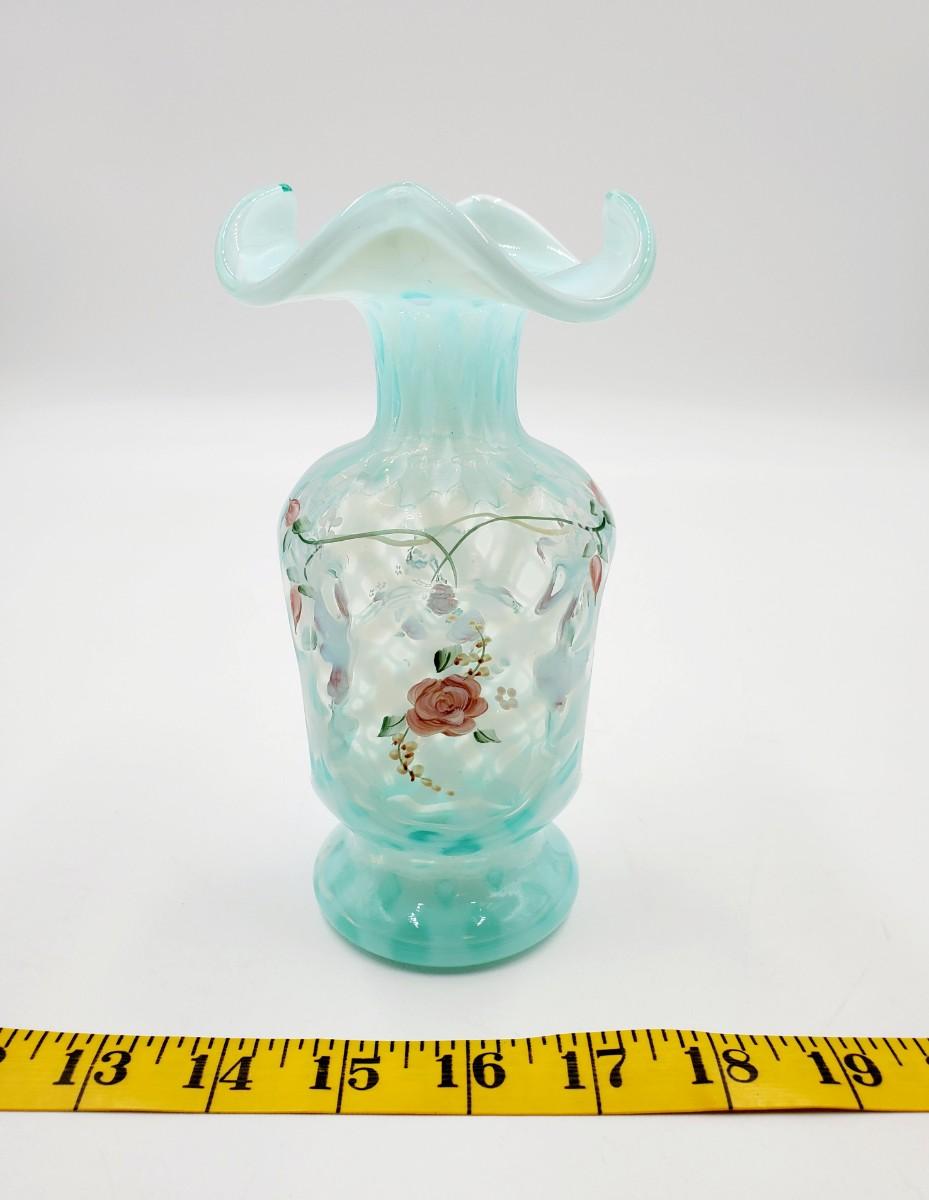 FENTON VLUE OPALESCENT DIAMOND OPTIC HAND PAINTED FLORAL PINCH VASE