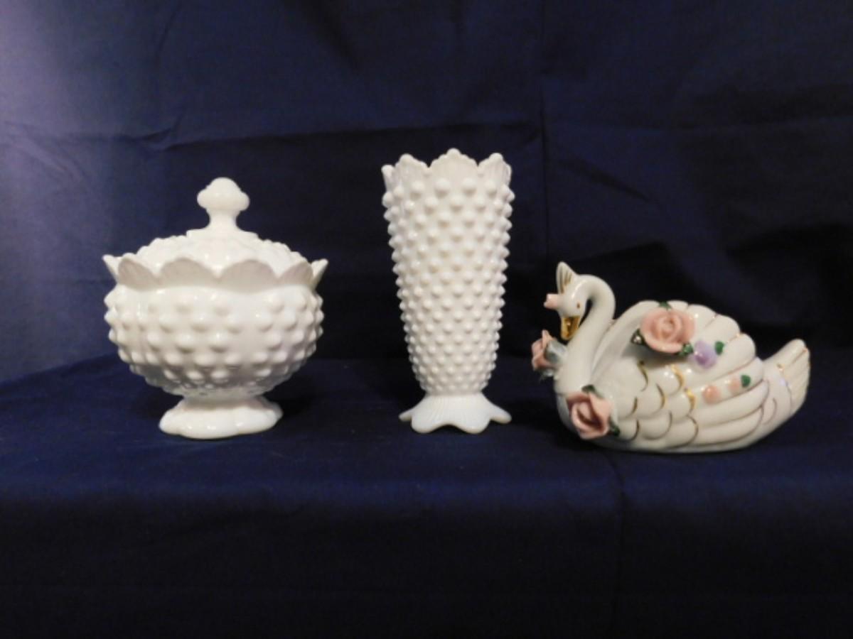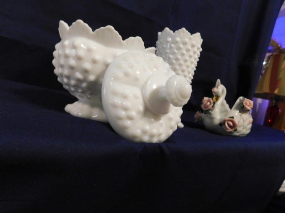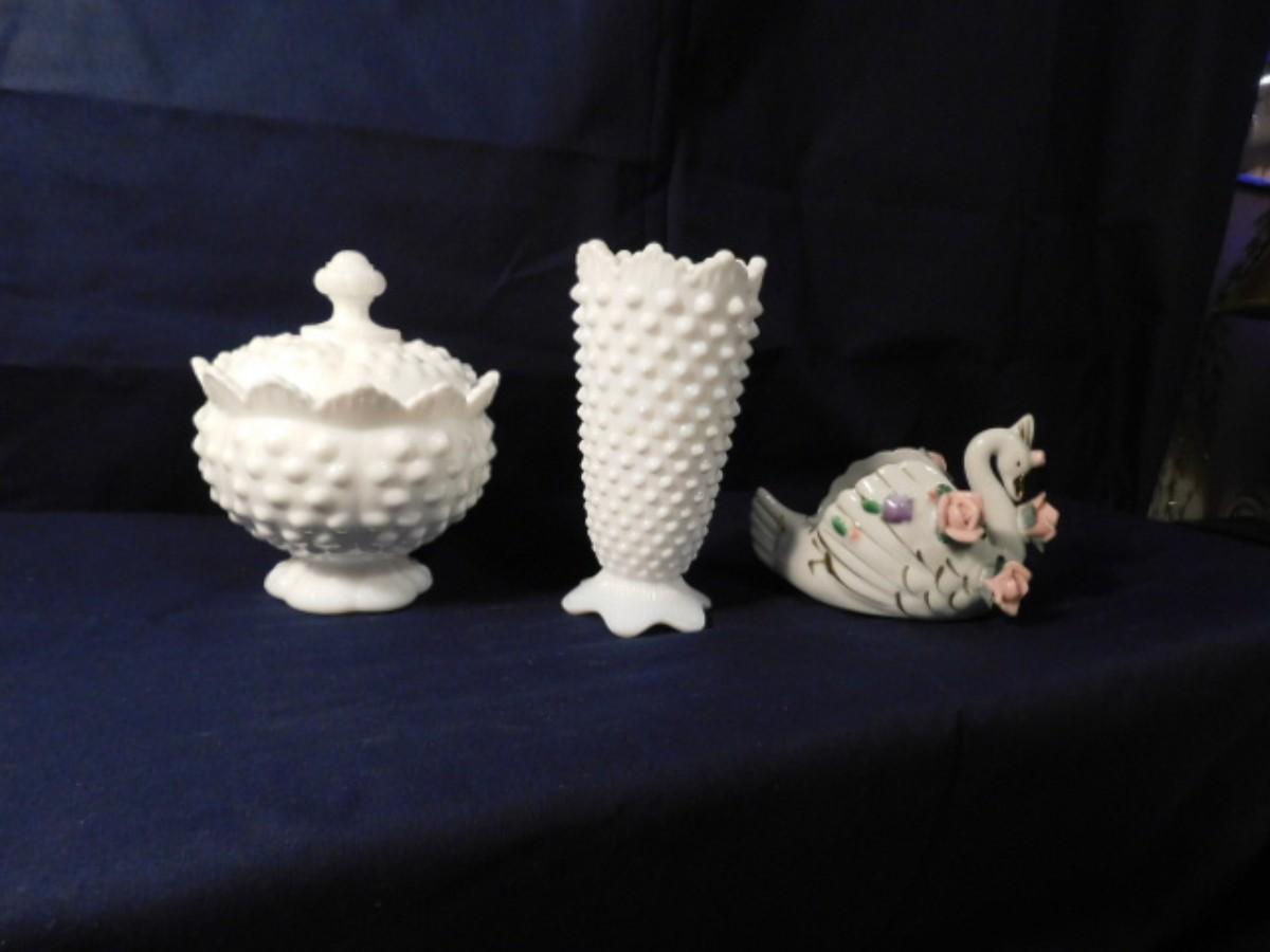 FENTON WHITE HOBNAIL MILK GLASS AND VTG PORCELAIN SWAN