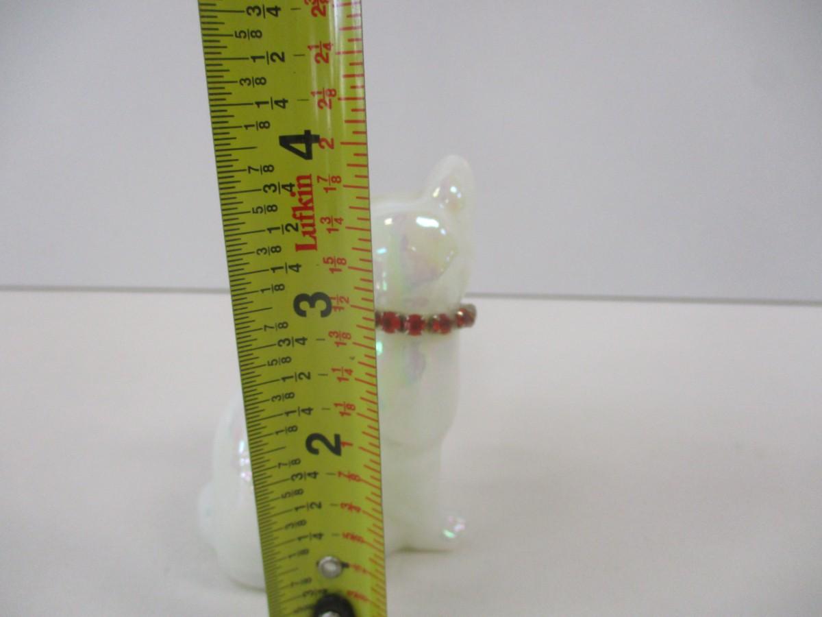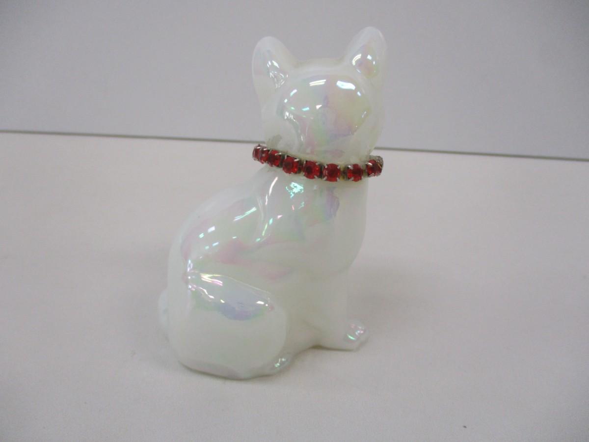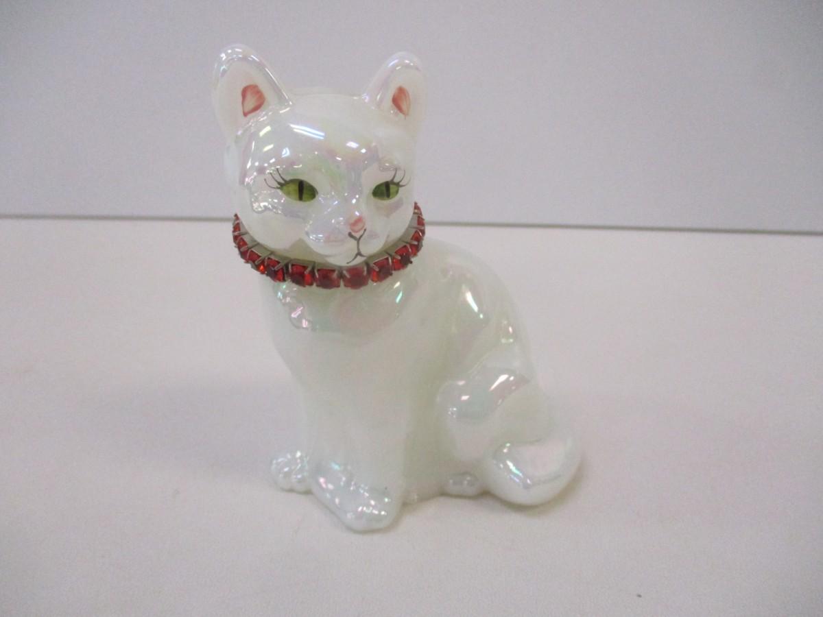 Fenton White Iridescent Opalescent Hand Painted Cat Figure Red Birthstone Collar & Green Eyes