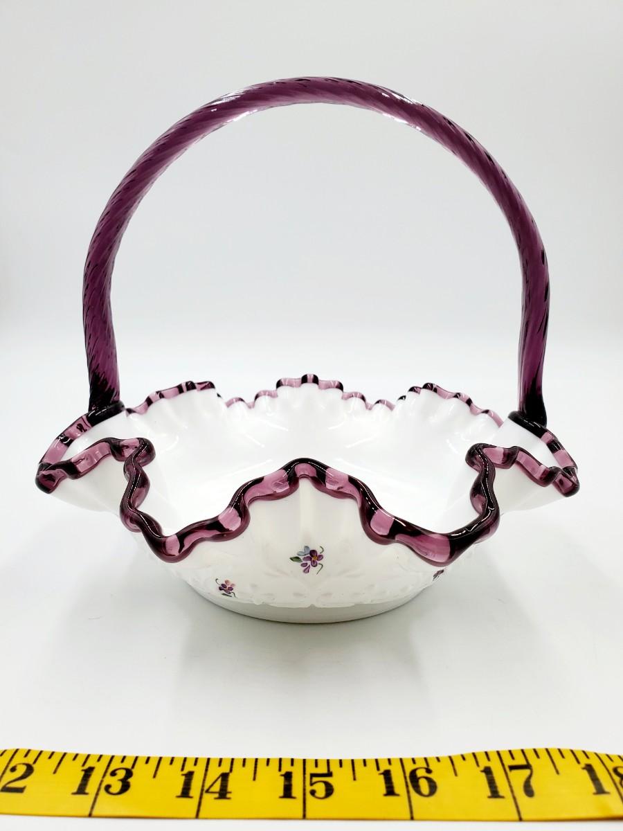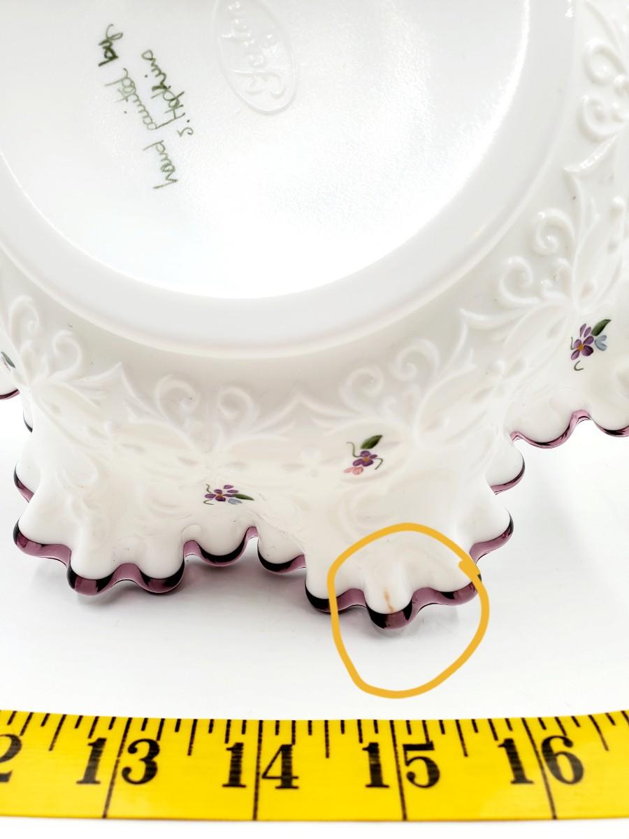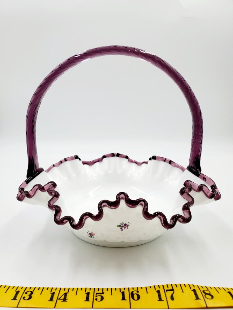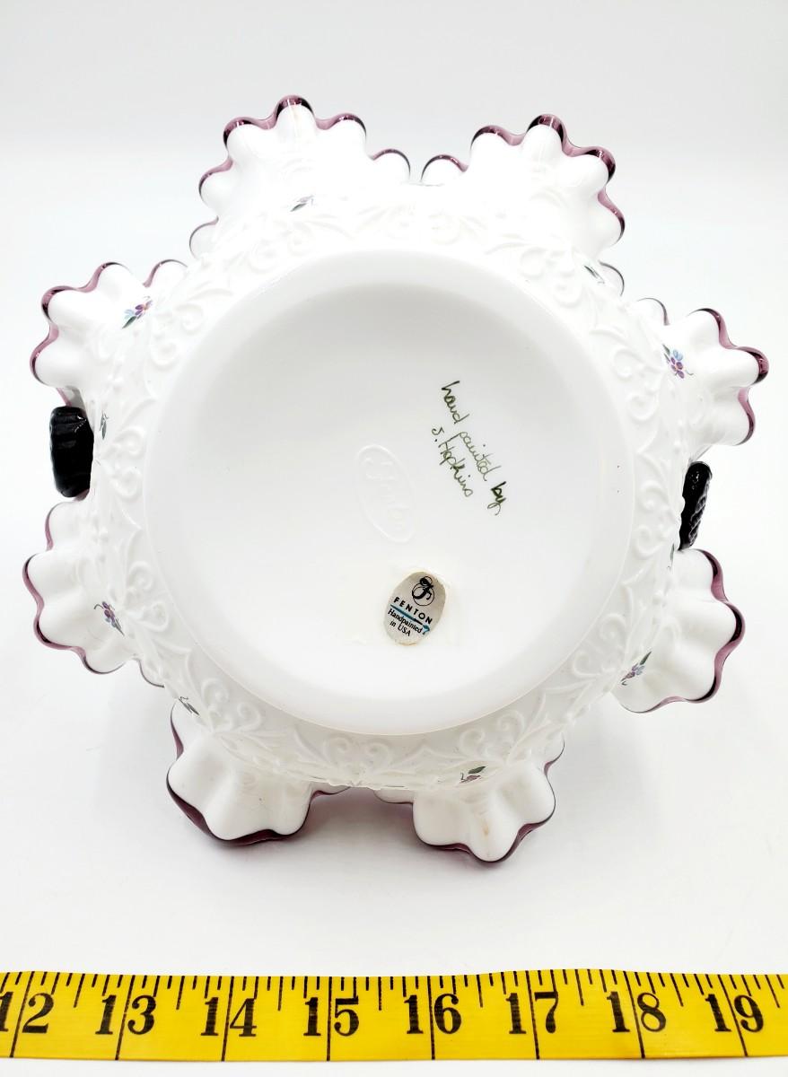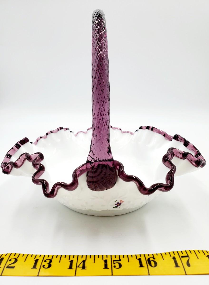 Fenton hand painted with pretty purple delicate flowers on milk glass...ruffled plum crest and decorative swirls on the outer part of basket. Good condition despite the Fenton sticker being taped back on with scotch type tape, there are also 2 small marks of something I could not remove, see photos. Maker's mark on bottom along with signature.