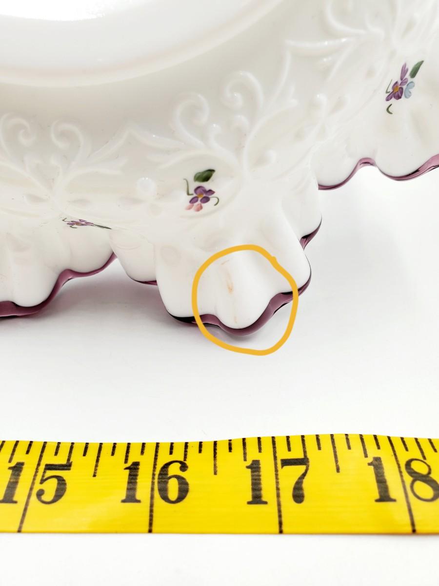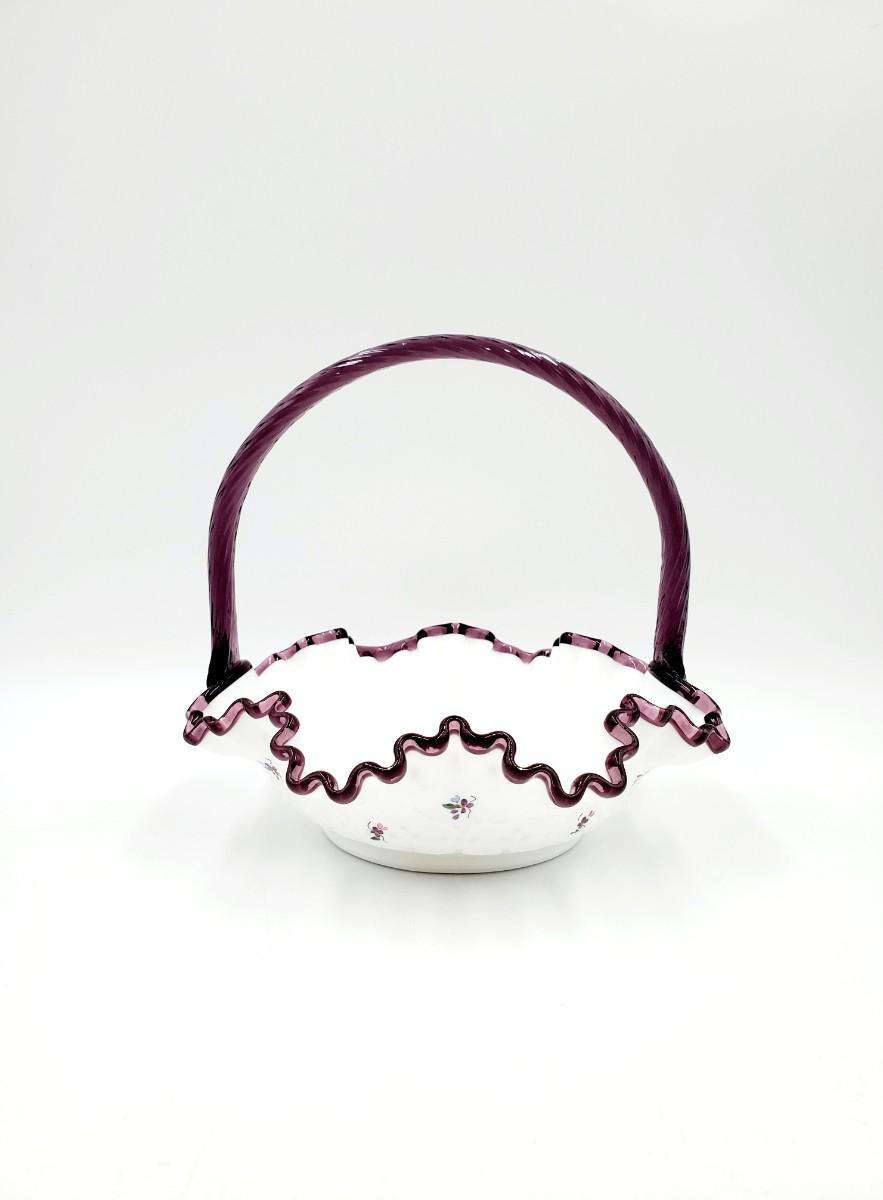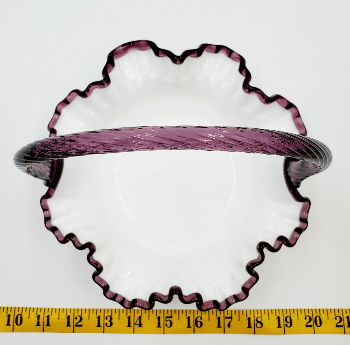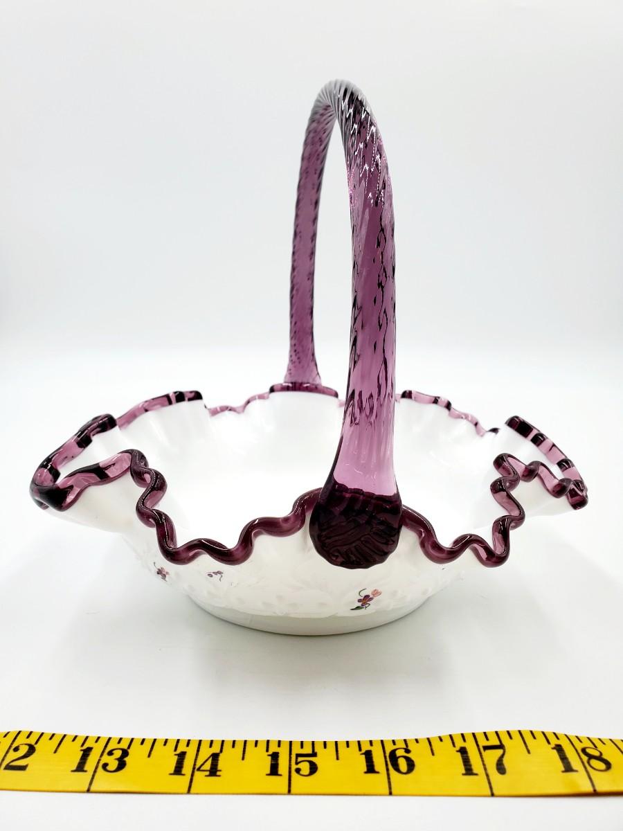 Fenton hand painted with pretty purple delicate flowers on milk glass...ruffled plum crest and decorative swirls on the outer part of basket. Good condition despite the Fenton sticker being taped back on with scotch type tape, there are also 2 small marks of something I could not remove, see photos. Maker's mark on bottom along with signature.
