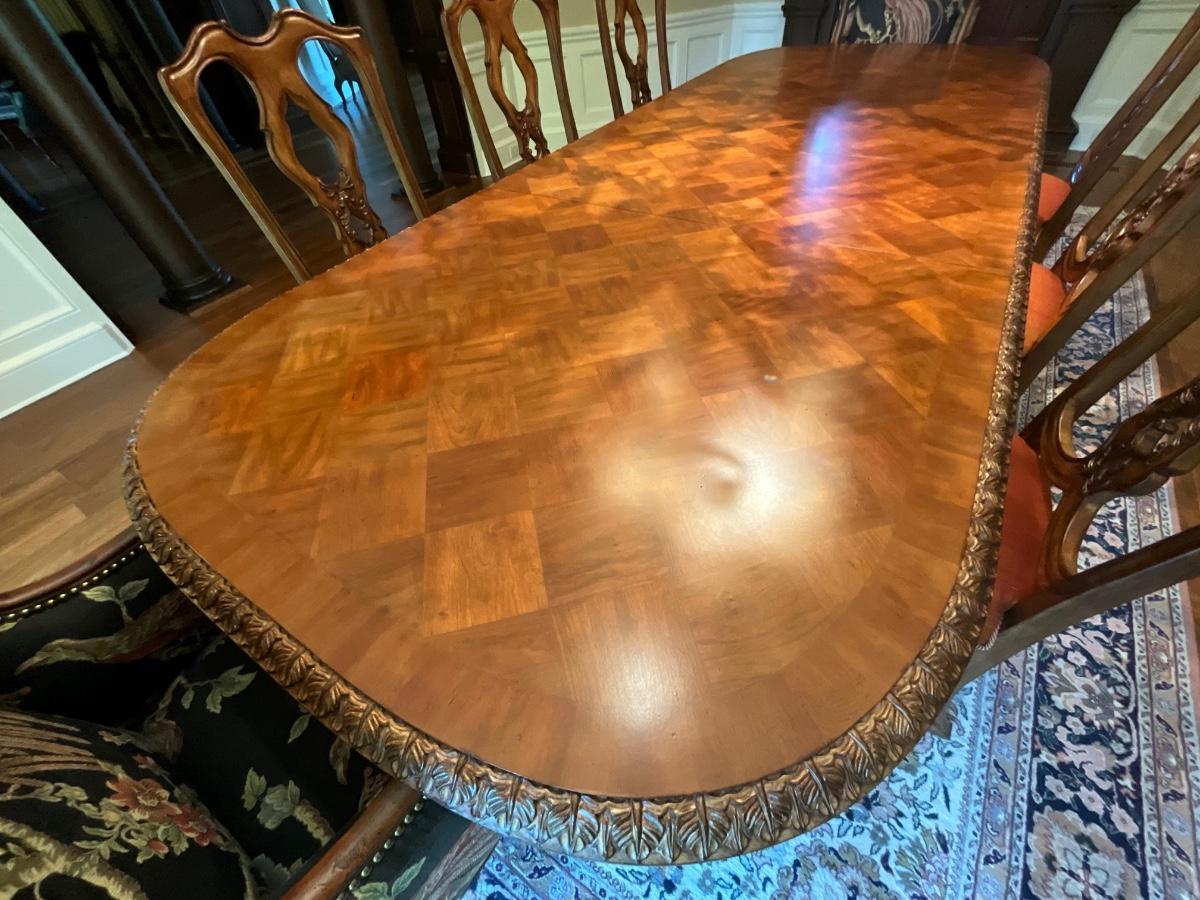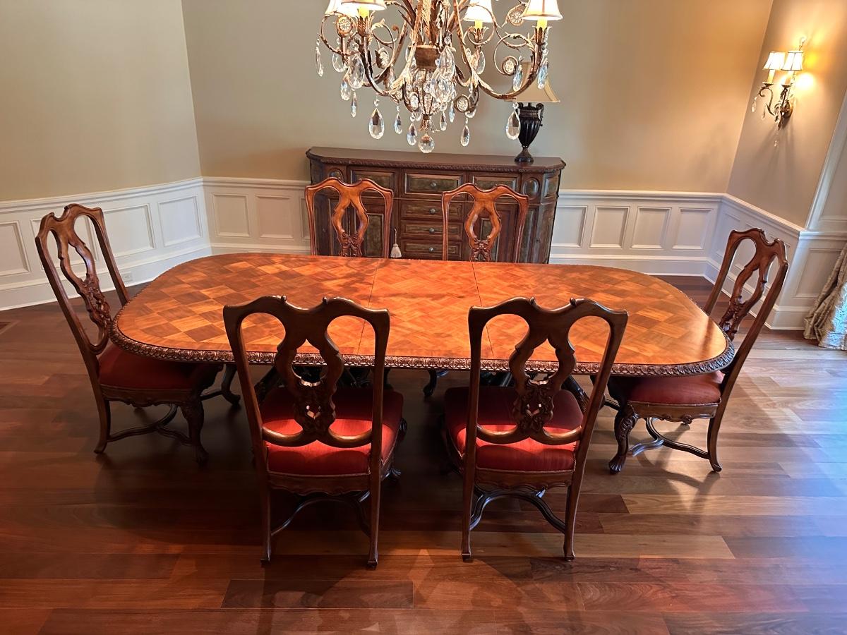Ferguson Copeland “Venetian” Cherry Par-Quet-Top Table and 6 Silk Chairs