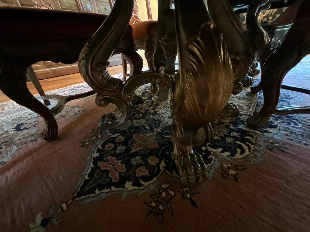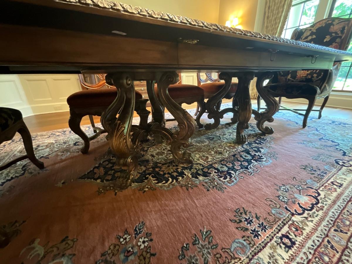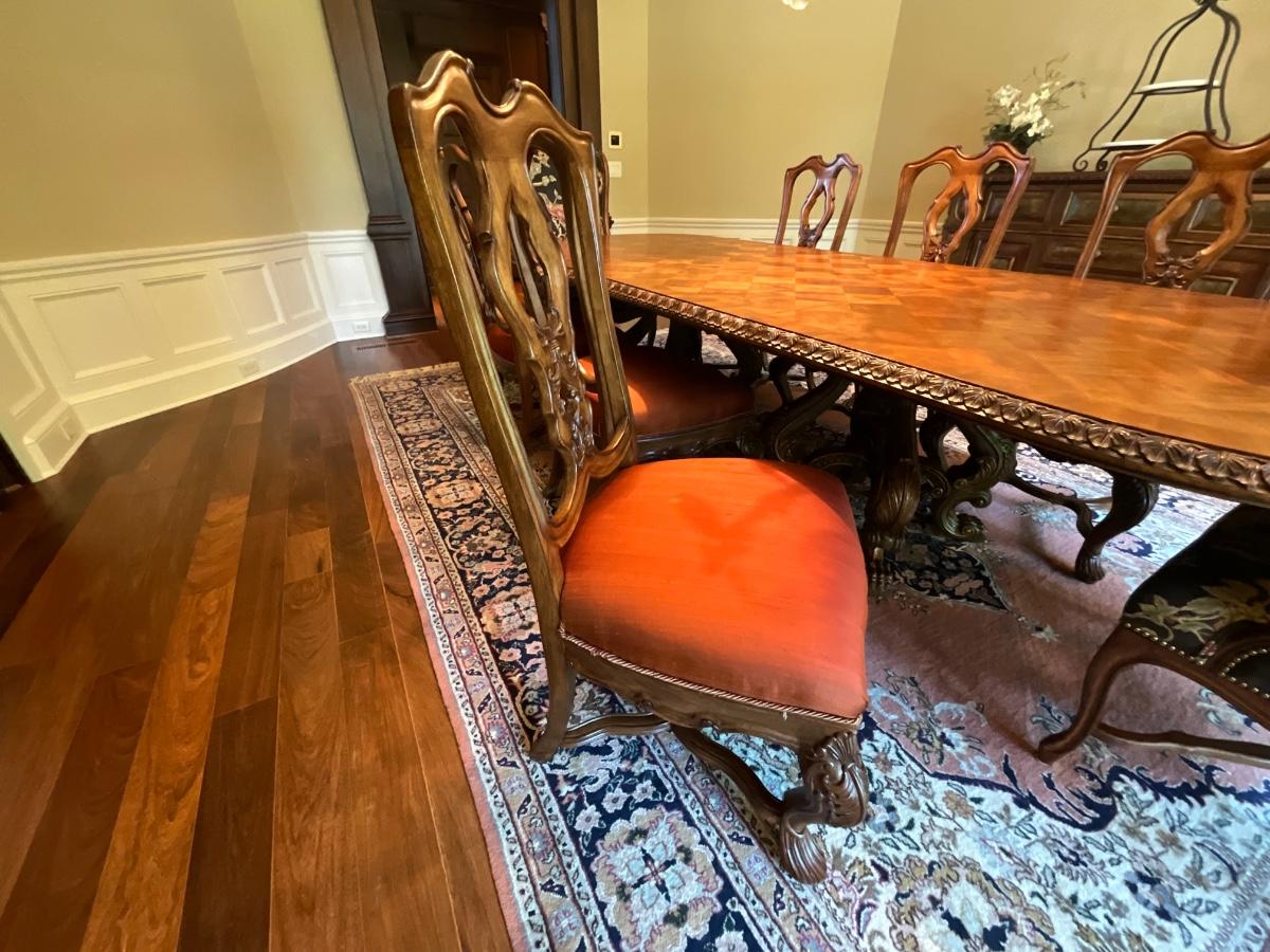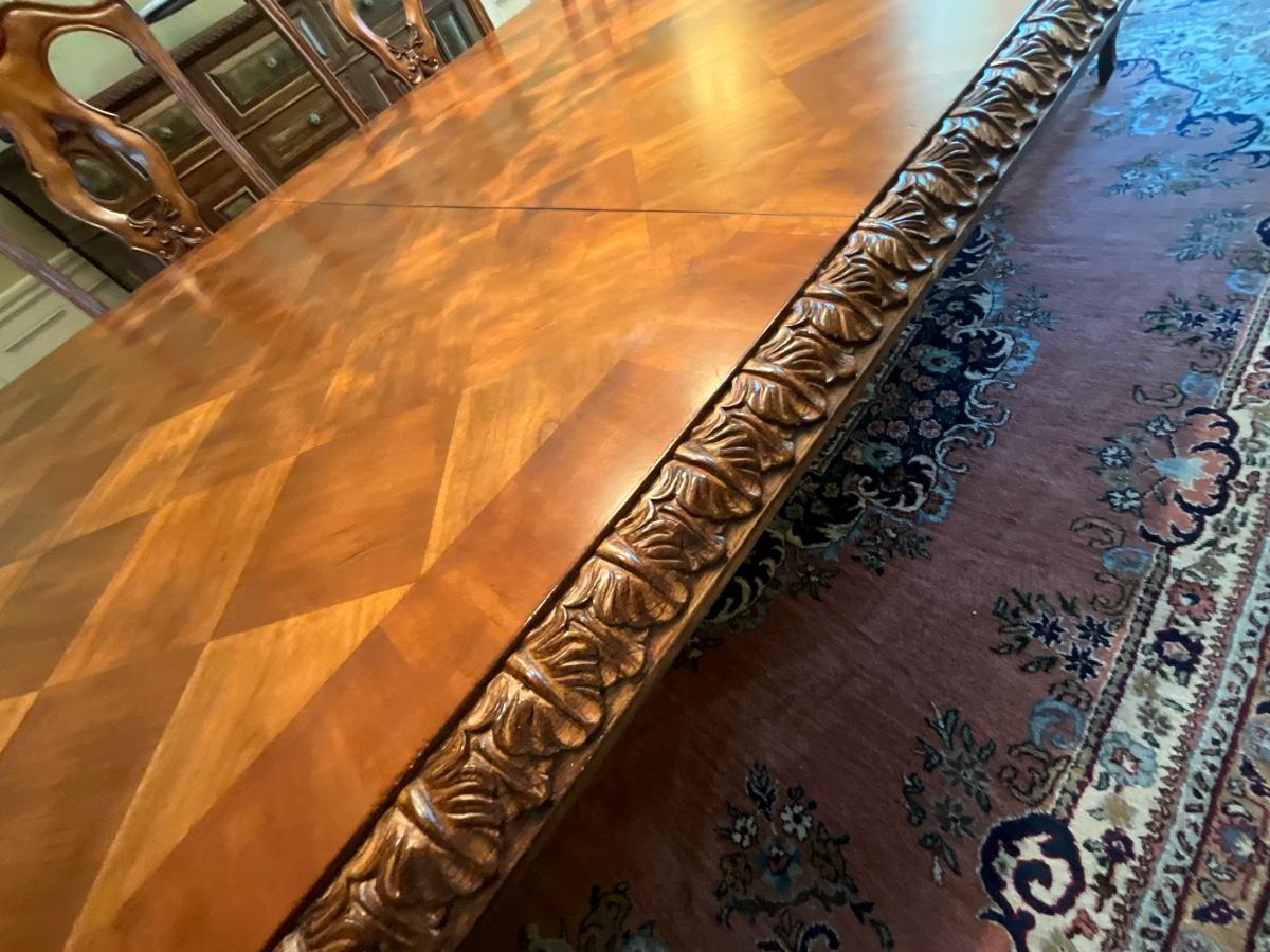 Ferguson Copeland dining room table 126 inches, including the two leafs which are 21 inches each. Width is 50 inches and it’s 30 inches tall. Six silk Ferguson Copeland side chairs. They are 45 inches tall 20 inches deep and 23 inches wide. seat depth is 18 inches and it’s 20 inches from the floor to the seat. Table does not come with the two wing back chairs.