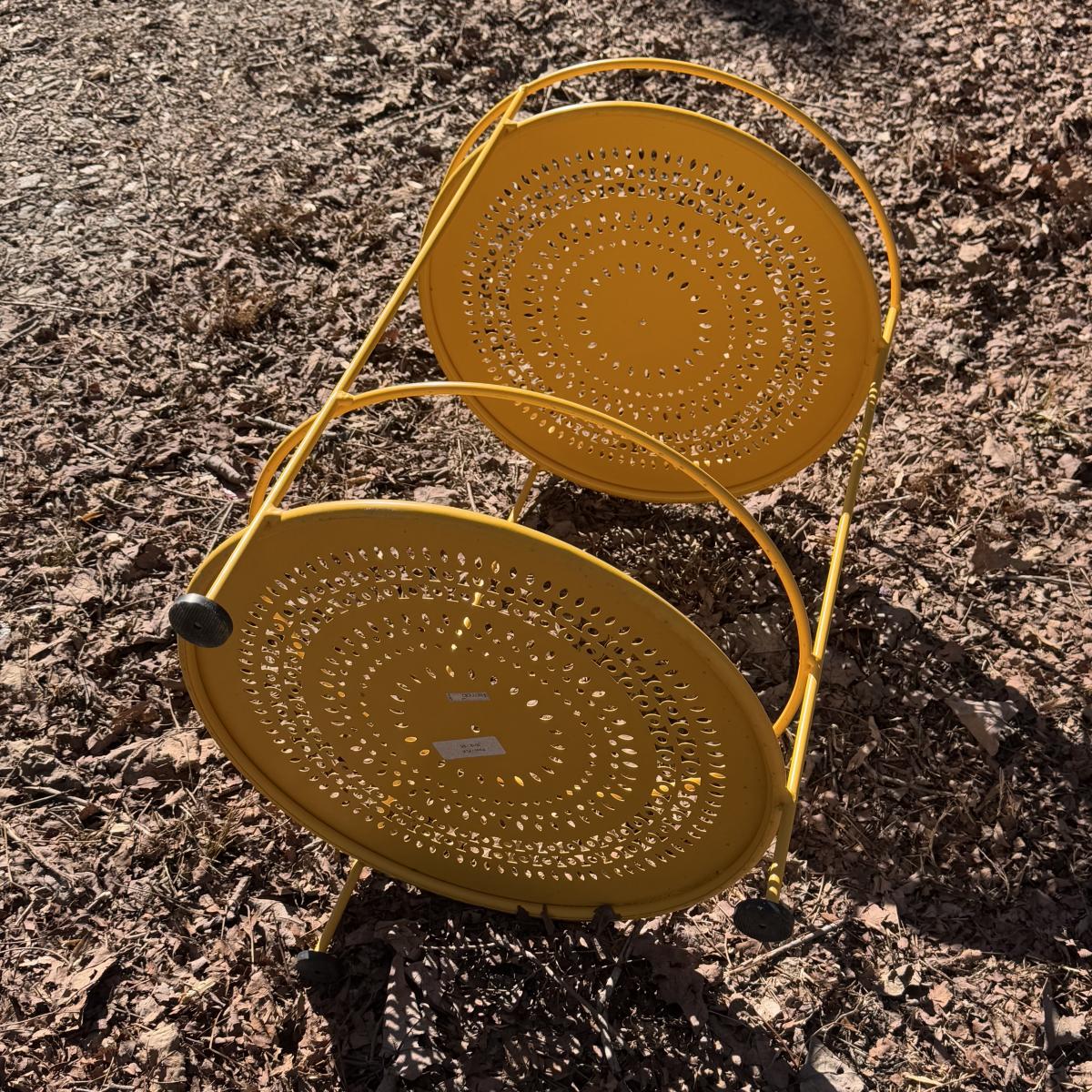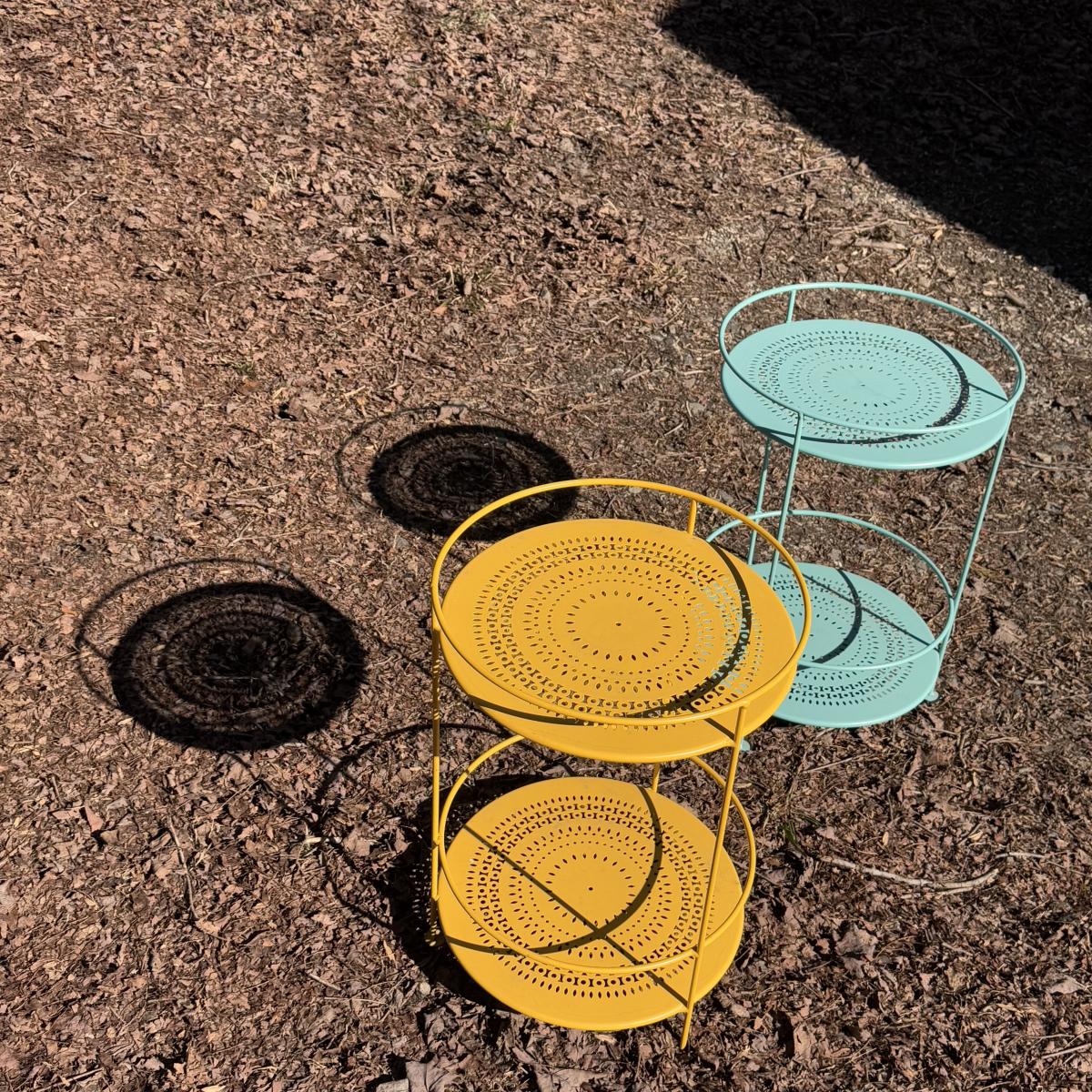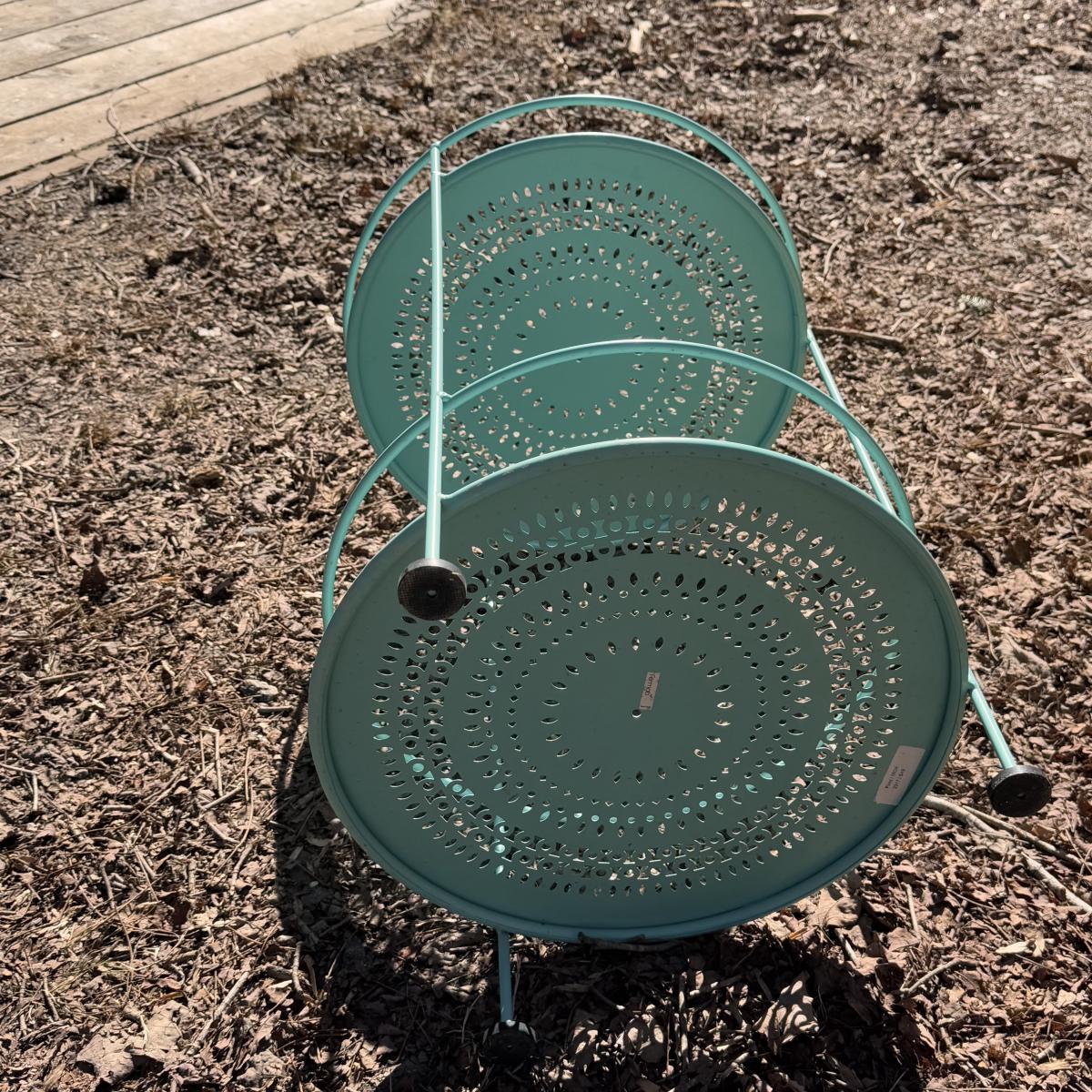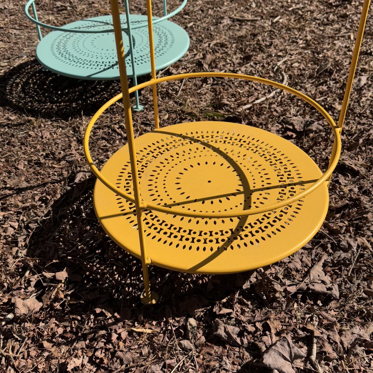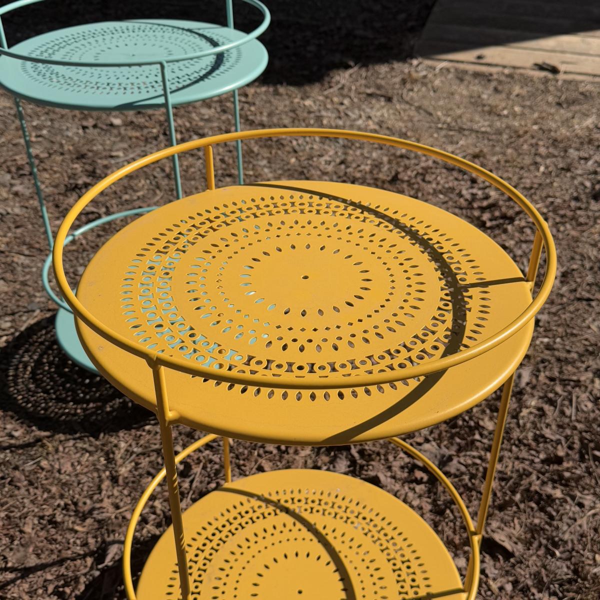 Lot includes two side tables in yellow and blue marked Fermob guinguette. They are made of metal and have a double top. The tables individually measure 16.25”D x 24”H. Local pickup only.