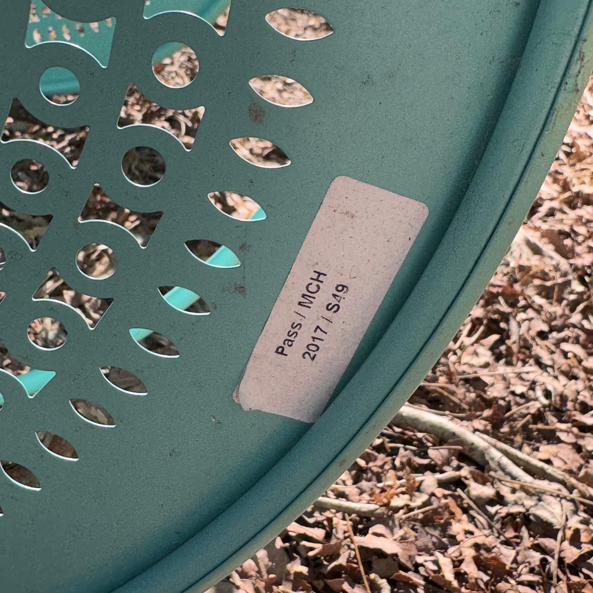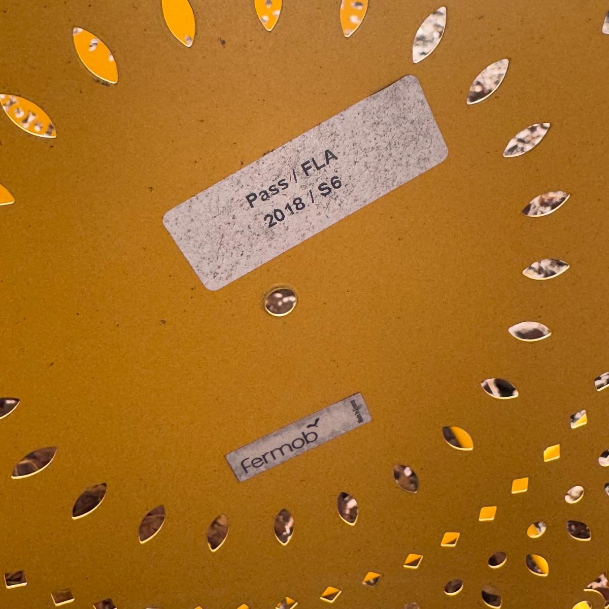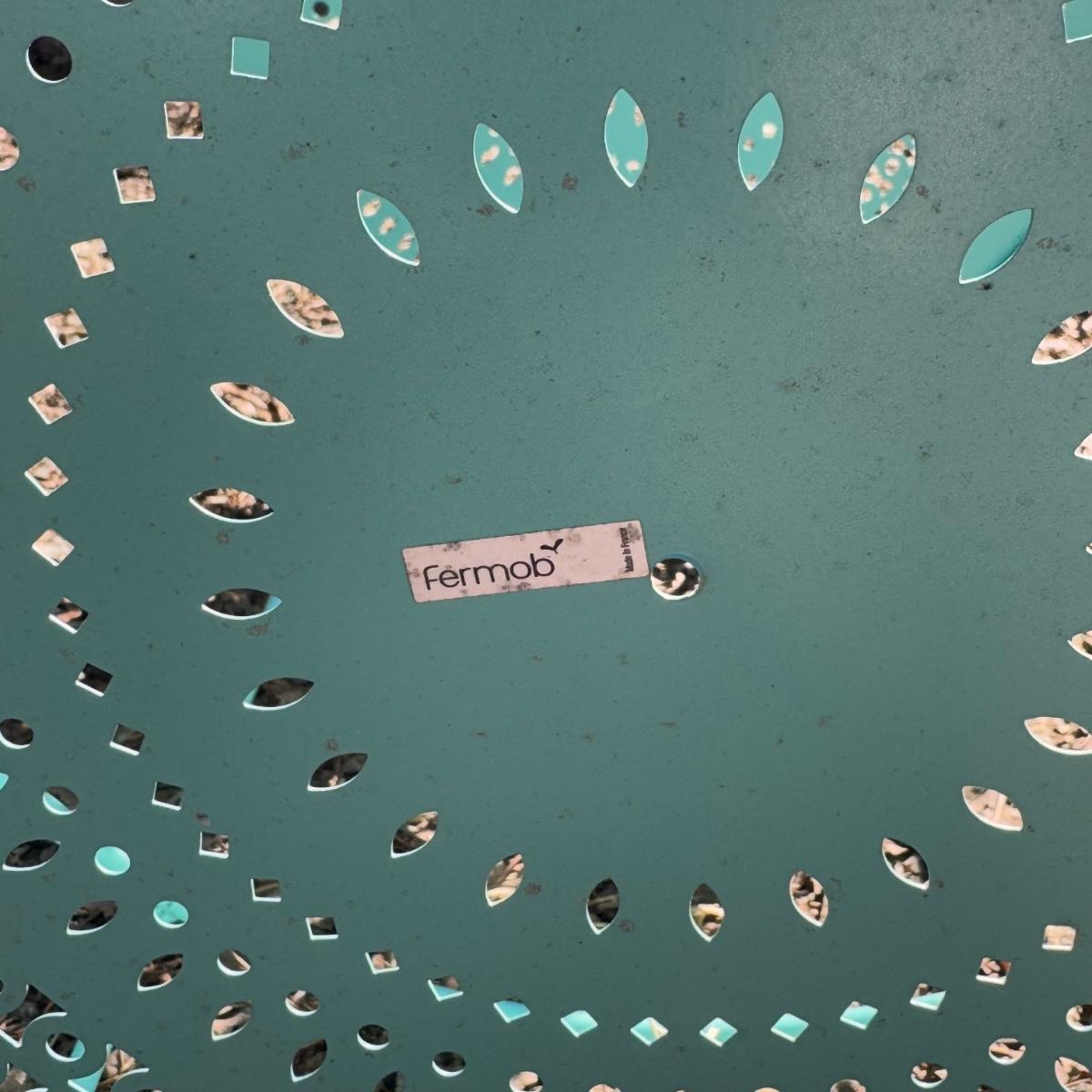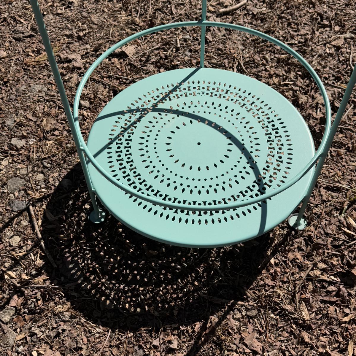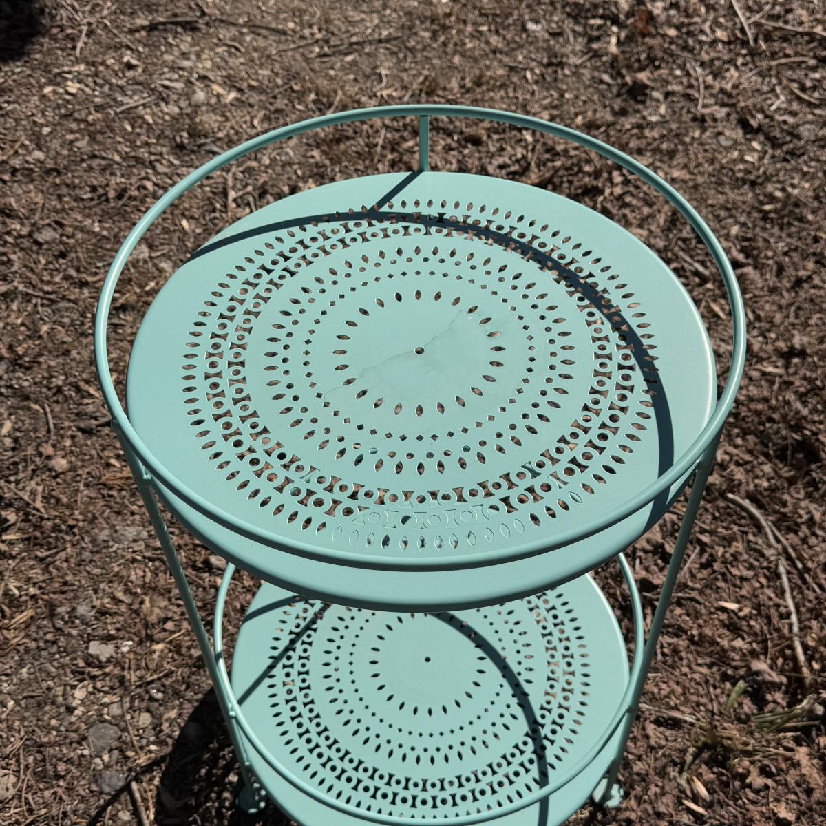 Lot includes two side tables in yellow and blue marked Fermob guinguette. They are made of metal and have a double top. The tables individually measure 16.25”D x 24”H. Local pickup only.