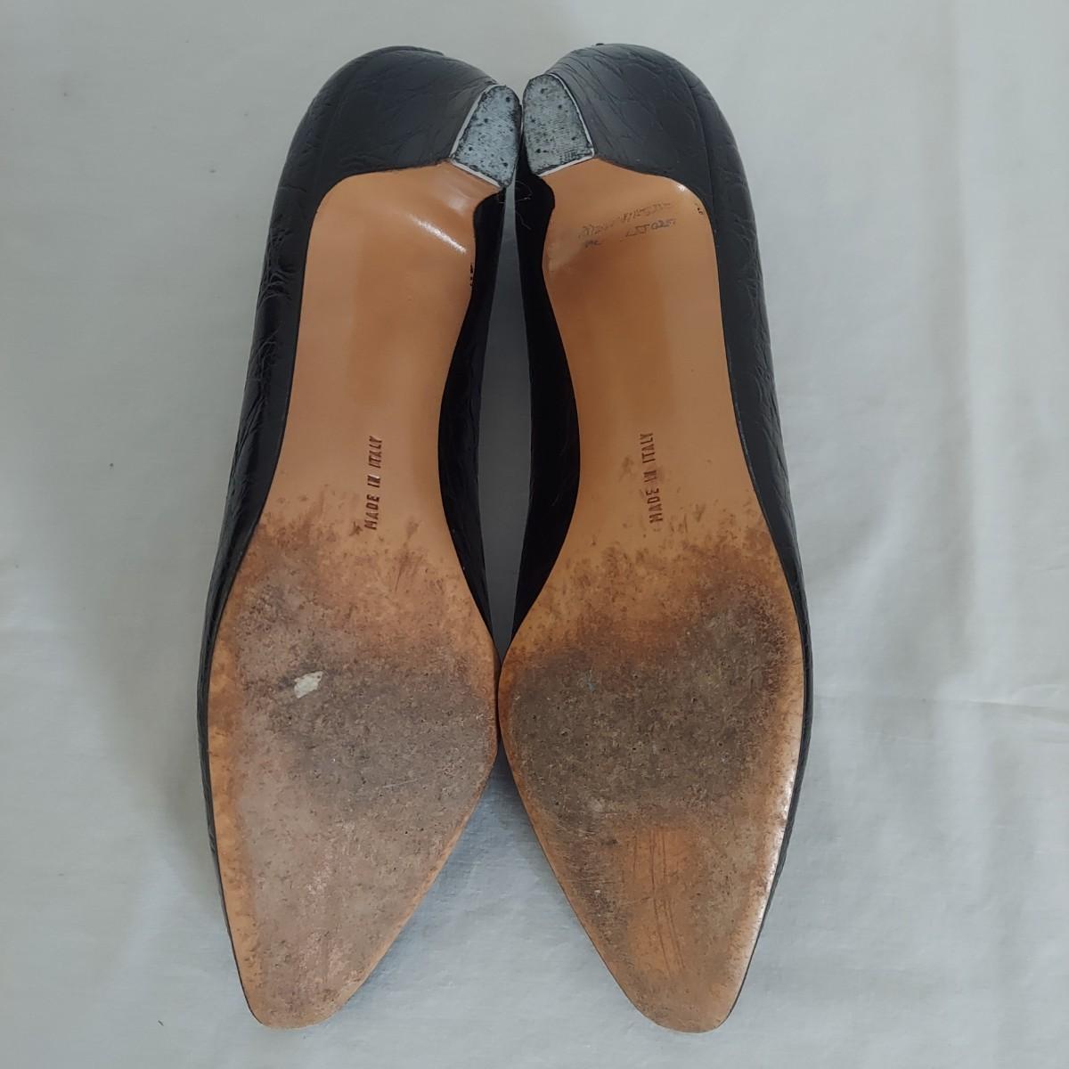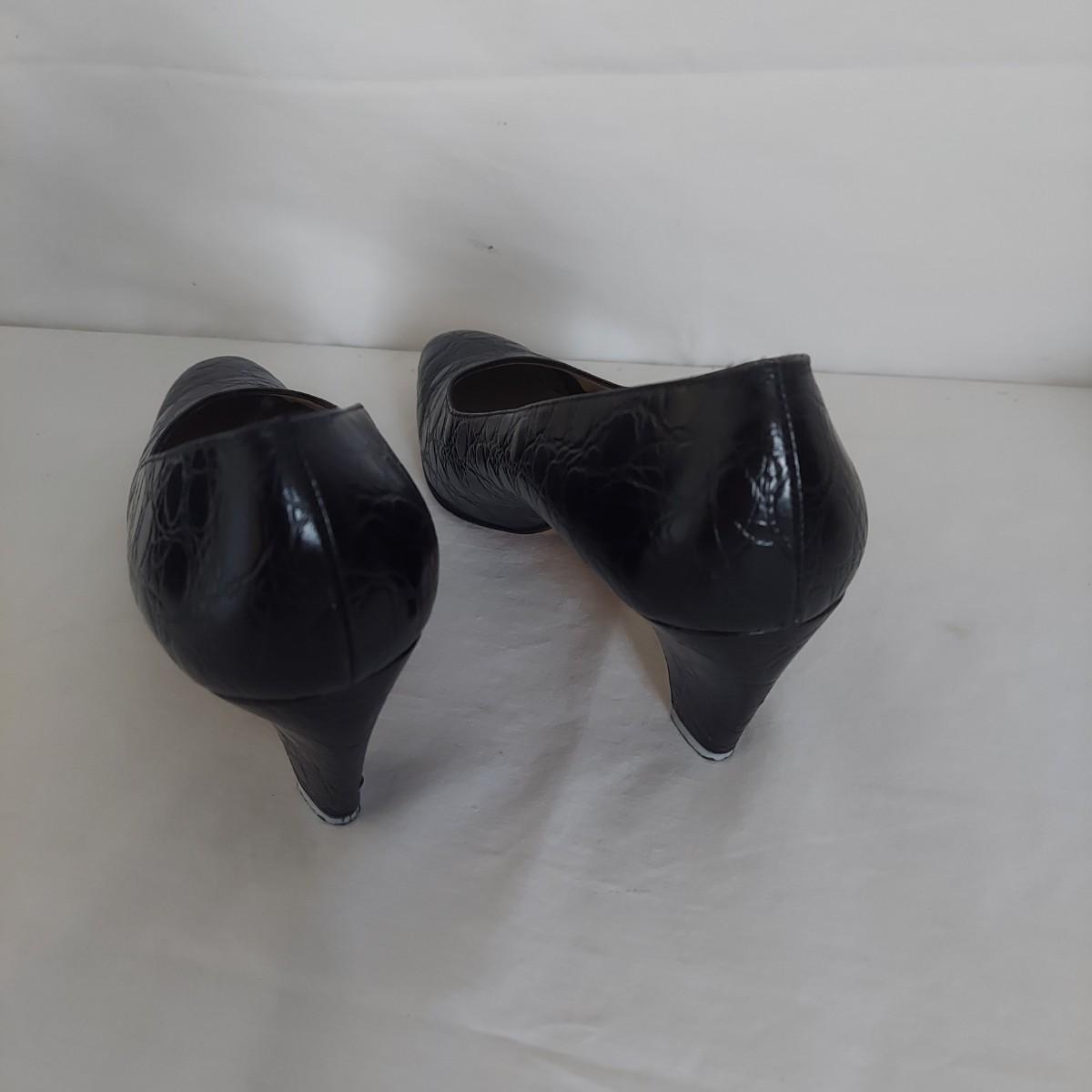 Lot includes one pair of black heels with a reptile embossed leather in size 9.5AA, one pair of navy leather heels in size 9.5AA and a black leather box style purse with two shoulder straps and snap closure. The handle on the bag has been repaired. Please see photos. The bag measures 12" x 5" x 8"H with a strap drop of roughly 10". Shipping available