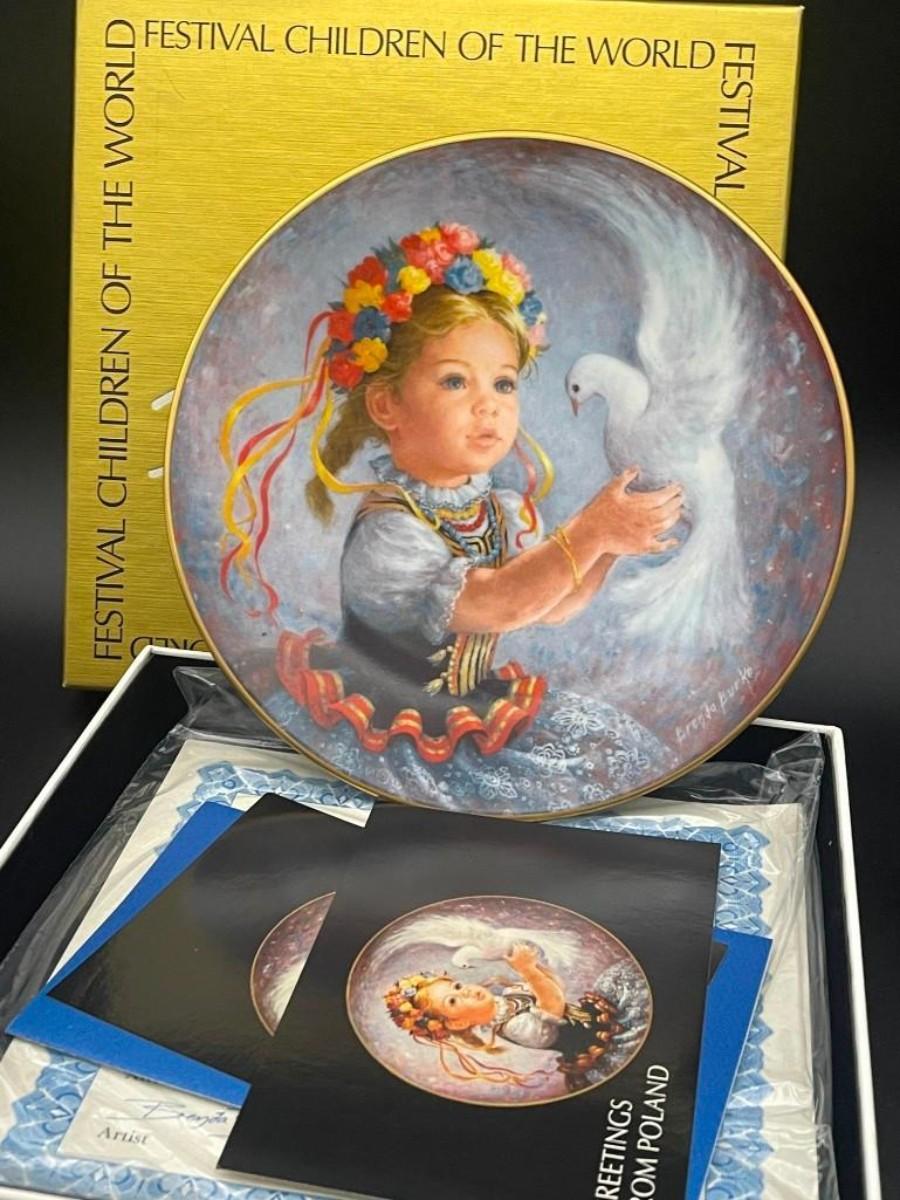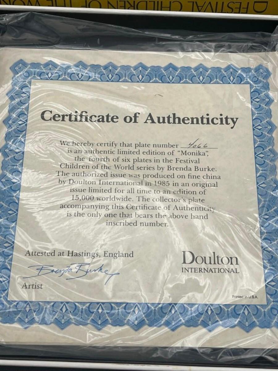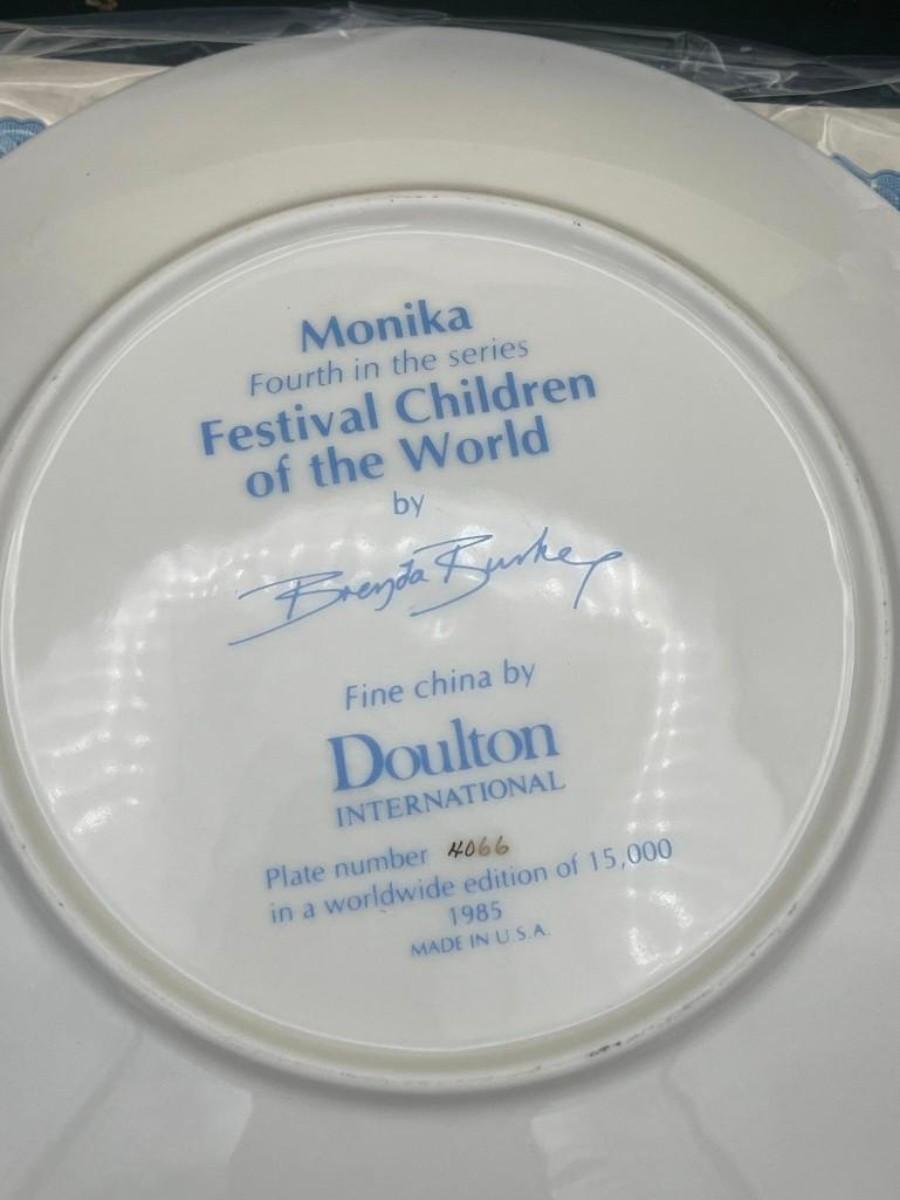 Festival Children of the World" by Doulton International & Royal Doulton. Complete with its original box, & certificate of authenticity, take home Monika from the imagination of Brenda Burke. Monika wears her traditional Scandinavian attire & charming floral headdress. Approx 8 1/2" diameter. # 468