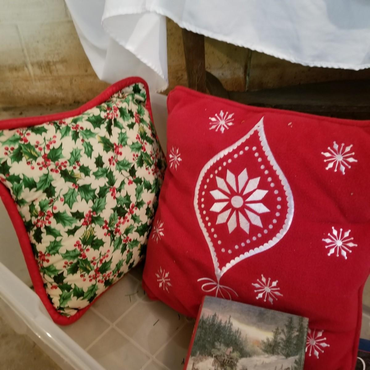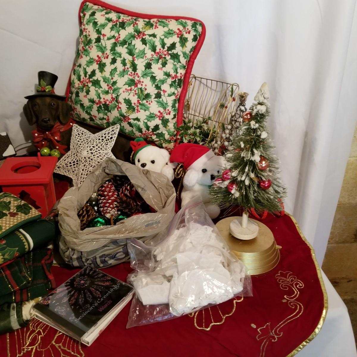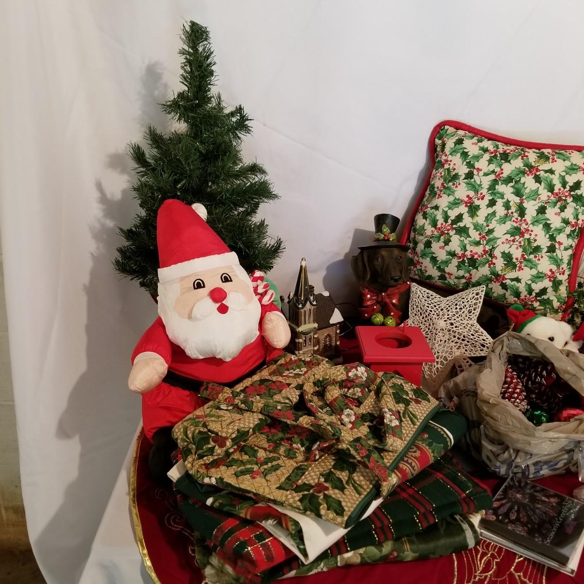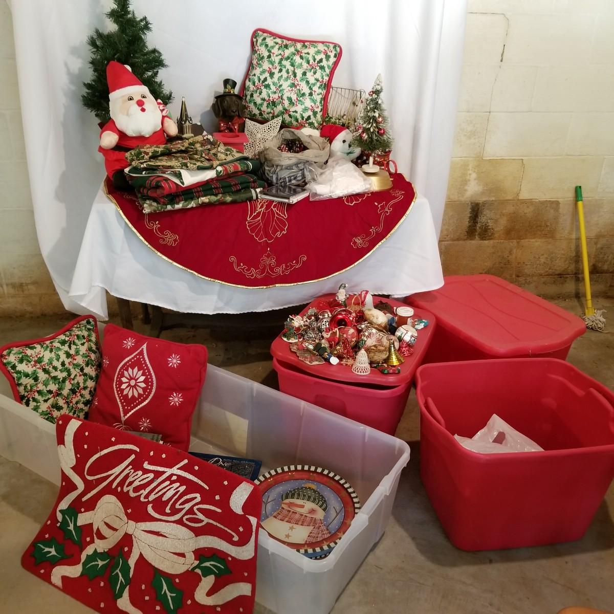 A wonderful holiday collection of decorations, ornaments and more. Over fifty hanging ornaments, several trees, sleighs, pillows, candles, a tree skirt, stuffed plush Santa and more. One lighted church with multi color change led lights. An outdoor welcome mat. Also includes four tablecloths in sizes from 56"x72" to 60"x84". Everything packed in four Christmas storage bins, included. See photos for details. Local pickup only.