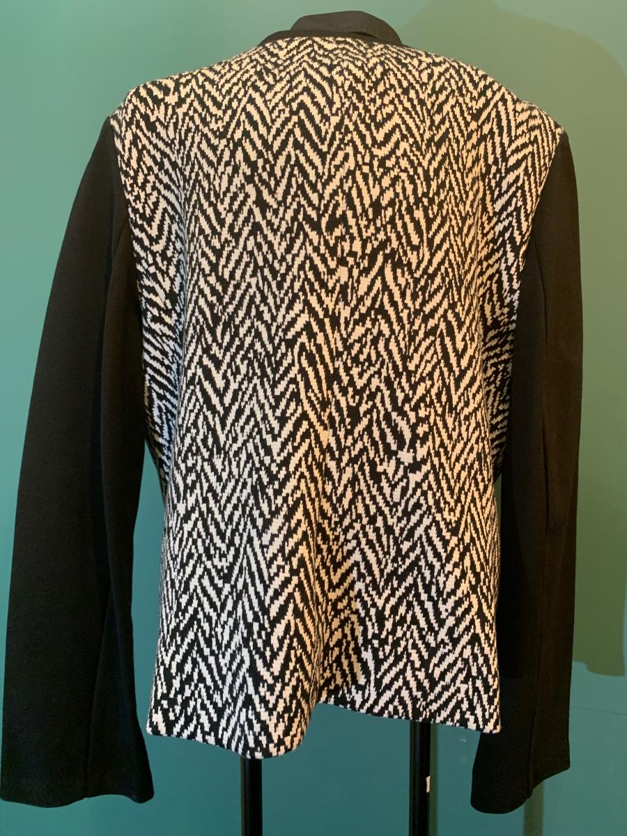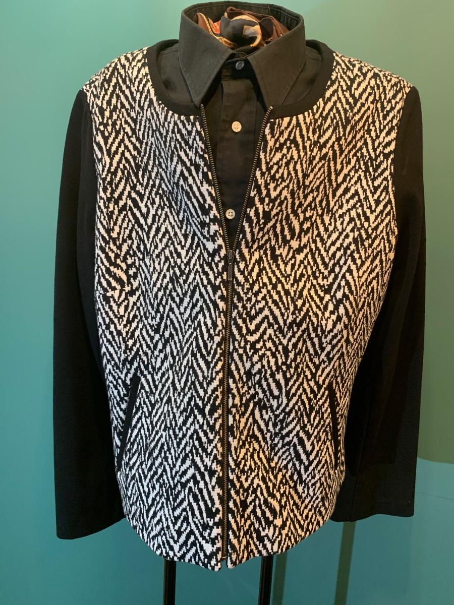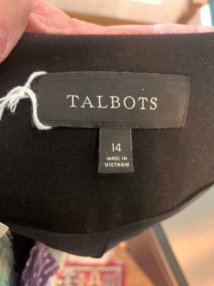 Rev up your holiday style with this edgy Talbots motorcycle jacket. Sized 14, it features a striking black and white pattern with sleek black sleeves. The zipper detail adds a touch of attitude, making it a versatile and festive piece for your wardrobe. Embrace the bold contrast and distinctive design, showcasing your fashion-forward sensibility with a dash of holiday flair. Accessories not included,