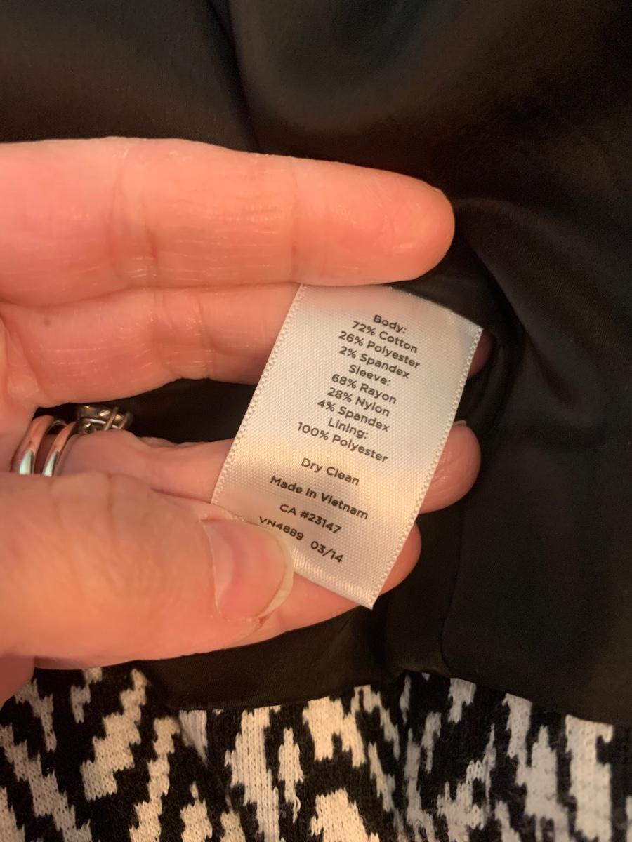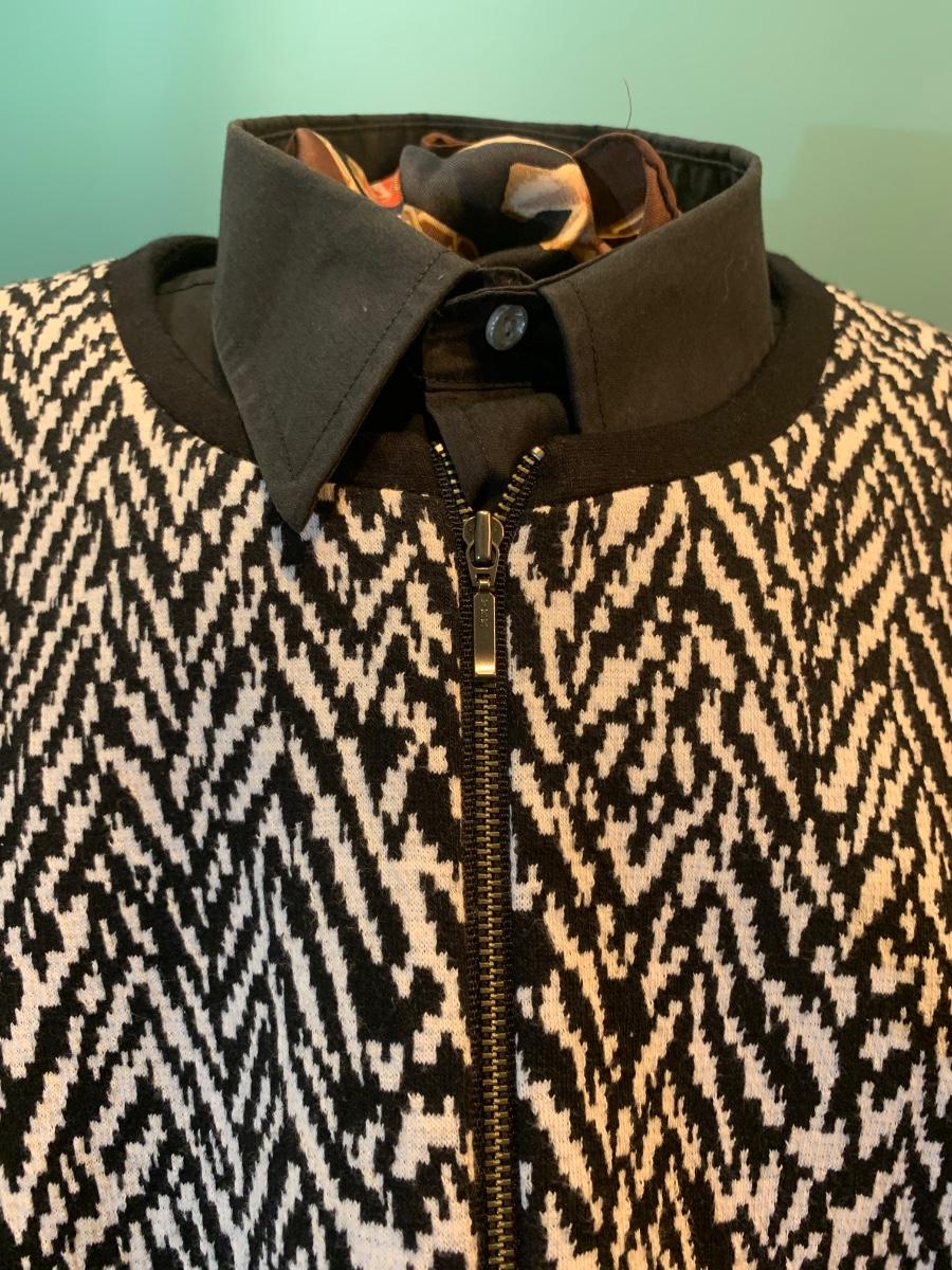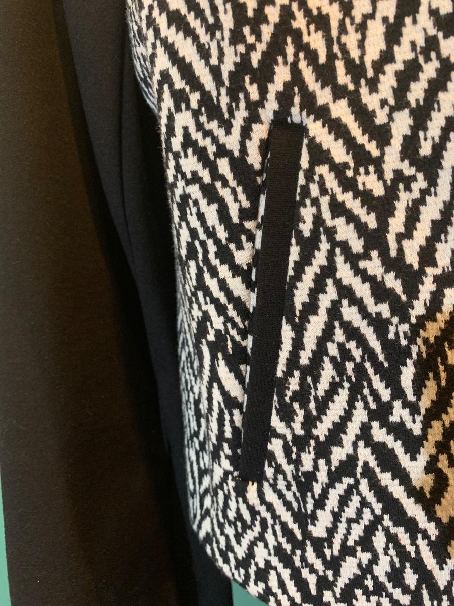 Rev up your holiday style with this edgy Talbots motorcycle jacket. Sized 14, it features a striking black and white pattern with sleek black sleeves. The zipper detail adds a touch of attitude, making it a versatile and festive piece for your wardrobe. Embrace the bold contrast and distinctive design, showcasing your fashion-forward sensibility with a dash of holiday flair. Accessories not included,