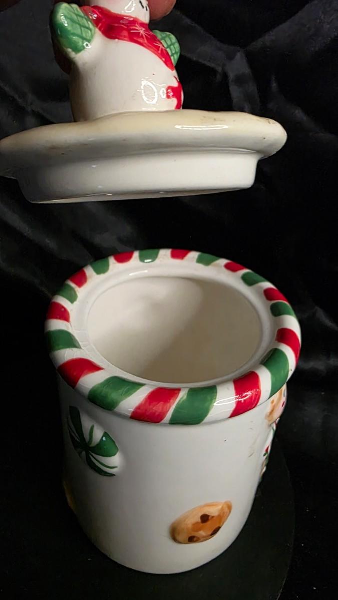 This cookie jar is ideal for storing holiday cookies, candies, treats, or even kitchen essentials while doubling as an eye-catching decorative accent. Whether you’re hosting Christmas gatherings, creating a winter-themed kitchen display, or gifting a fellow baker, this charming piece fits right in. It captures the heartwarming, homemade spirit of the holidays — the perfect blend of Christmas décor, kitchen collectibles, and festive storage.