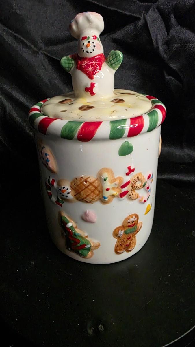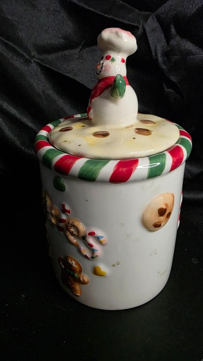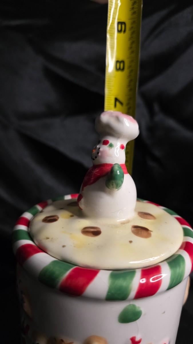 Add a delightful touch of holiday charm to your kitchen with this whimsical ceramic Snowman Chef Cookie Jar, a perfect blend of festive fun and nostalgic Christmas décor. Standing approximately 9 inches tall (see photos), this adorable jar features a cheerful snowman wearing a chef’s hat and mittens, perched atop a candy-striped lid decorated with chocolate-chip “cookies.” The body of the jar is adorned with raised, hand-painted gingerbread men, cookies, sprinkles, candy canes, and holiday treats, giving it a warm and playful baked-goods theme that instantly brightens any countertop.