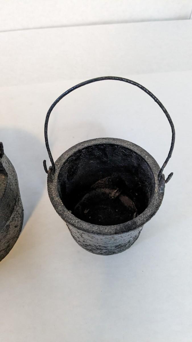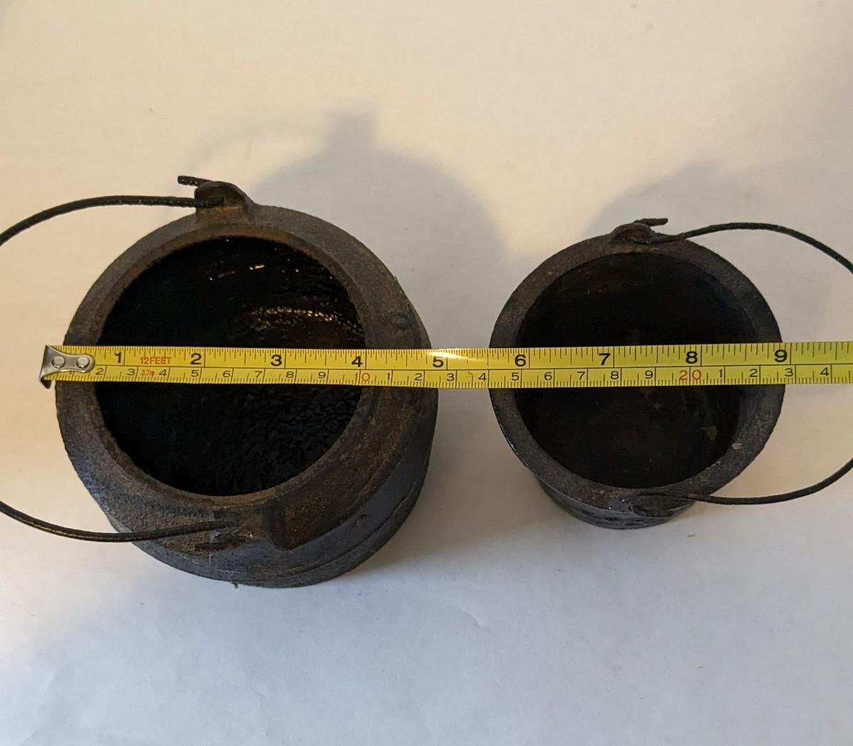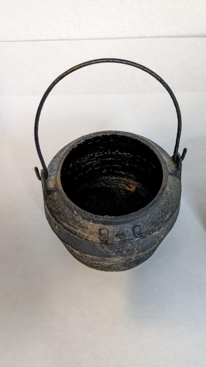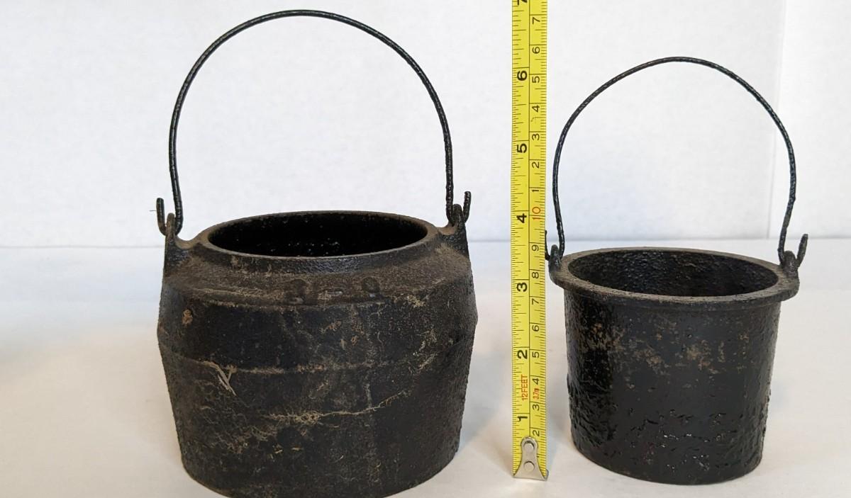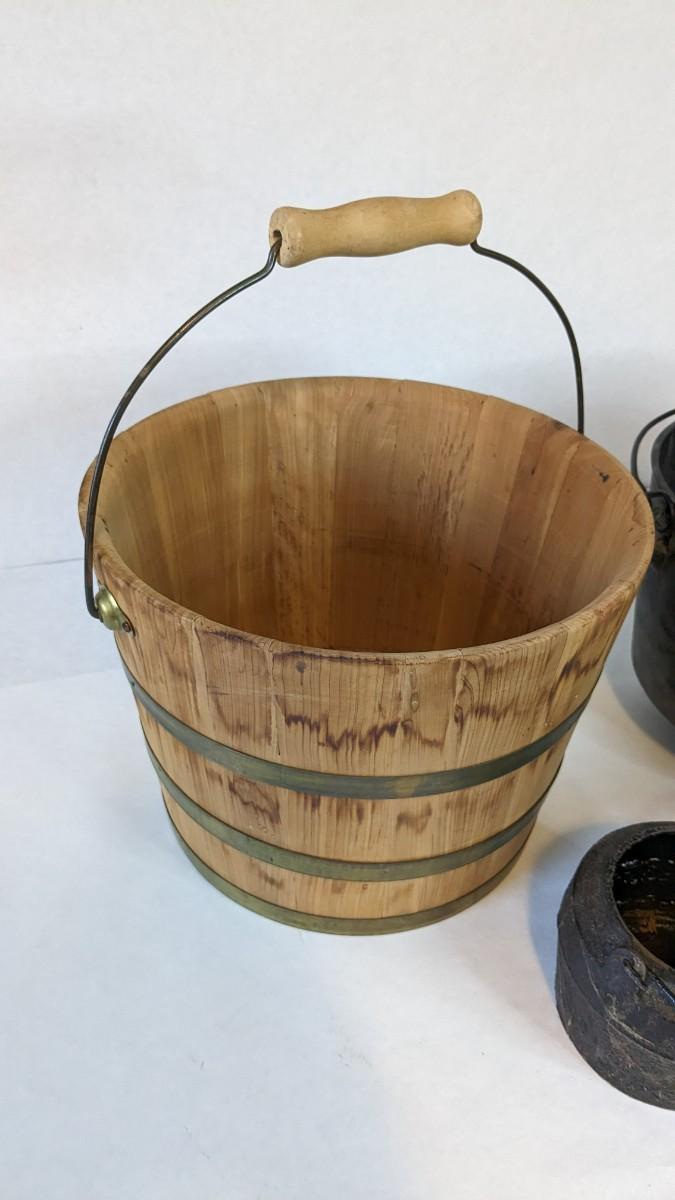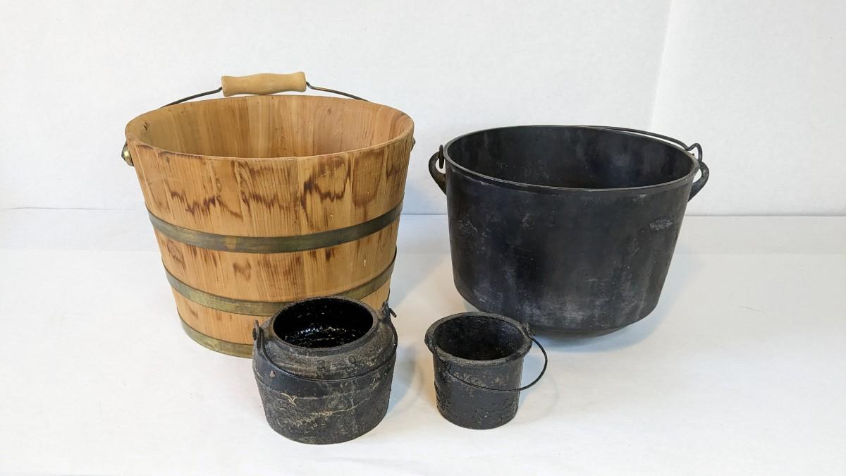 Three cast iron and one wood with brass bands buckets/pails. Wood piece shows very minor wear for age with most seams still tightly joined. Cauldron is marked with number 8 on the bottom and is in fantastic condition with no rust noted and only signs of heat to exterior. Two small camp cookers with no lids and no makers marks with varied stages of wear. No holes and nothing rusted through. This is a heck of a find!
