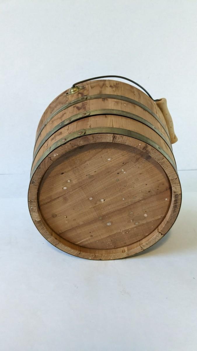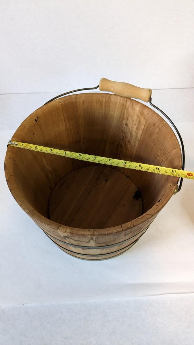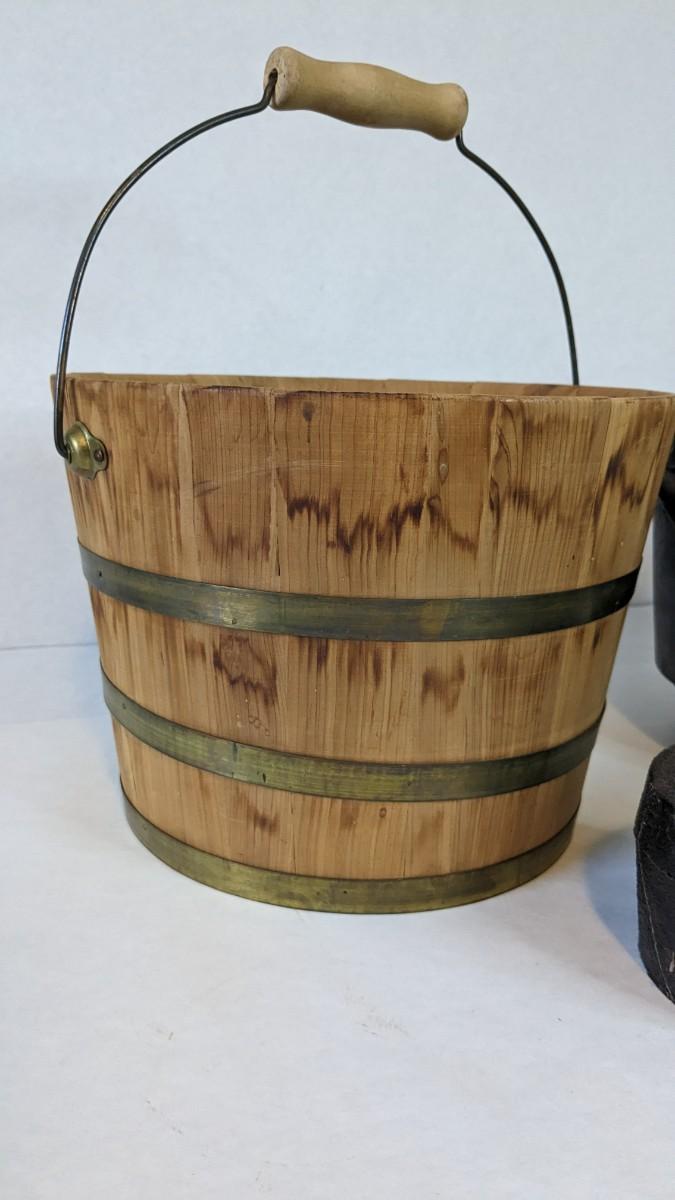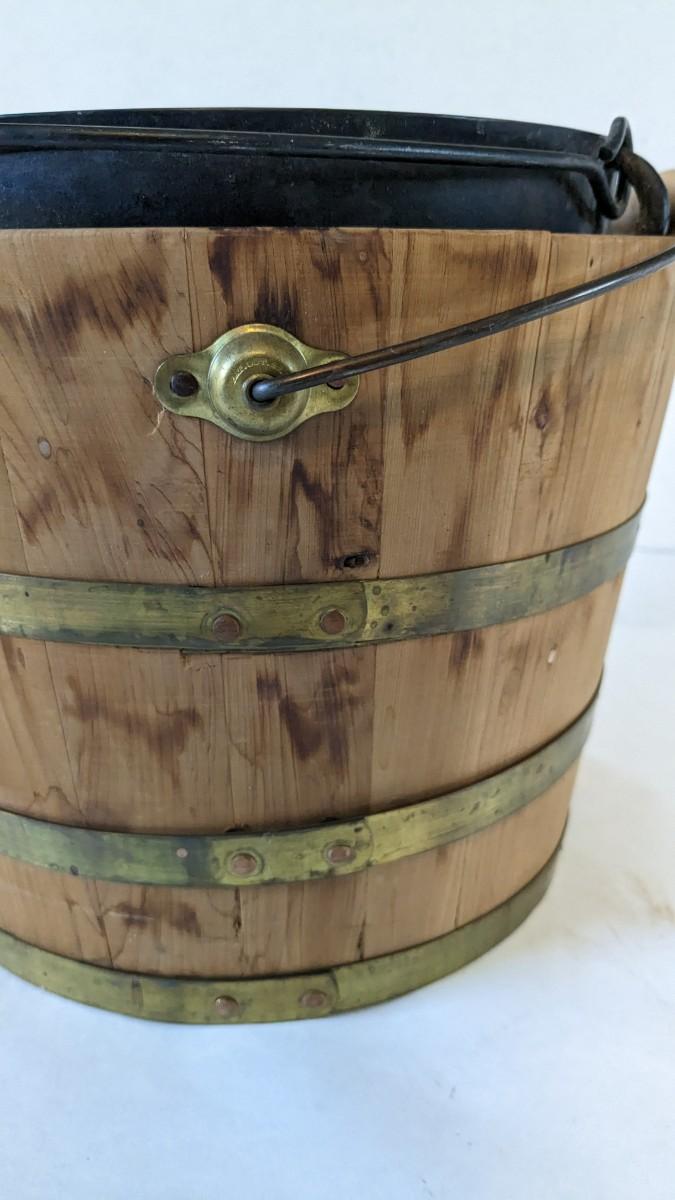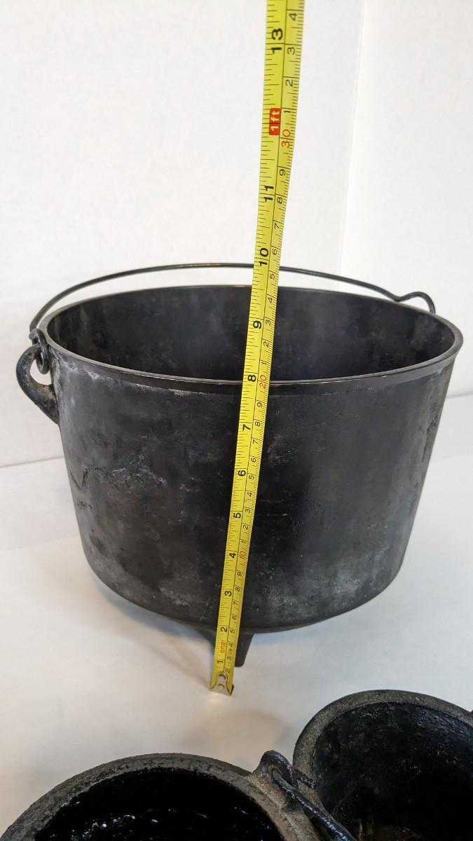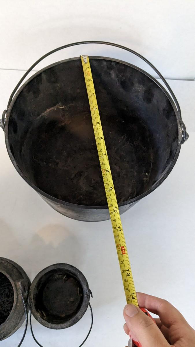 Three cast iron and one wood with brass bands buckets/pails. Wood piece shows very minor wear for age with most seams still tightly joined. Cauldron is marked with number 8 on the bottom and is in fantastic condition with no rust noted and only signs of heat to exterior. Two small camp cookers with no lids and no makers marks with varied stages of wear. No holes and nothing rusted through. This is a heck of a find!