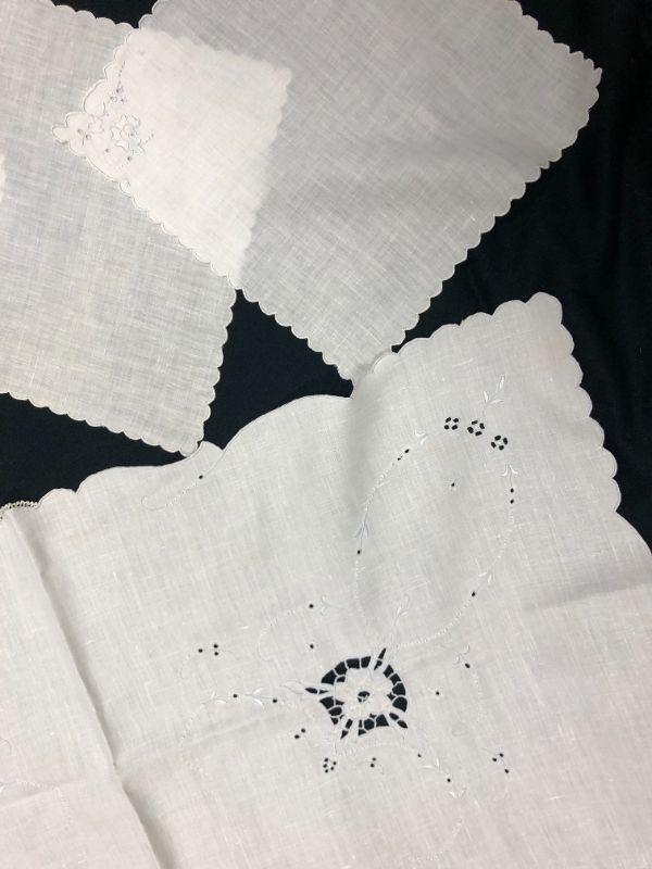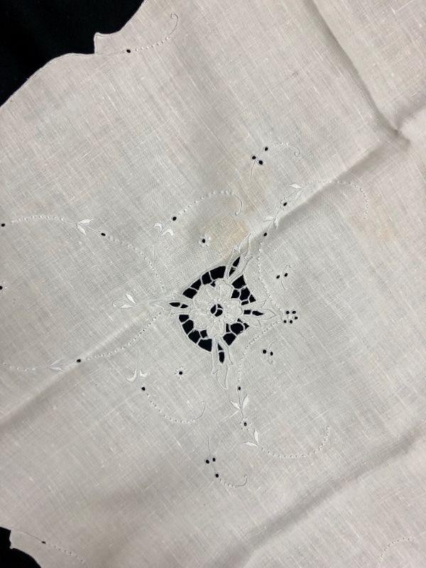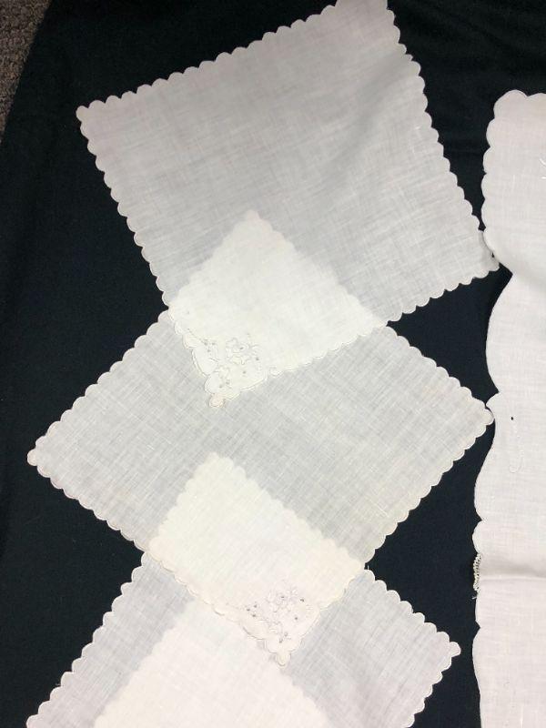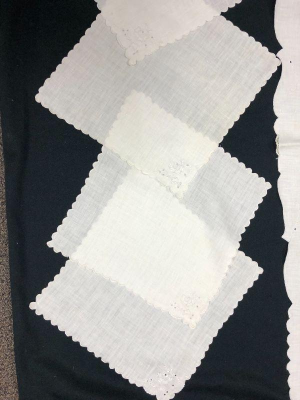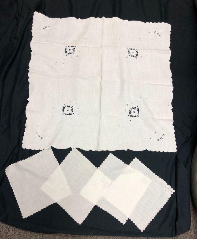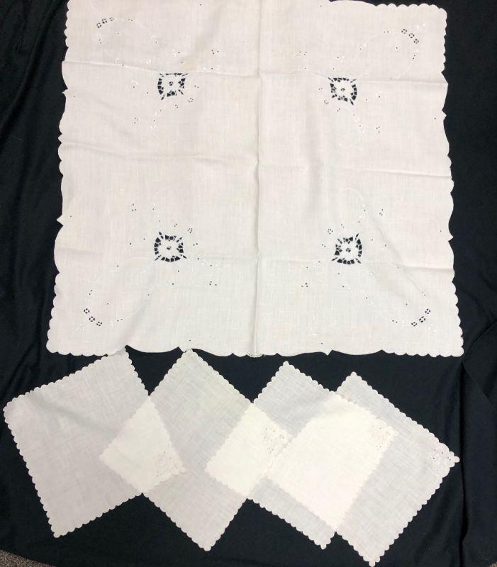 Vintage square tablecloth & napkin set. Tablecloth is white linen with a bright white stitching details. Napkins are also white linen, but the stitching isn't quite the same color white. The patterns do seem to match. No holes. Tablecloth is roughly 33", there is some light spots & discoloration. Napkins are 11".