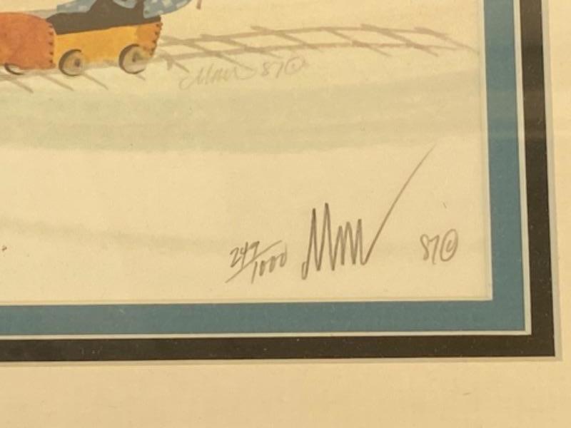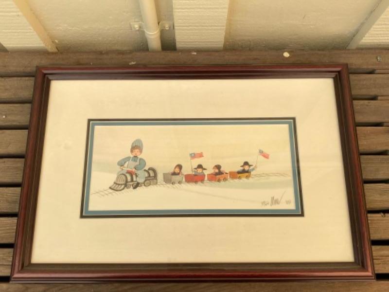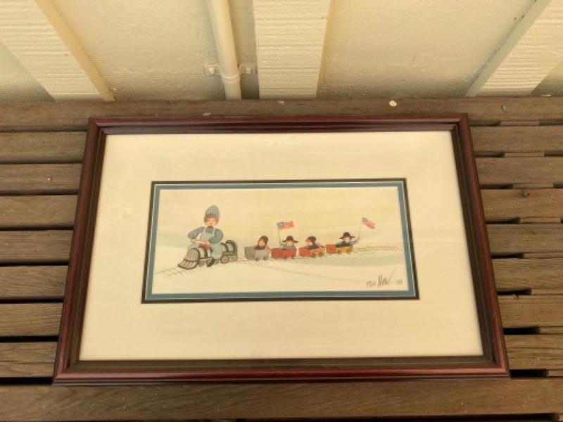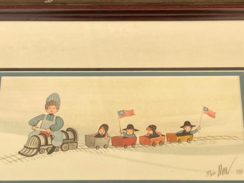 1987 Limited Edition P Buckley Moss print, framed, ALL ABOARD Woman driving train, EDITION #249/1000, 13" X 19"