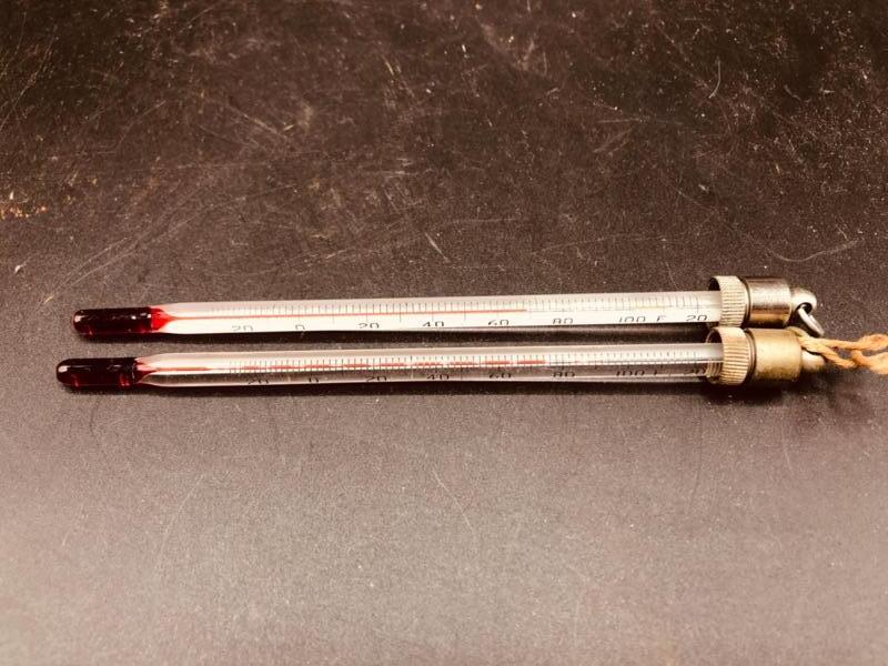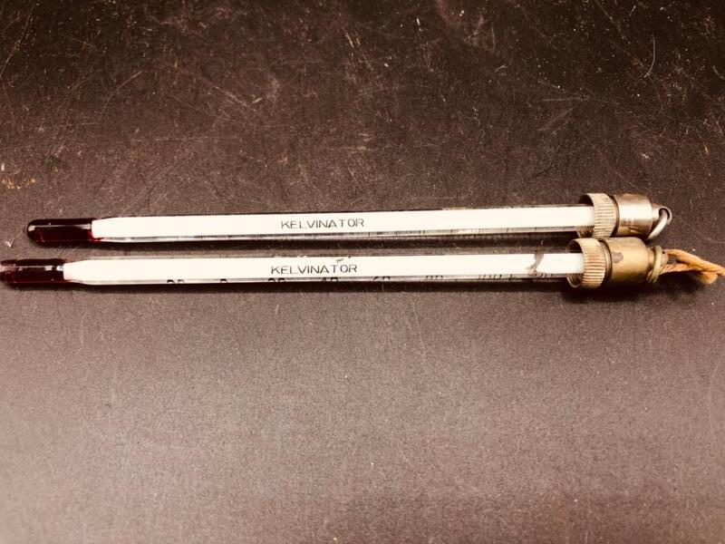 Vintage Kelvinator thermometers. Metal end has loop for hanging. Not for medical use.