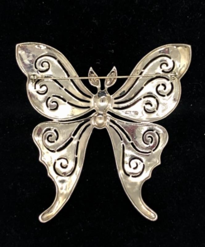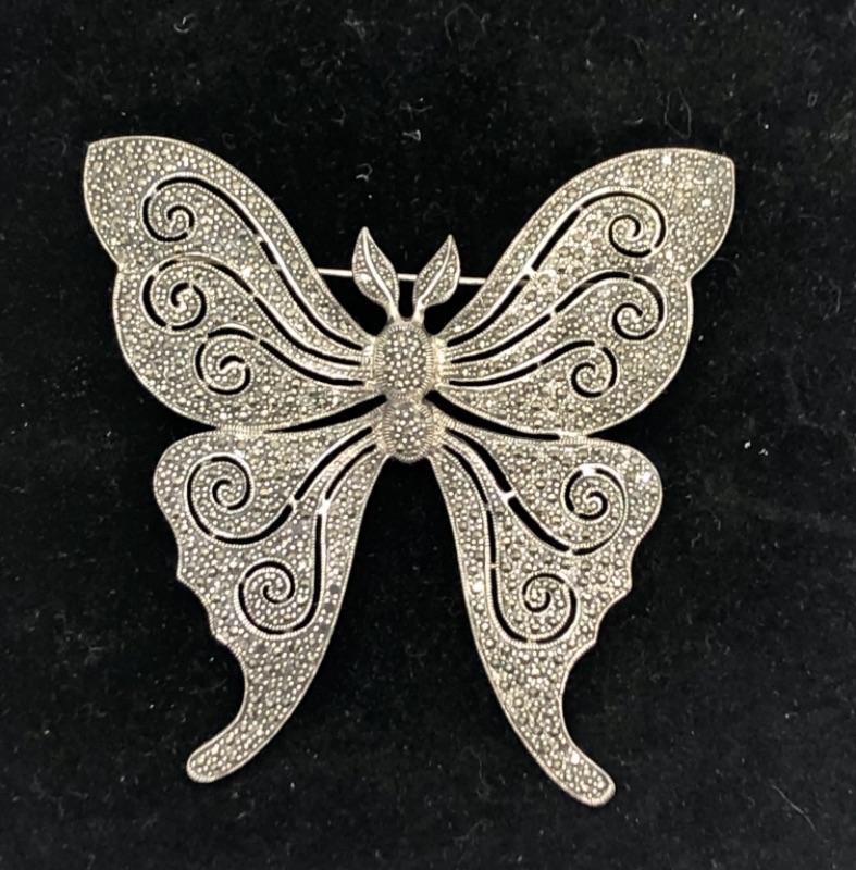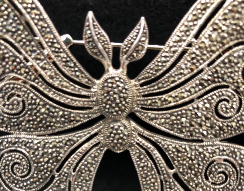 Large sterling silver & marcasite butterfly brooch. About 3.5" wide and long. Great sparkle with the marcasite. Back is stamped 925 Thai.