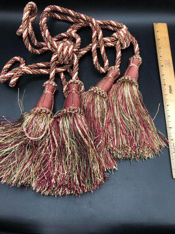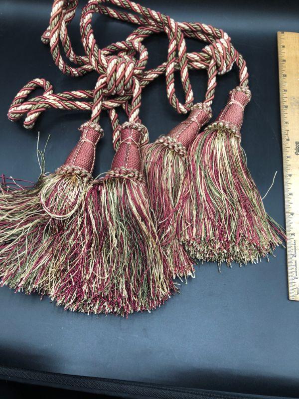 Curtain tieback pair, a combination of red, gold, and green threads. Tassels are approx. 9" long, overall length is approx 25".