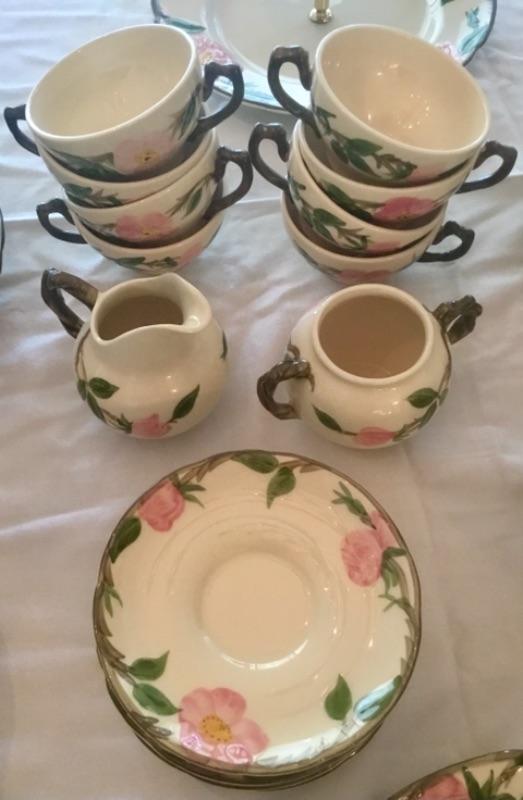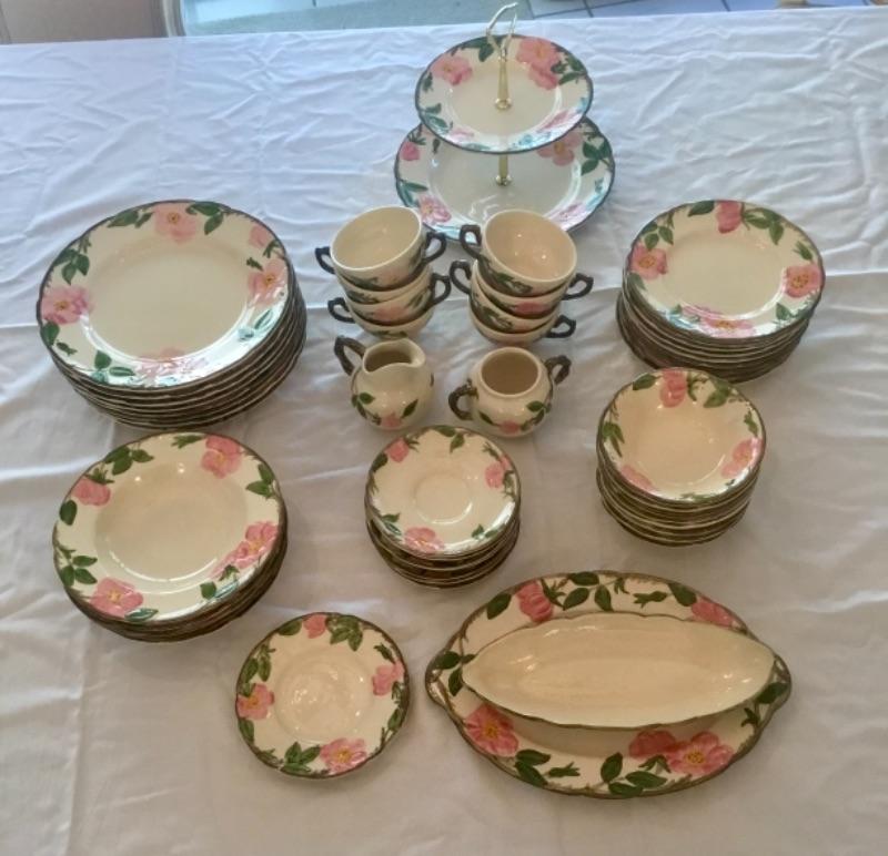 51 piece set: (8) 10.5" dinner plates, (5) 8.5" bowls, (7) 6" saucers, (8) 6" small bowls, (9) 8" salad plates, (8) 4 inch tea cups, (1 pair) of creamer and sugar bowl with no lid, (1) two-tier dessert plate 10.5" & 8" plates, 1 11" x 4.5" serving dish, (1) 13" platter, (1) oblong serving bowl