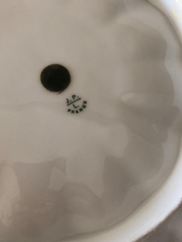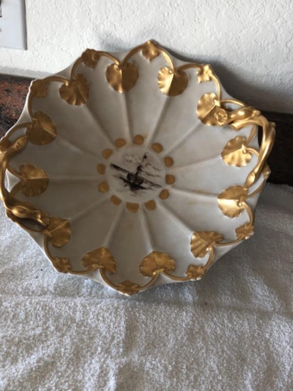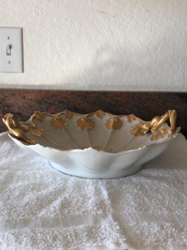 Jean Pouyat J.P. Limoges hand painted bowl. Large, gold gilt leaves and handles, ship on the water painting in the center. A little dusty from display but In good condition.