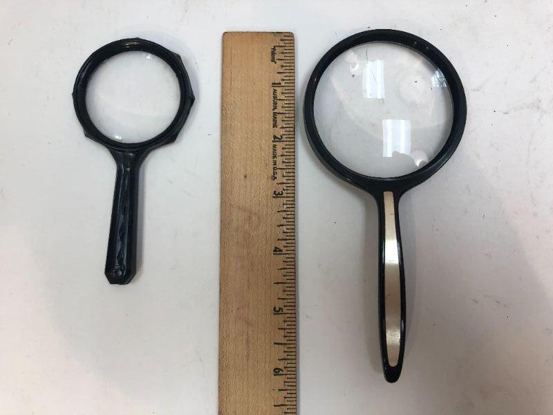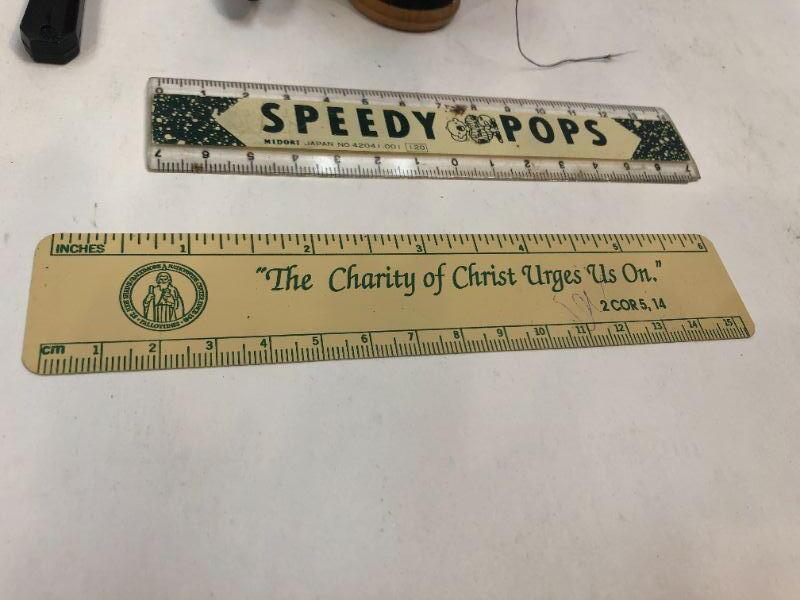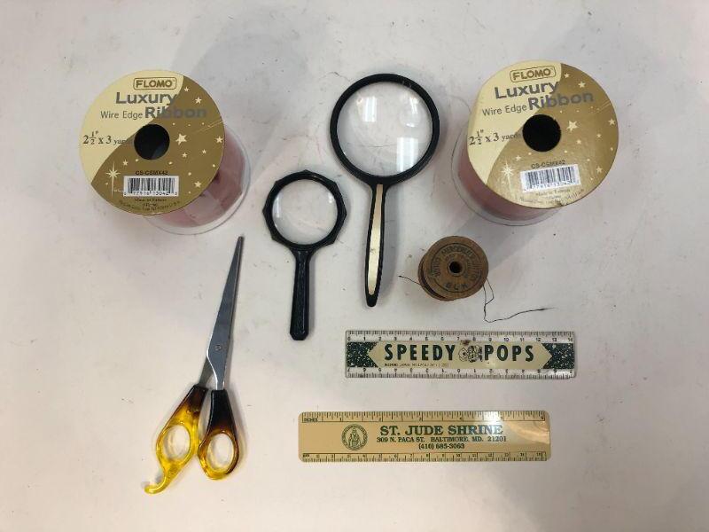 Random craft tool supply lot. Scissors, small rulers, ribbon, thread and magnifying glasses. #022-0429