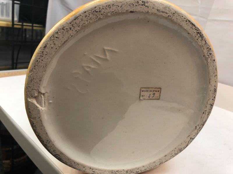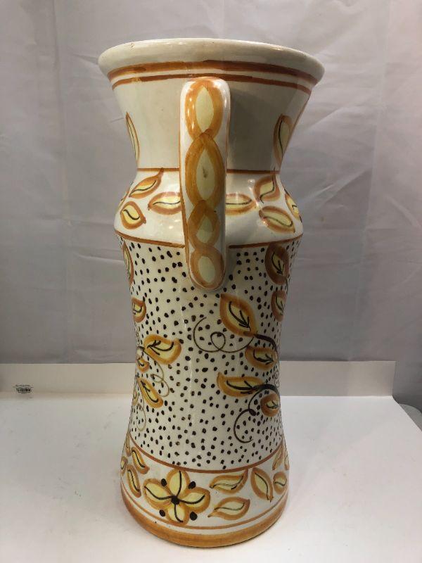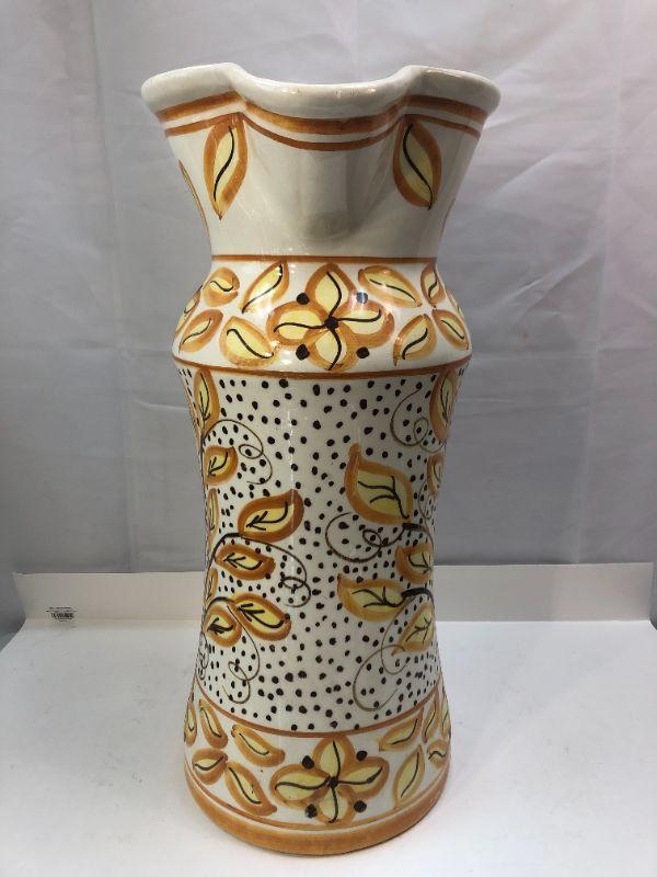 Made in Spain heavy ceramic oversized pitcher. Stands about 20" tall, great for display. Yellow/ orange floral leaves pattern. Marked on bottom.