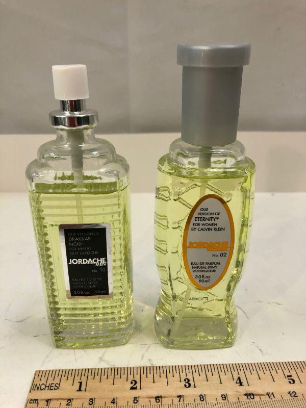 Jordache cologne for men and women. Their version of Drakkar Noir for men and Eternity by Calvin Klein. Drakkar is missing cap. Both bottles are almost full. #022-0462