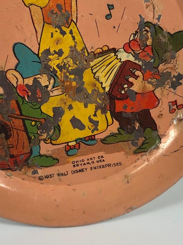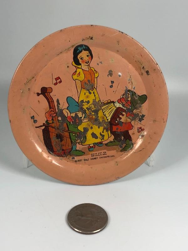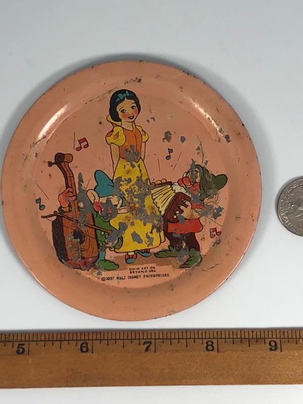 Antique, dated 1937 Snow White and the Seven Dwarfs litho tin plate. From an Ohio Art Co. children's tea set. Only have the one plate. There is obvious scratches and wear but it is still displayable. 4" size. #499a42