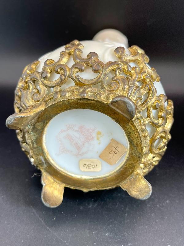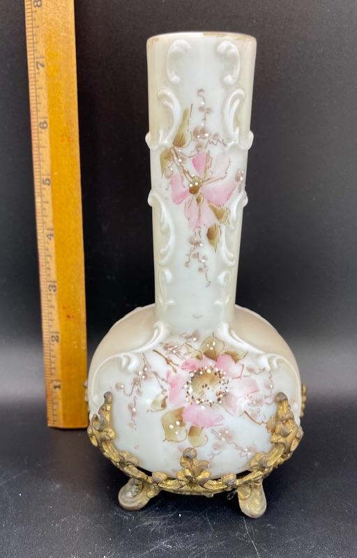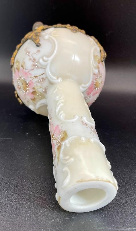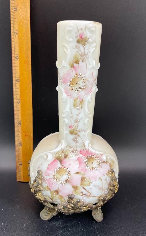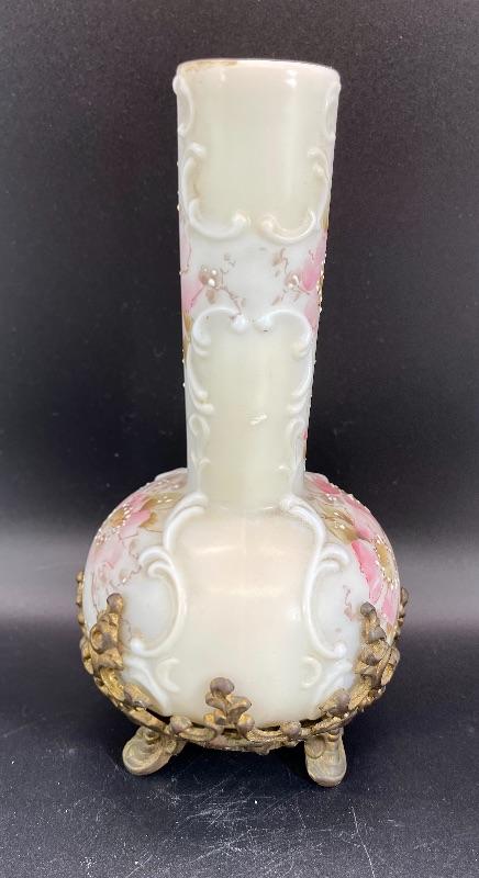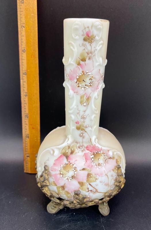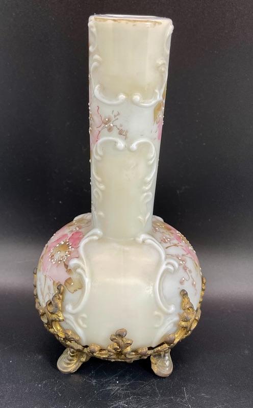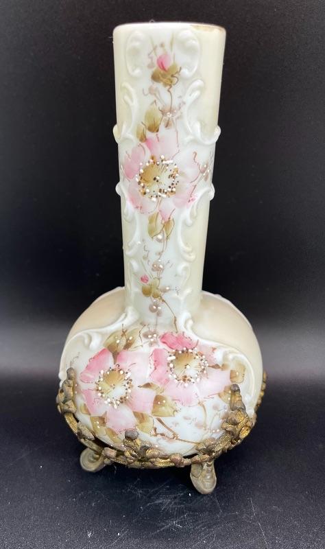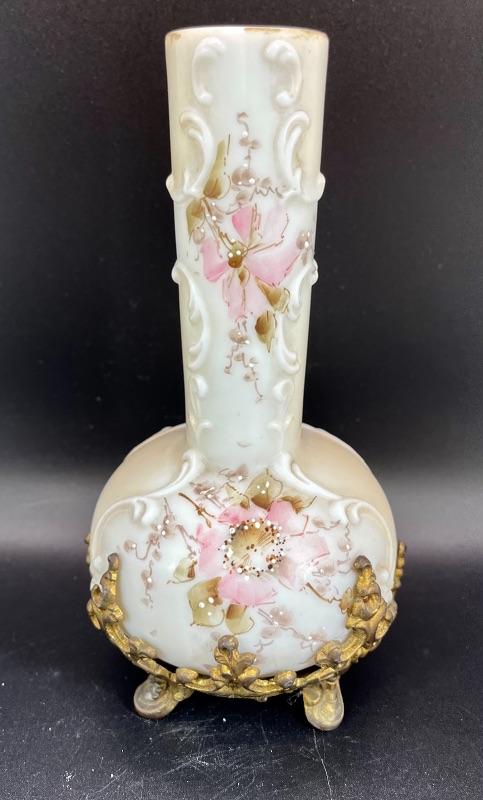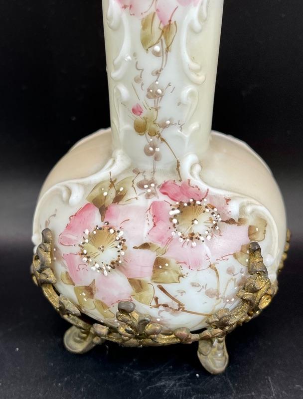 Beautiful satin glass bud vase by Wave Crest, Off white romantic Art Nouveau look with pink flowers. Gold ormolu base. Stands just under 8". Displays wonderfully. #24-20007