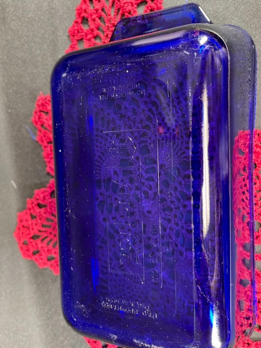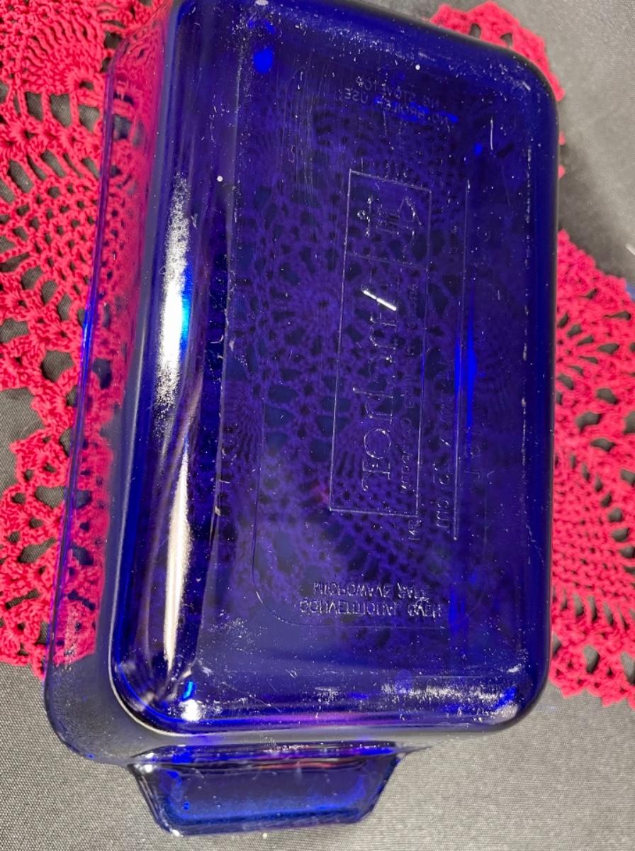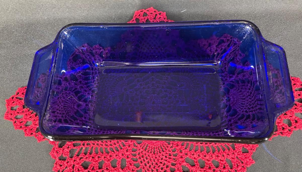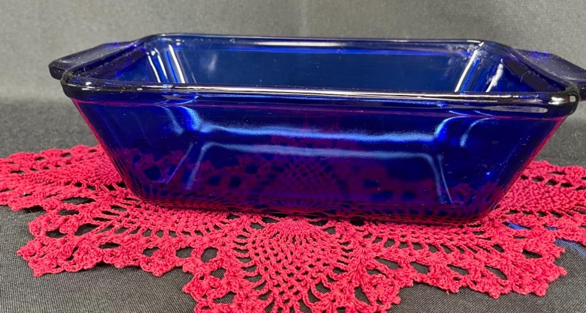 Cobalt blue glass bread loaf pan from Anchor Hocking. 5x9 size. Comes with red doily. Good condition.