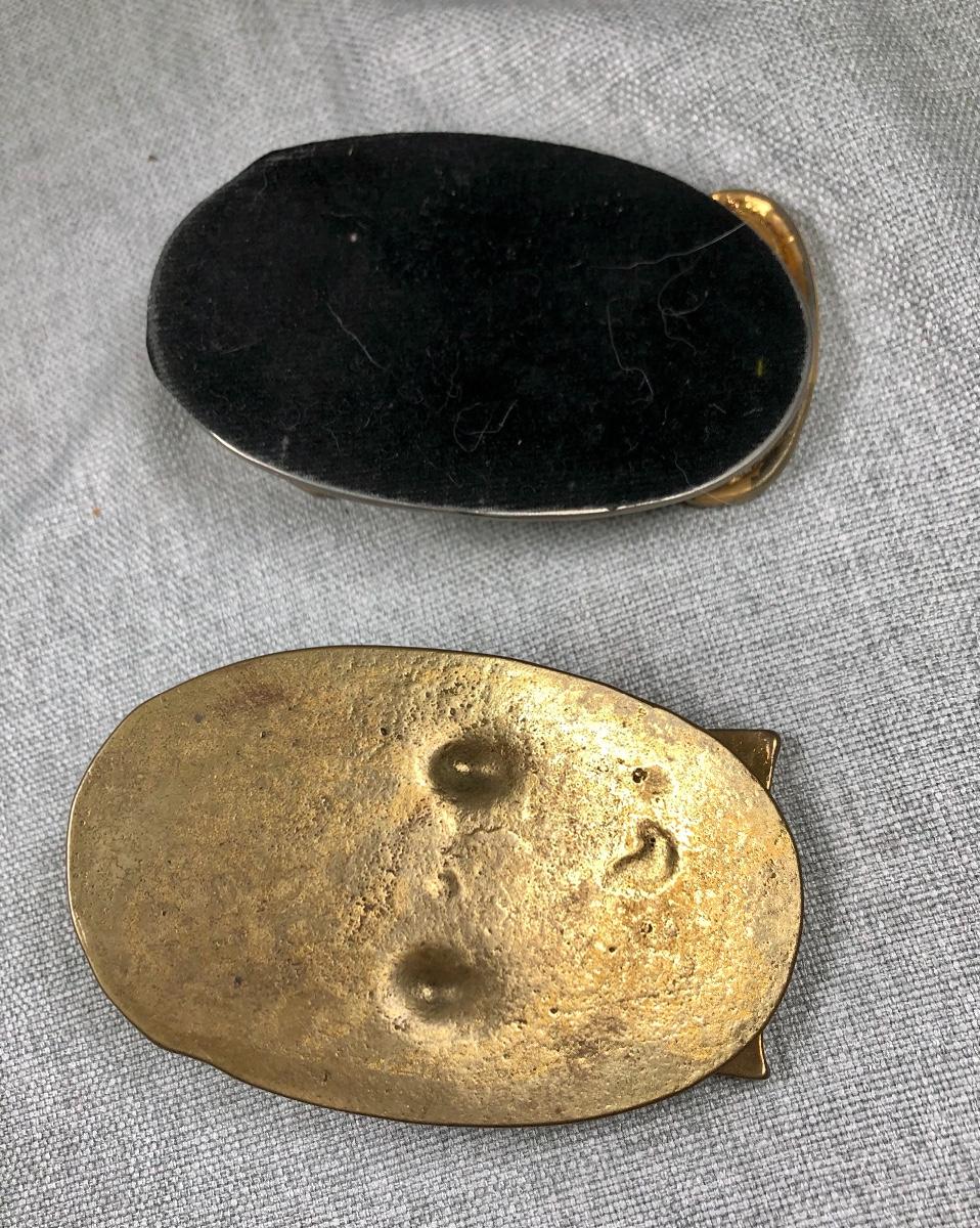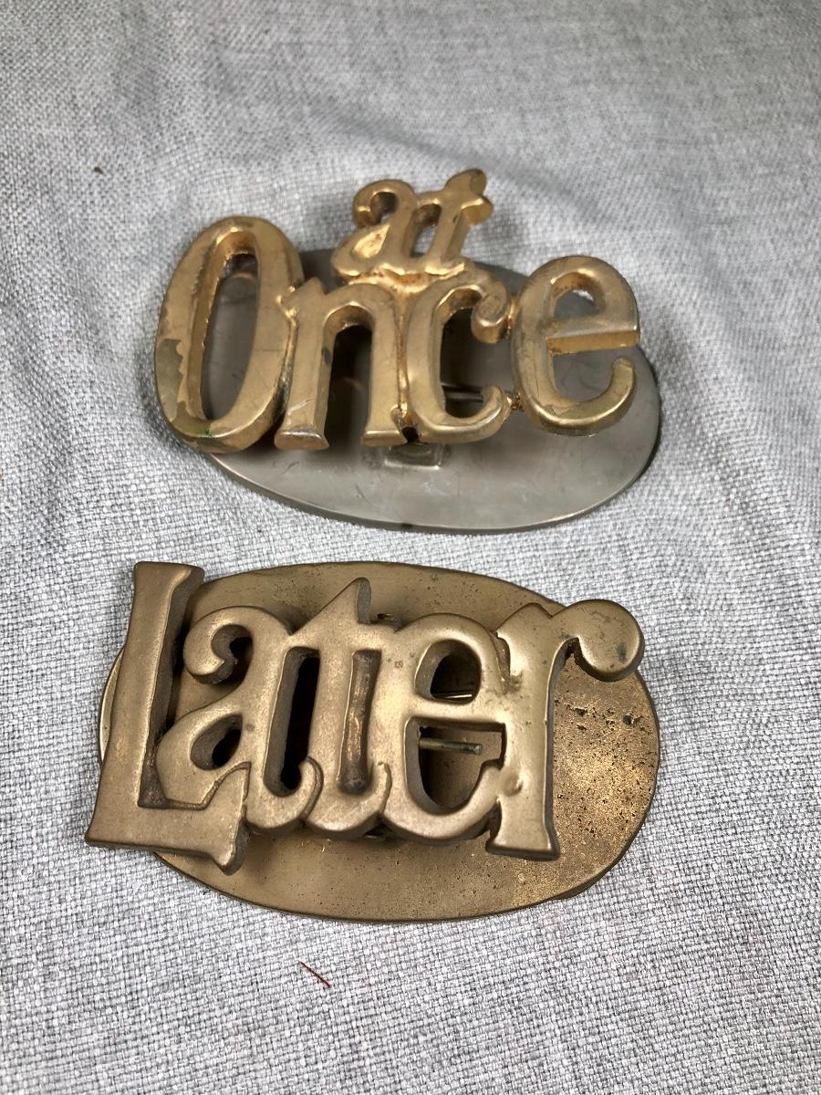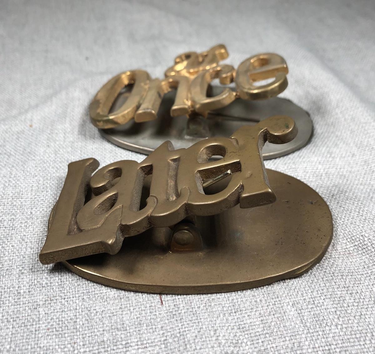 Pair of brass hinged paper clips. "At Once" and "Later" keep your papers prioritized.