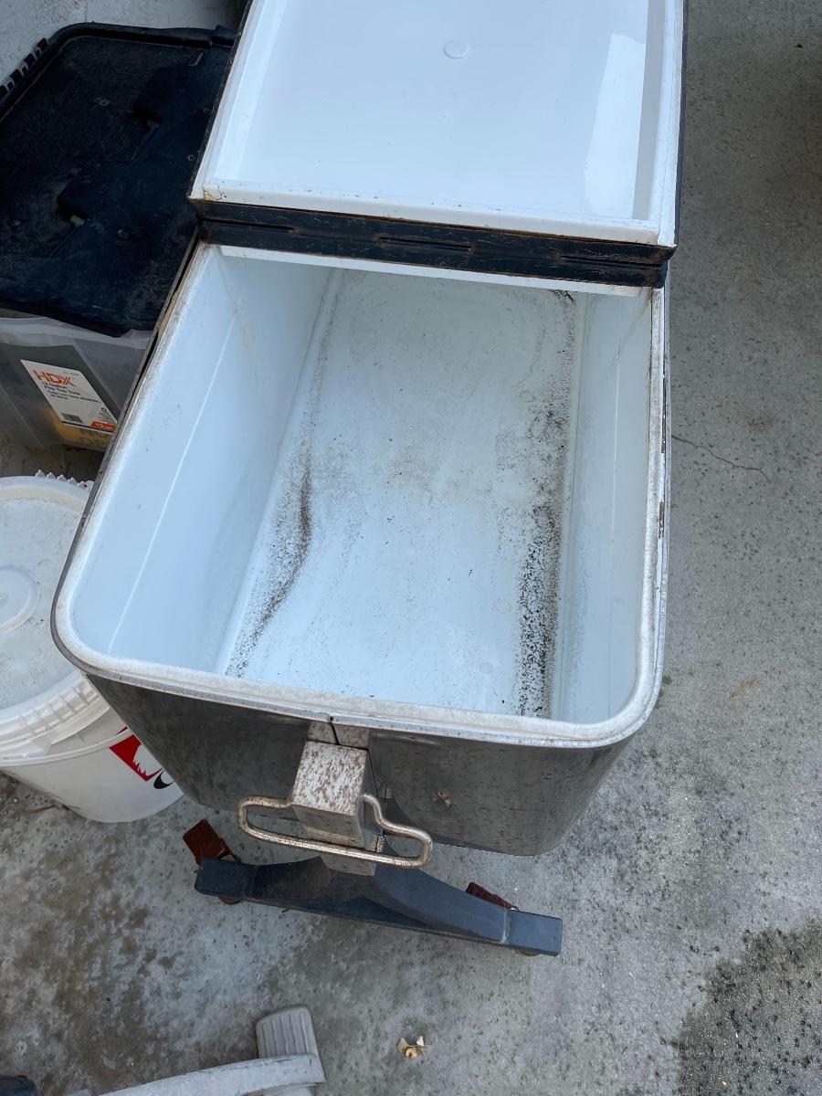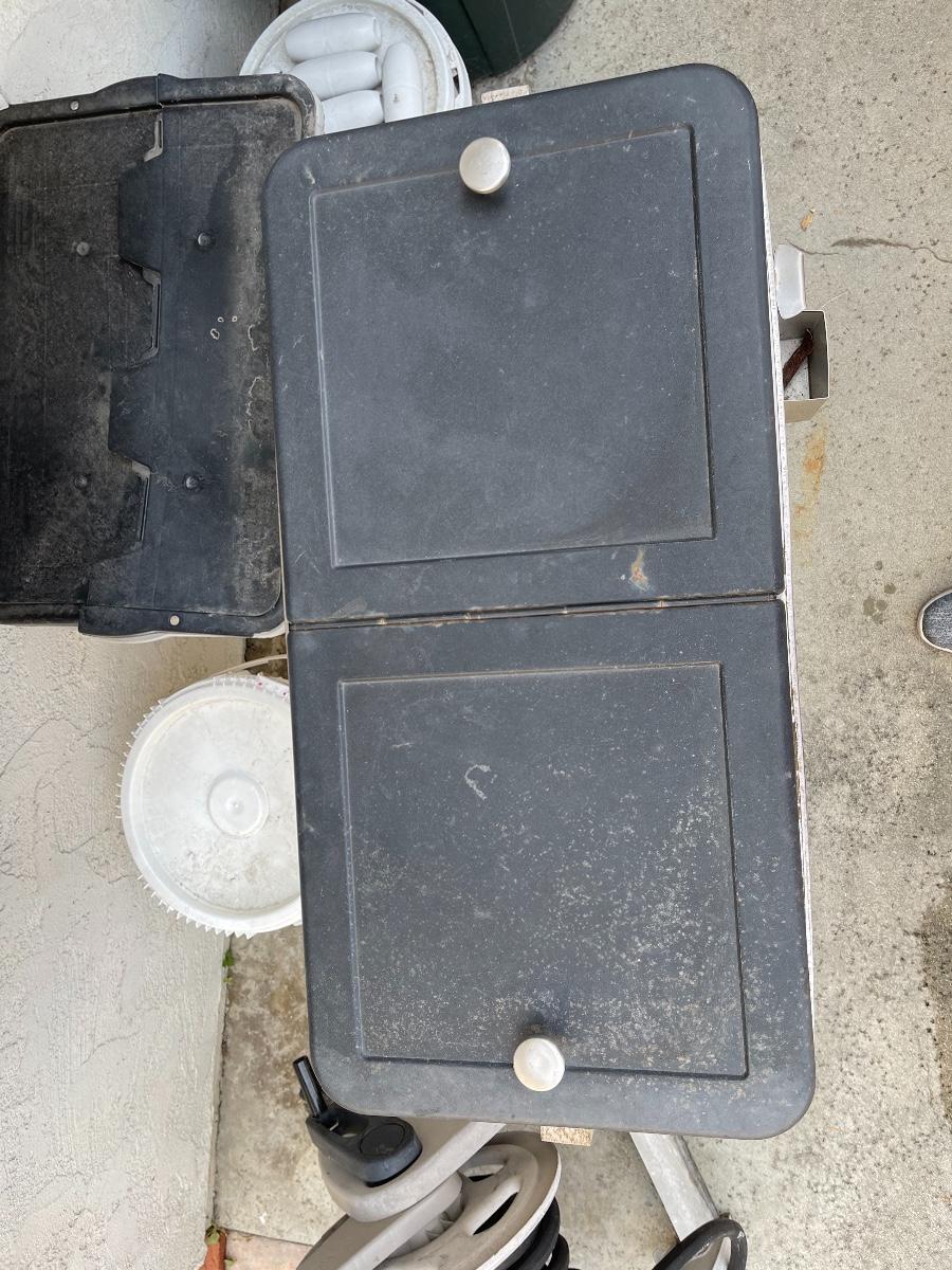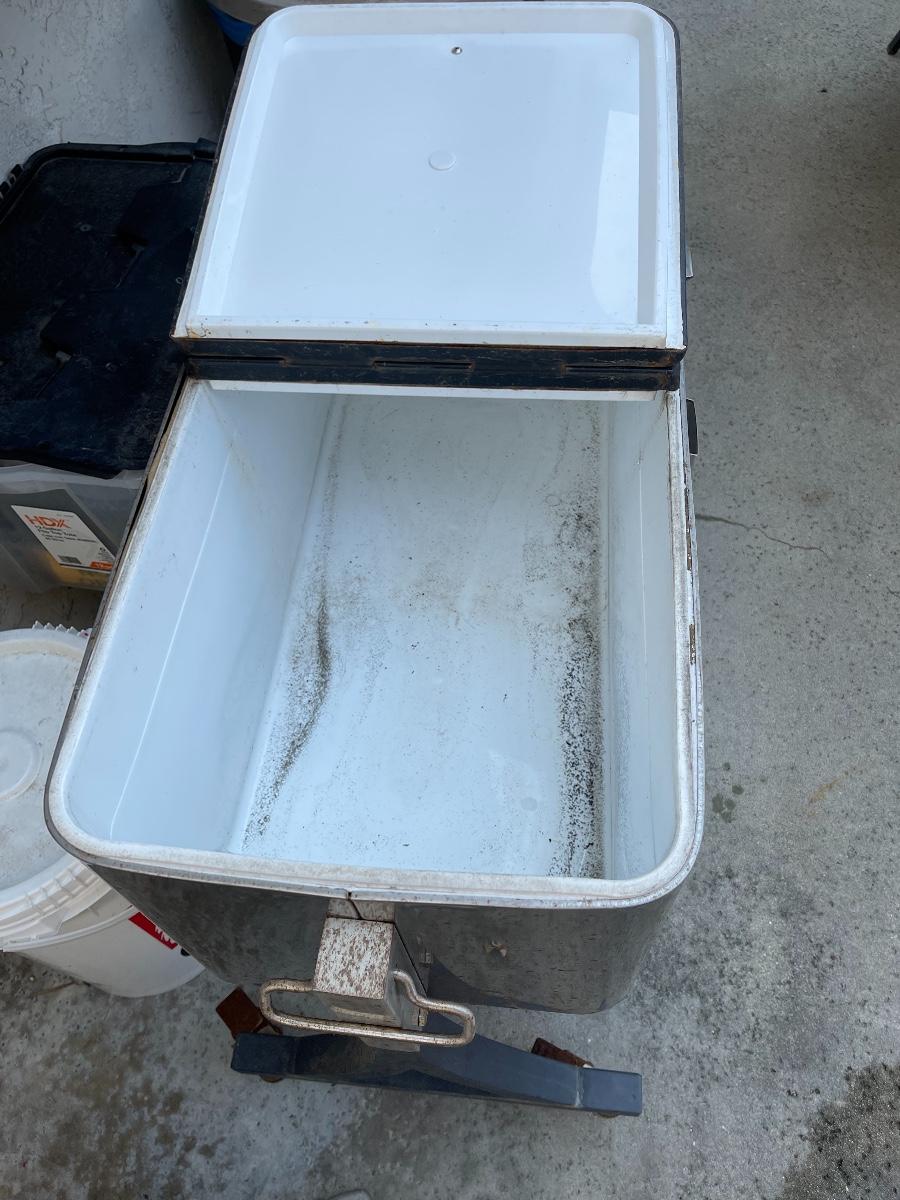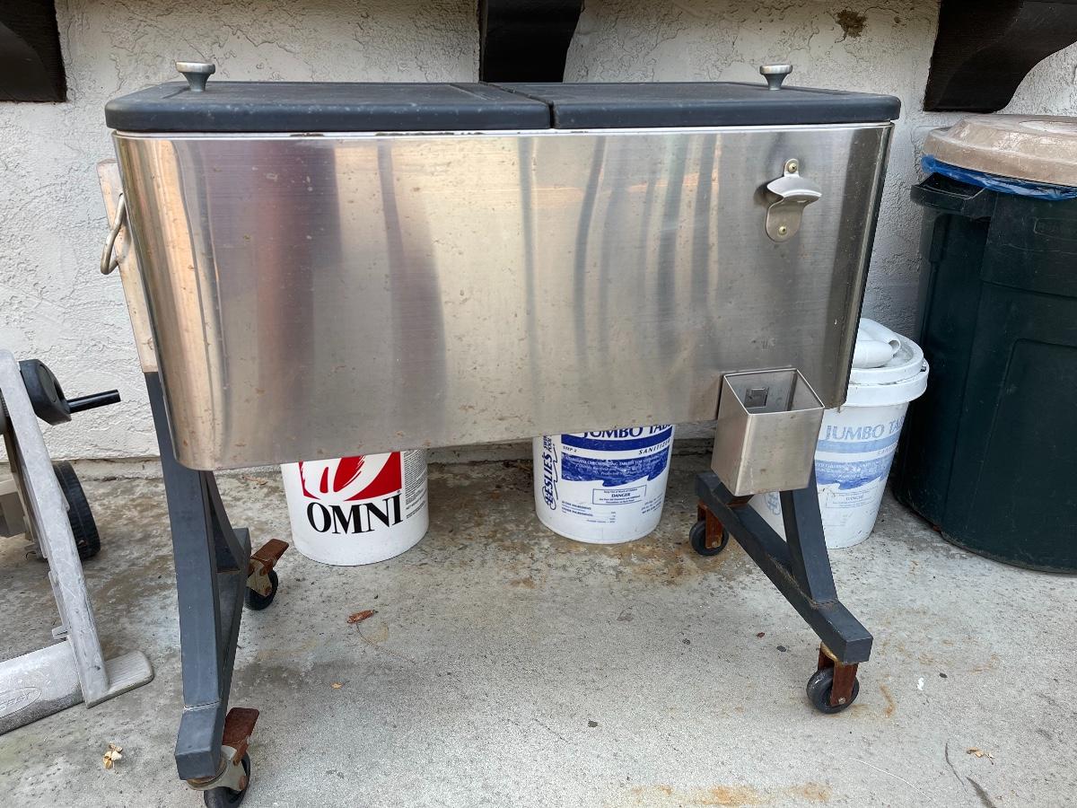 Stainless steel ice chest drink cooler. On legs with wheels. Great for the next backyard BBQ. Needs to be cleaned. Double door top and bottle opener on front. Does have signs of being outside.