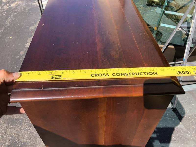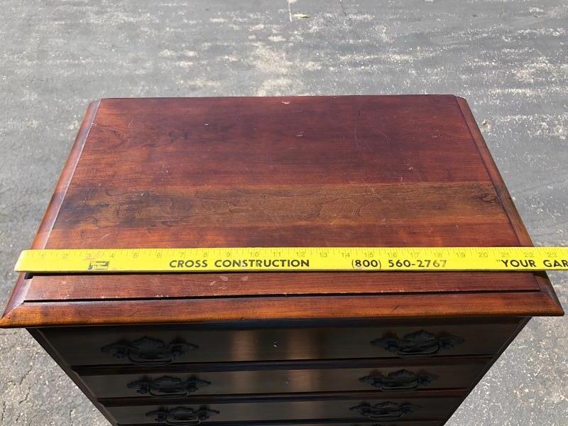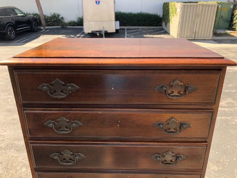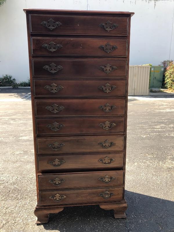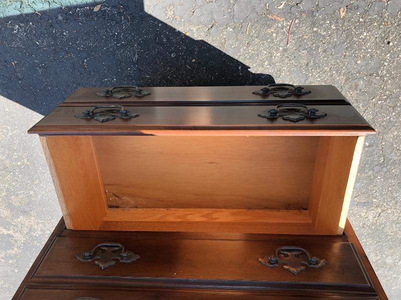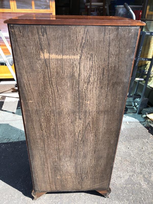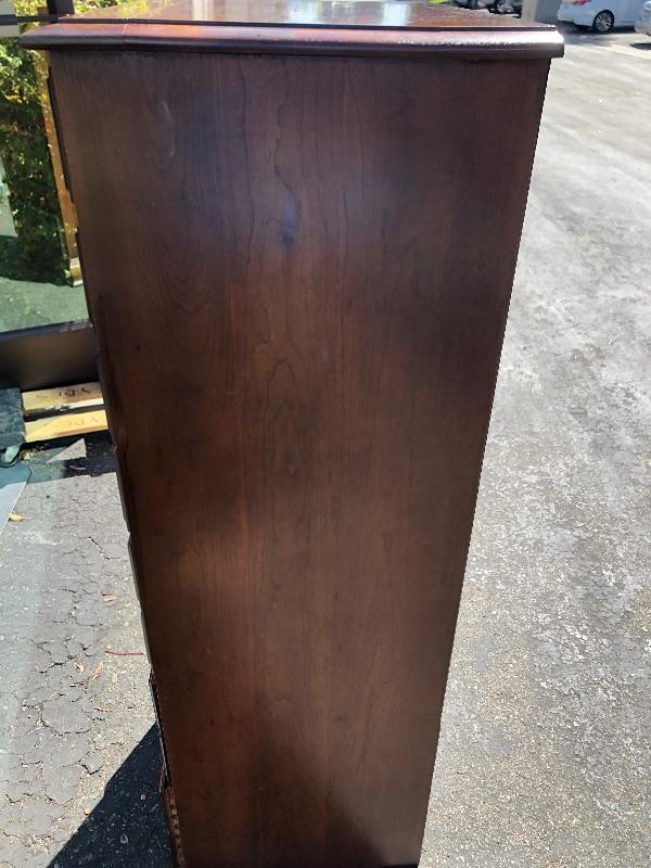 Vintage tall dresser. Dark finish wood. Stands about 4' tall. Has 6 drawers, two slim and four regular size. There is a slight split in the wood on top.